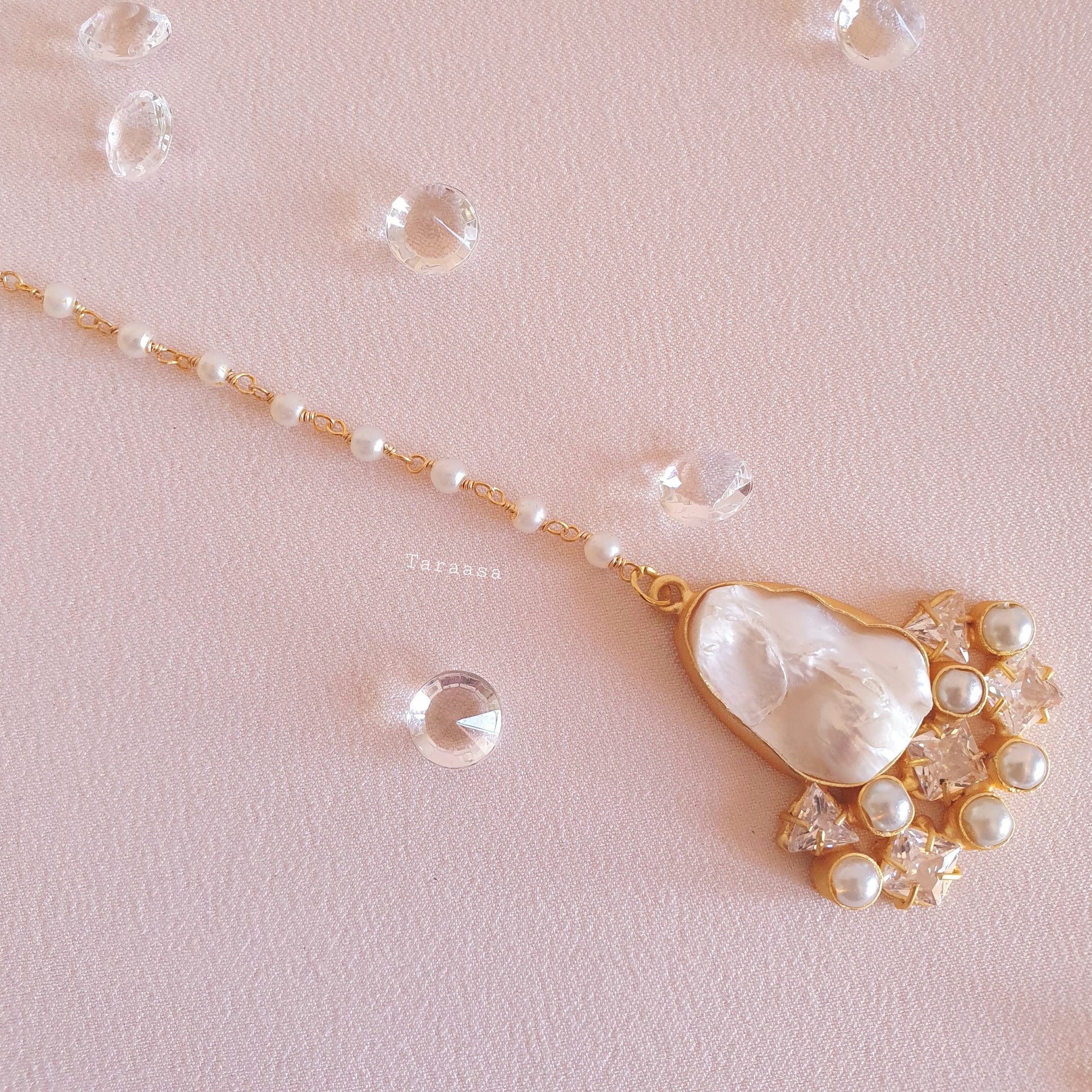 Set a luxurious matte gold, the natural white pearls simply make a statement. The tikka finished with crystals and pearls is equally beautiful. Pair it with a bracelet from our fresh water pearl range for a modern and unique look!