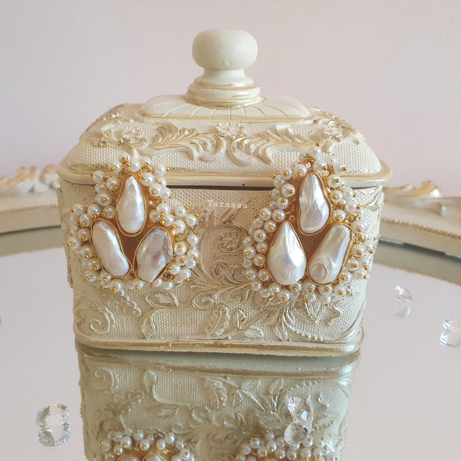 Set a luxurious matte gold, the natural white pearls simply make a statement. Pair it with a bracelet and tikka from our fresh water pearl range for a modern and unique look!