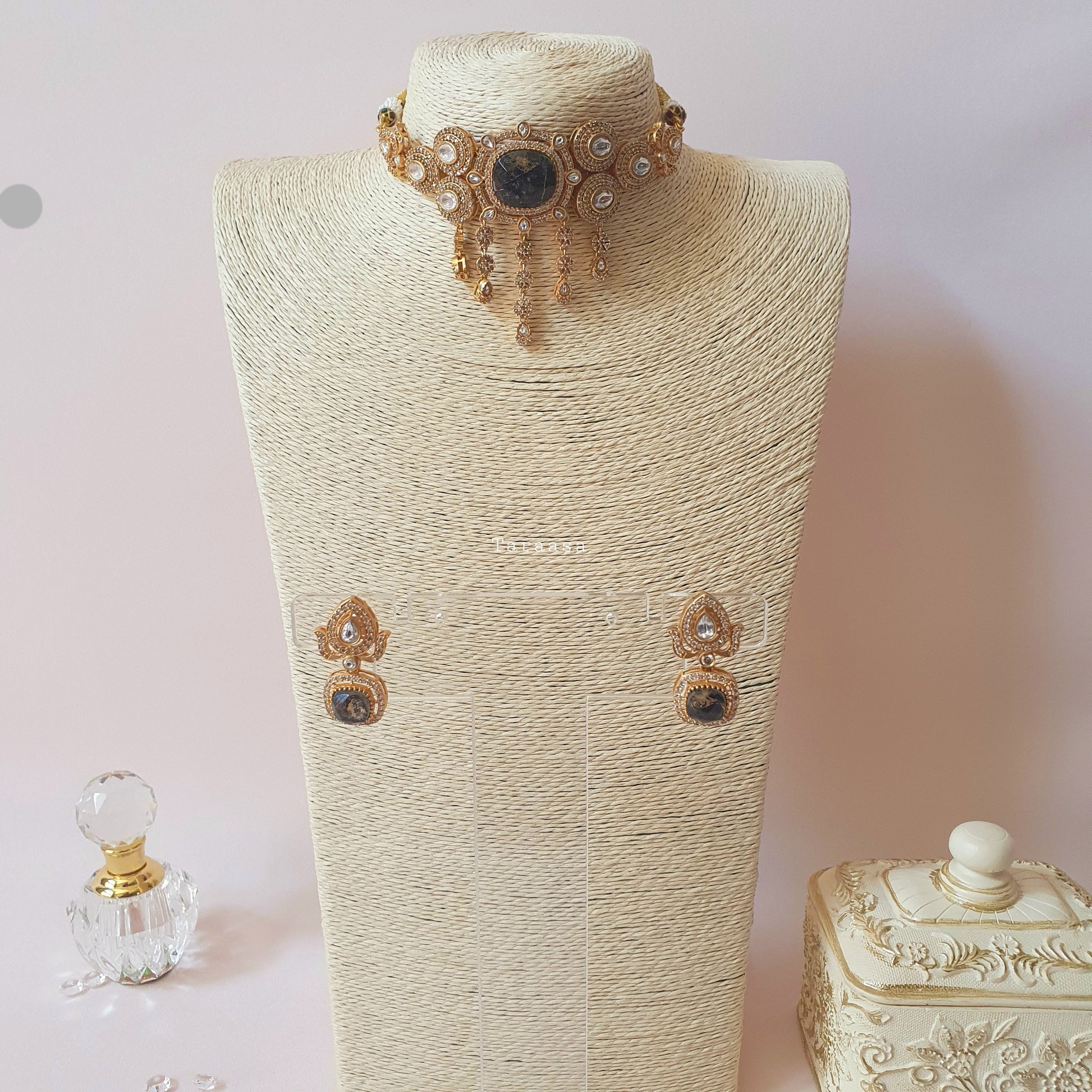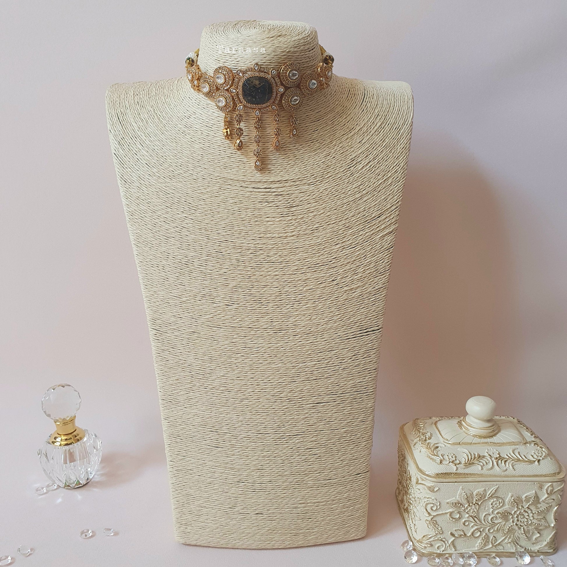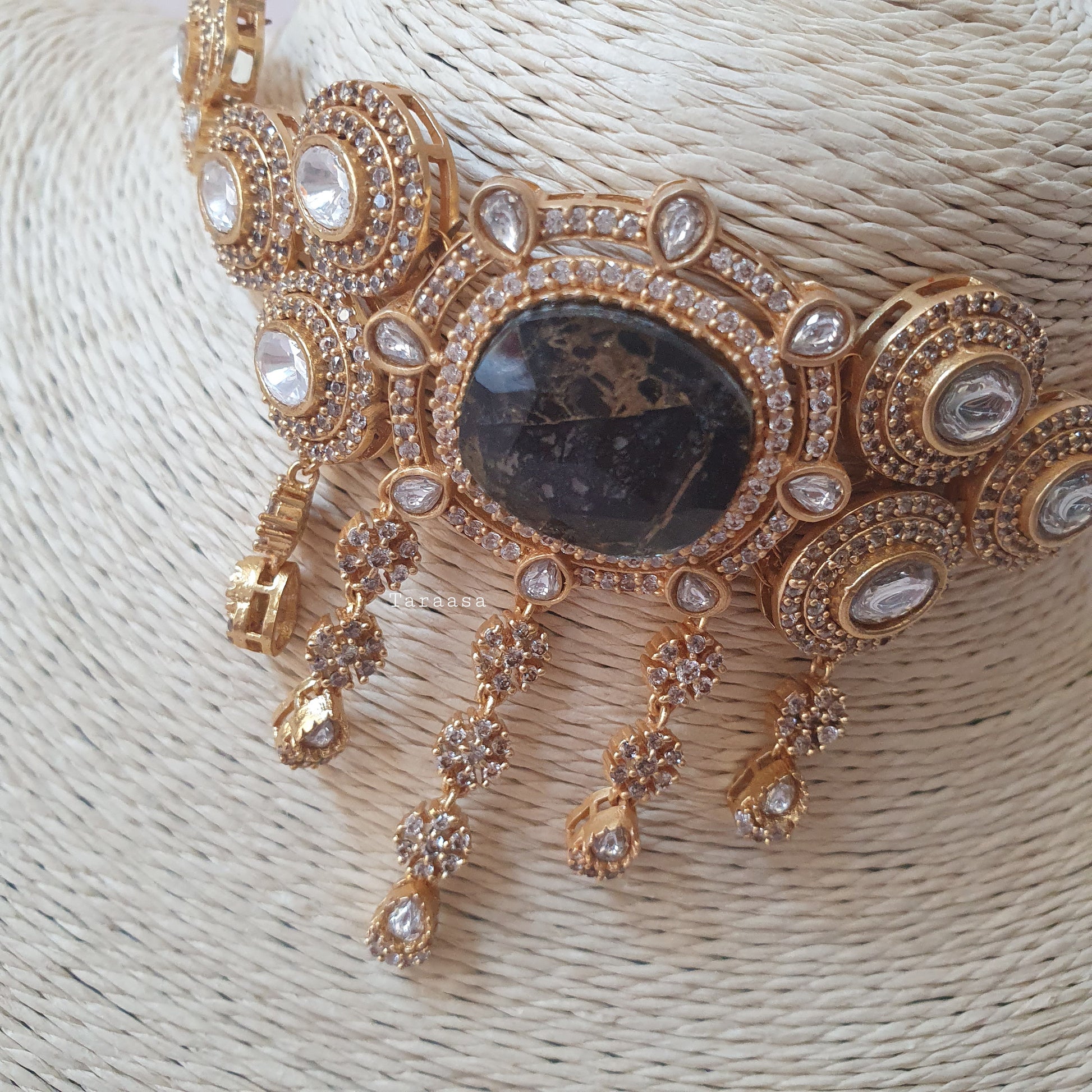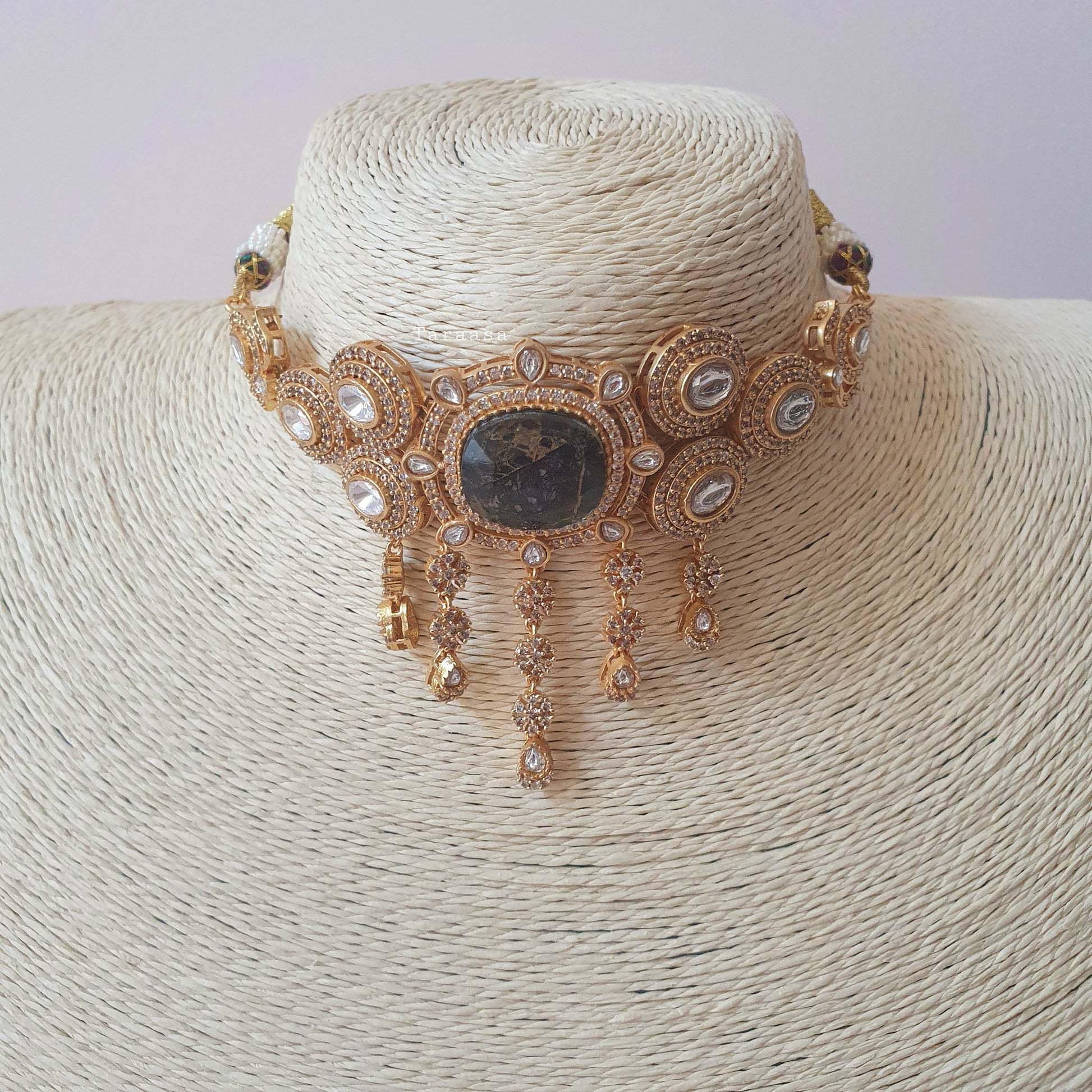 Set in luxurious gold metal, this choker features premium Kundan stones framed with sparkling cubic zirconia, all anchored by a striking black firestone centerpiece. The matching earrings offer a classic, traditional touch that beautifully completes the look. A statement set guaranteed to turn heads.
