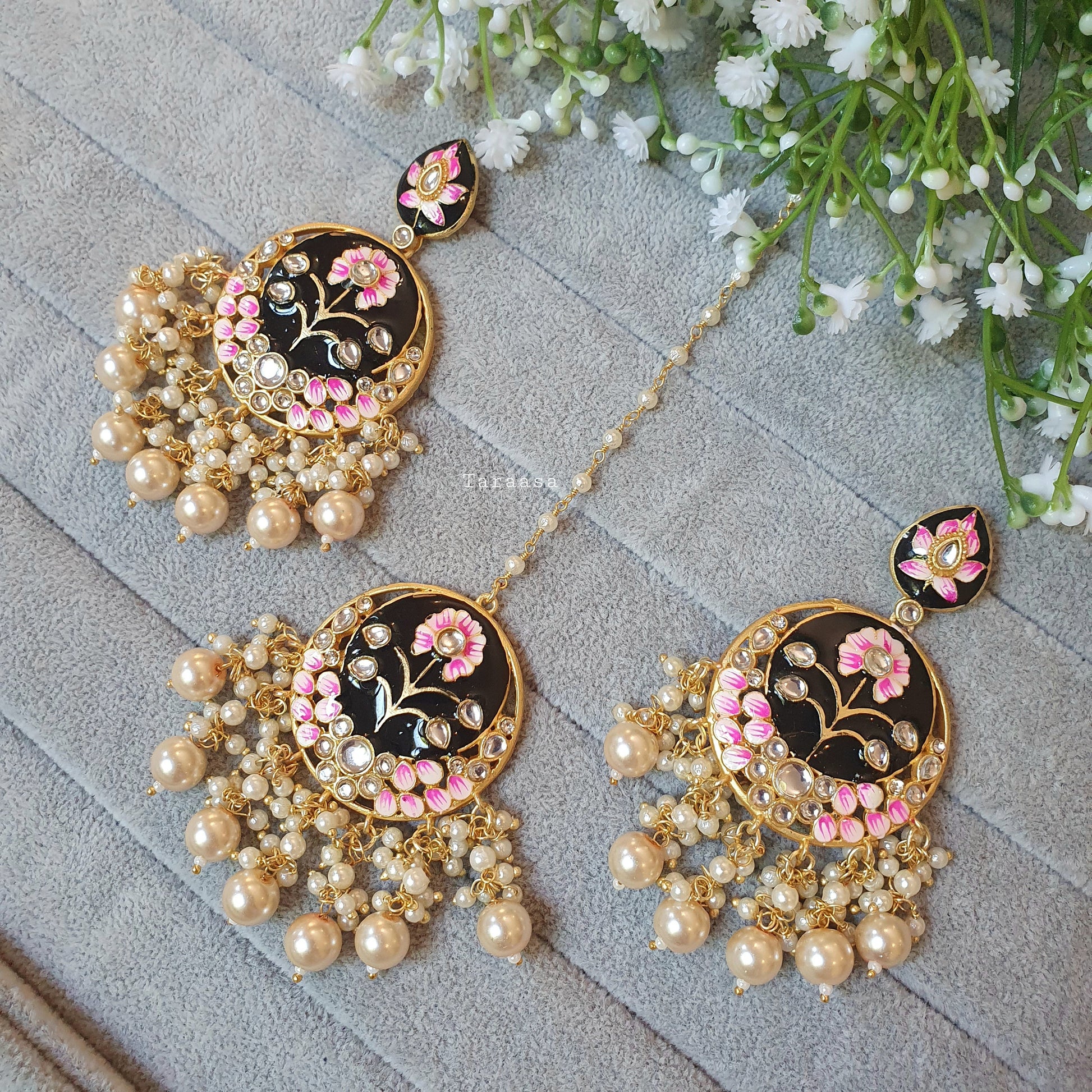 An artful harmony of meenakari, kundan stones and elegant pearls will have you feeling whimsical and extravagant in this grand earring and tikka set.