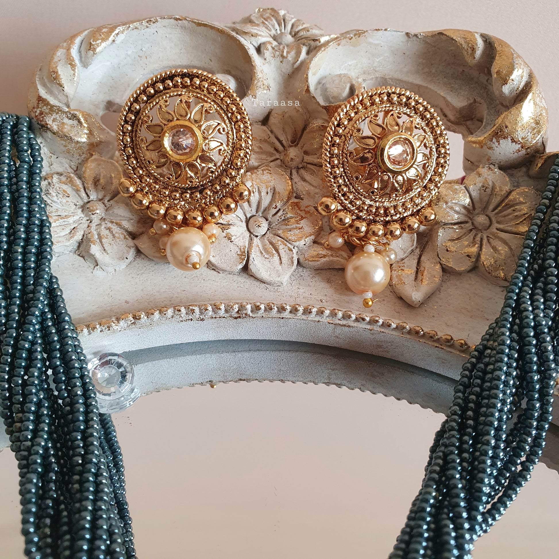 Elegantly beaded chains in a dark metallic blue, with a statement pendant and matching earrings. A versatile set for an eastern or western look.