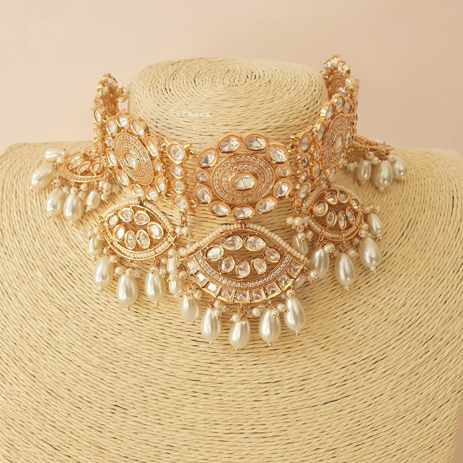 Dripping in pure opulence, this is our most luminous kundan creation to date — a captivating fusion of artistry and allure. Set in luxurious gold, the design showcases a distinctive evil eye motif, adorned with the finest kundan work and finished with delicate pearl drops that enchant with every glance.