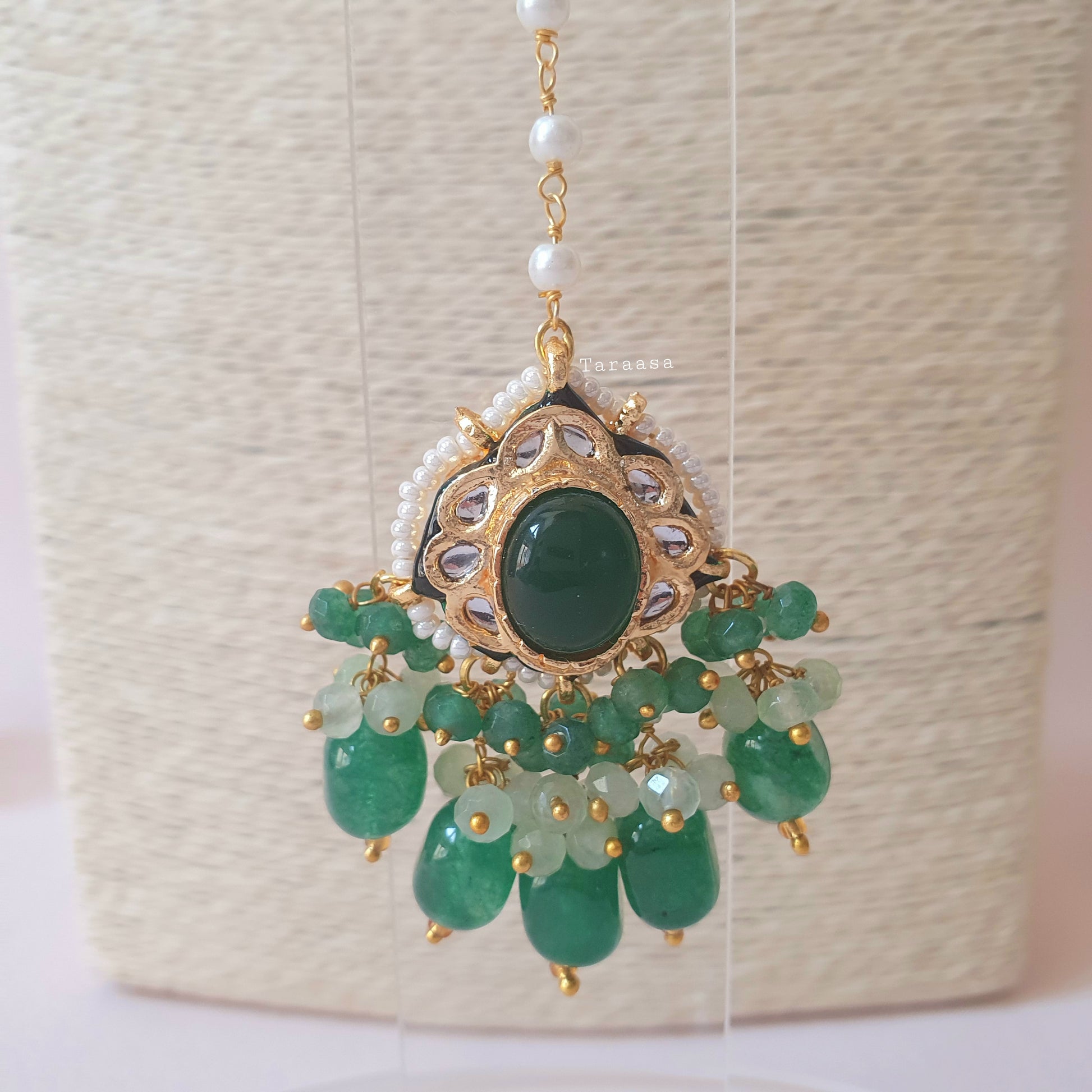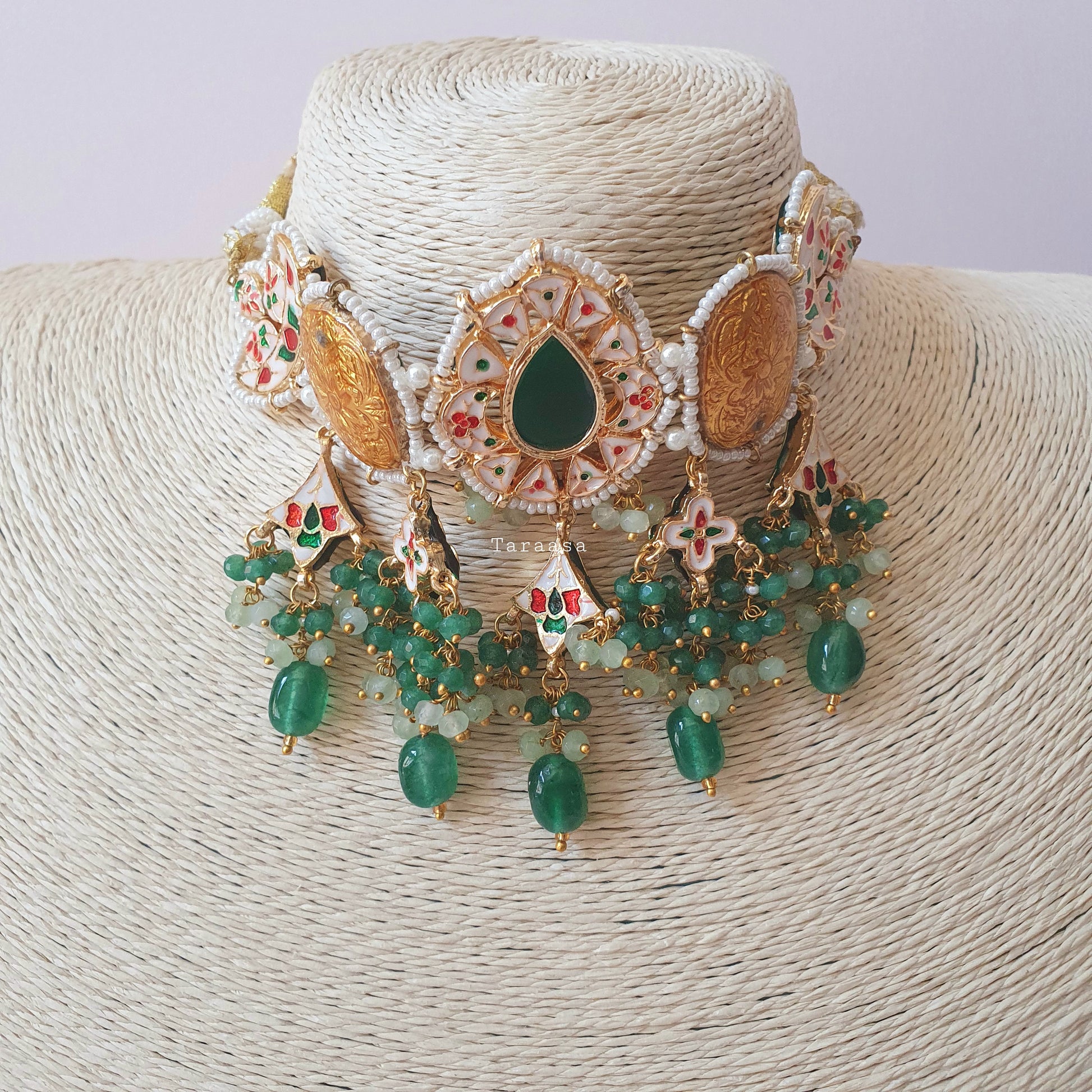 An opulent emerald and pista choker set that beautifully blends artistry with grandeur. The design features alternating kundan pieces etched in gold and a beautiful emerald and pista meenakari pieces each accented with sparkling kundan stones. At the heart of the choker lies a captivating emerald monalisa stone, encircled by radiant kundan stones. The choker is finished with delicate drops of kundan, emerald, and pista crystal beads, adding graceful movement and shimmer.