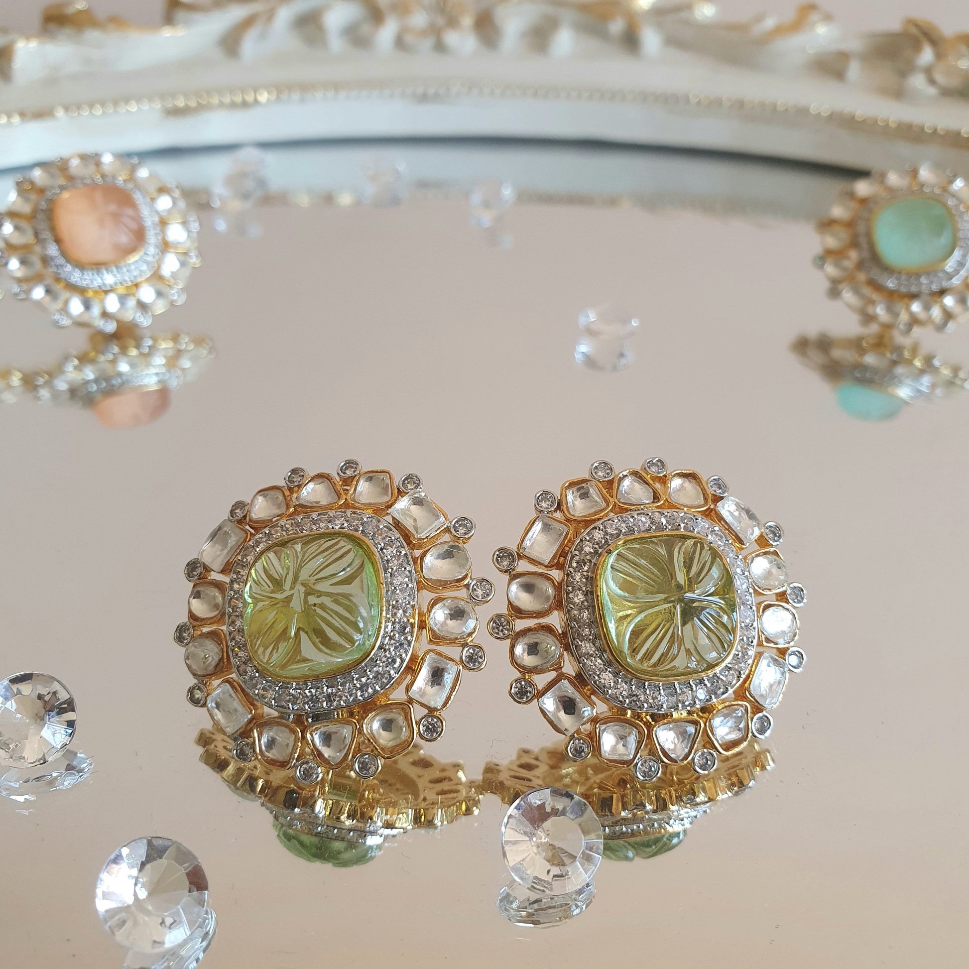 Our applegreen over-sized stud earrings will be the prettiest jewels in your collection! These classic, versatile studs features an engraved glass stones, surrounded by diamantes and kundan stones, finished in 18K gold plating.