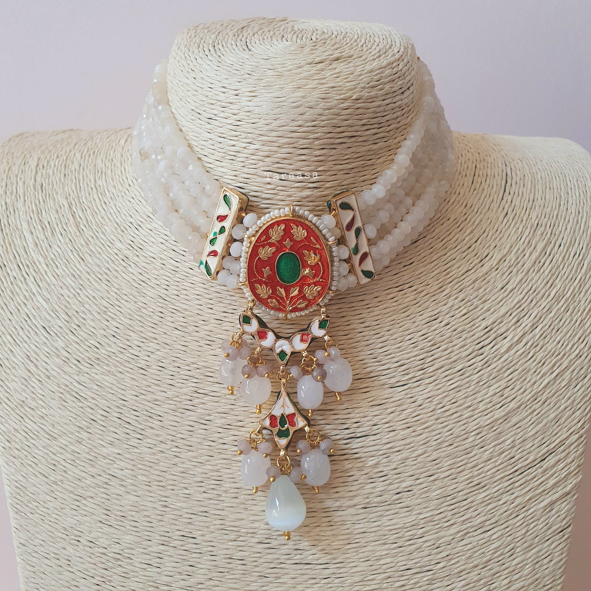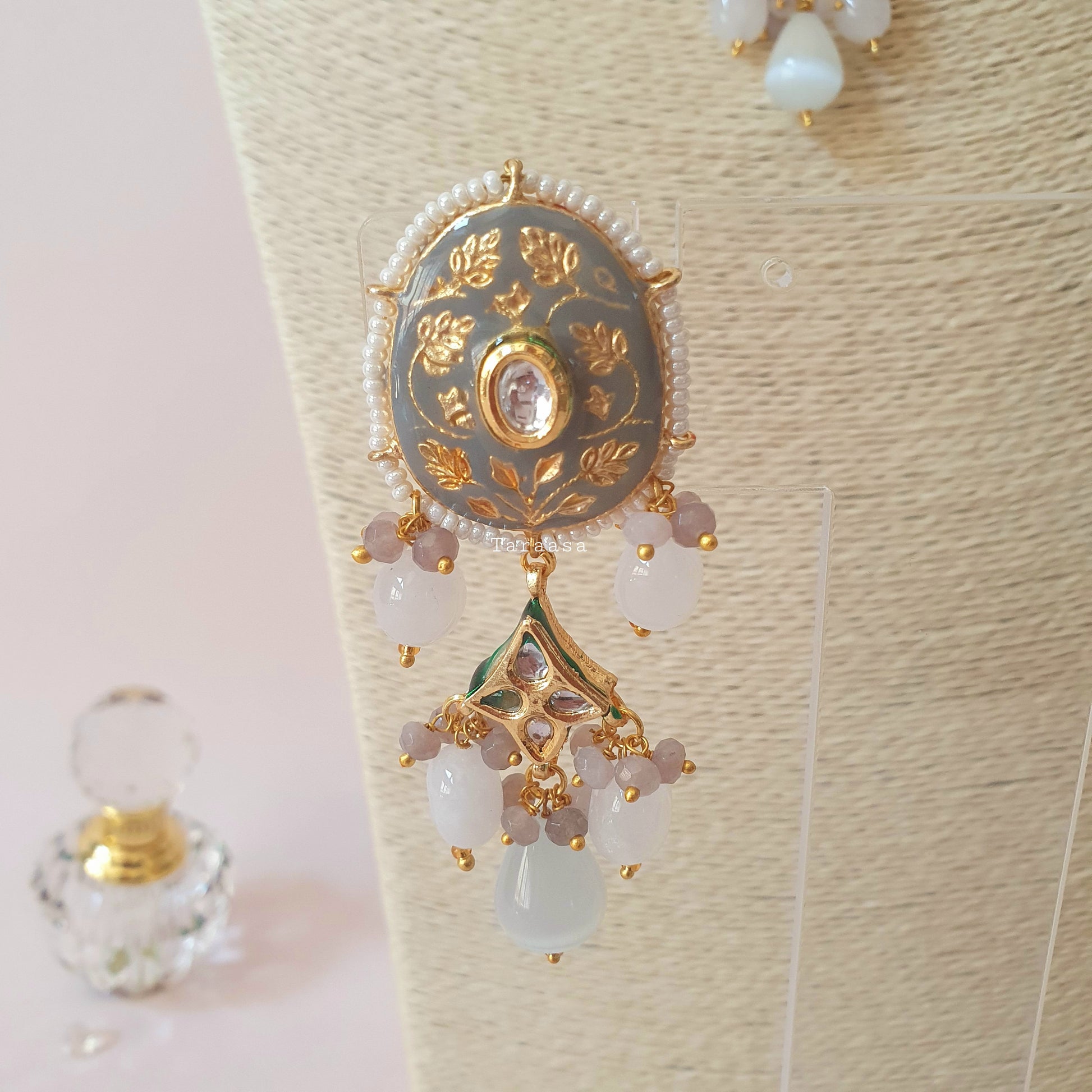 At the centre lies a refined fusion of sparkling kundan and a beautifully hand-painted grey meenakari pendant—an artistic focal point that balances tradition with modern minimalism. Finishing the piece is a delicate cascade of grey and white crystal beads, adding gentle motion and a touch of shimmering contrast.