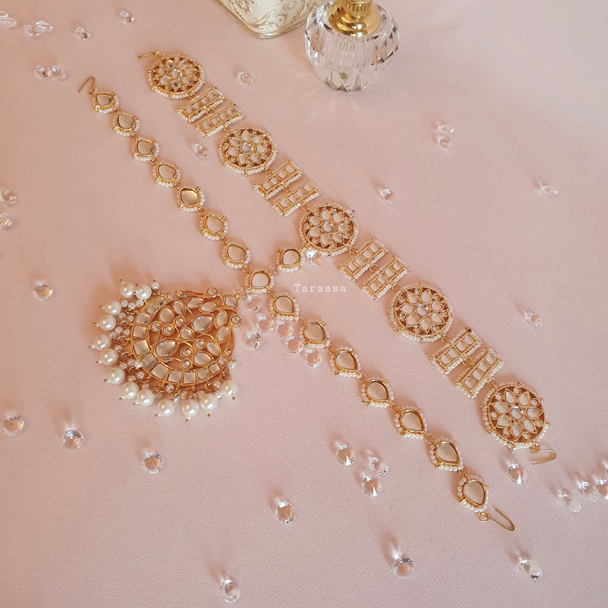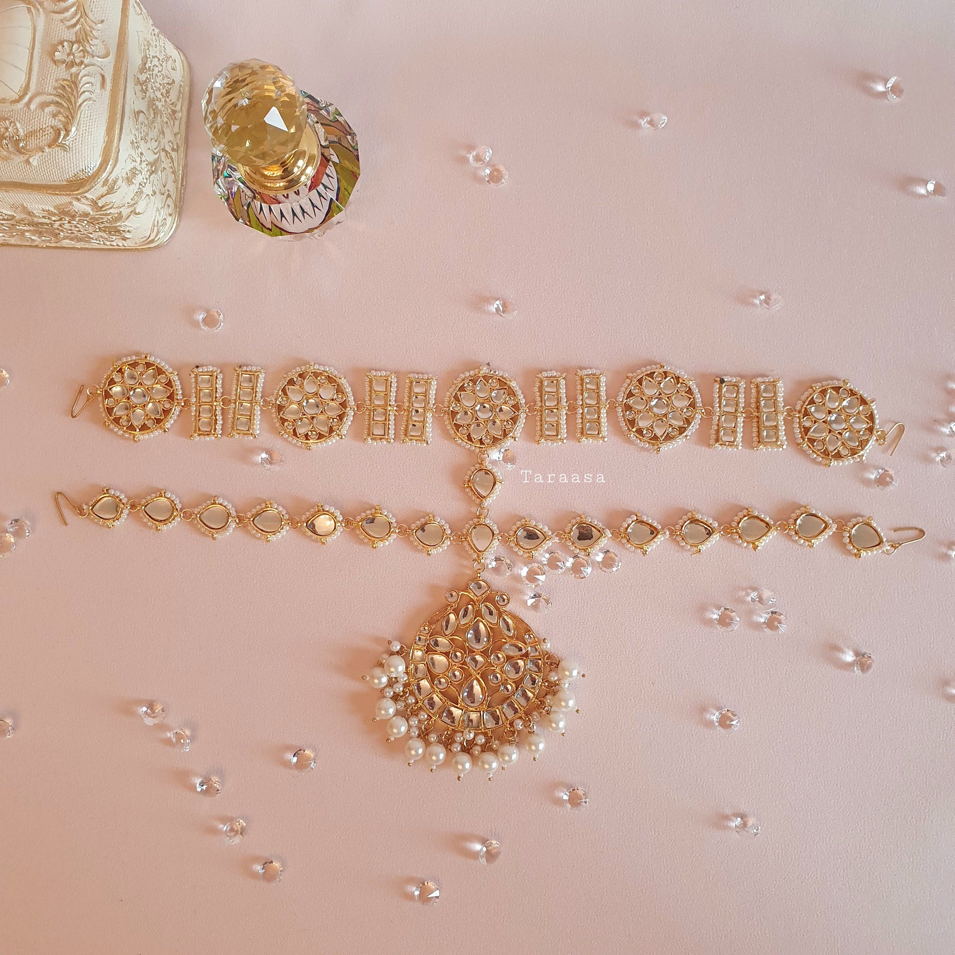Our ornate damini will have you looking and feeling like the absolute queen that you are! Brilliant kundan stones are set in rich gold and edged with tiny pearls elevating the beauty of this piece. The sheeshphools meet an exquisite maang tikka that is finished with drops of pearls. A truly spectacular headpiece for that regal look!