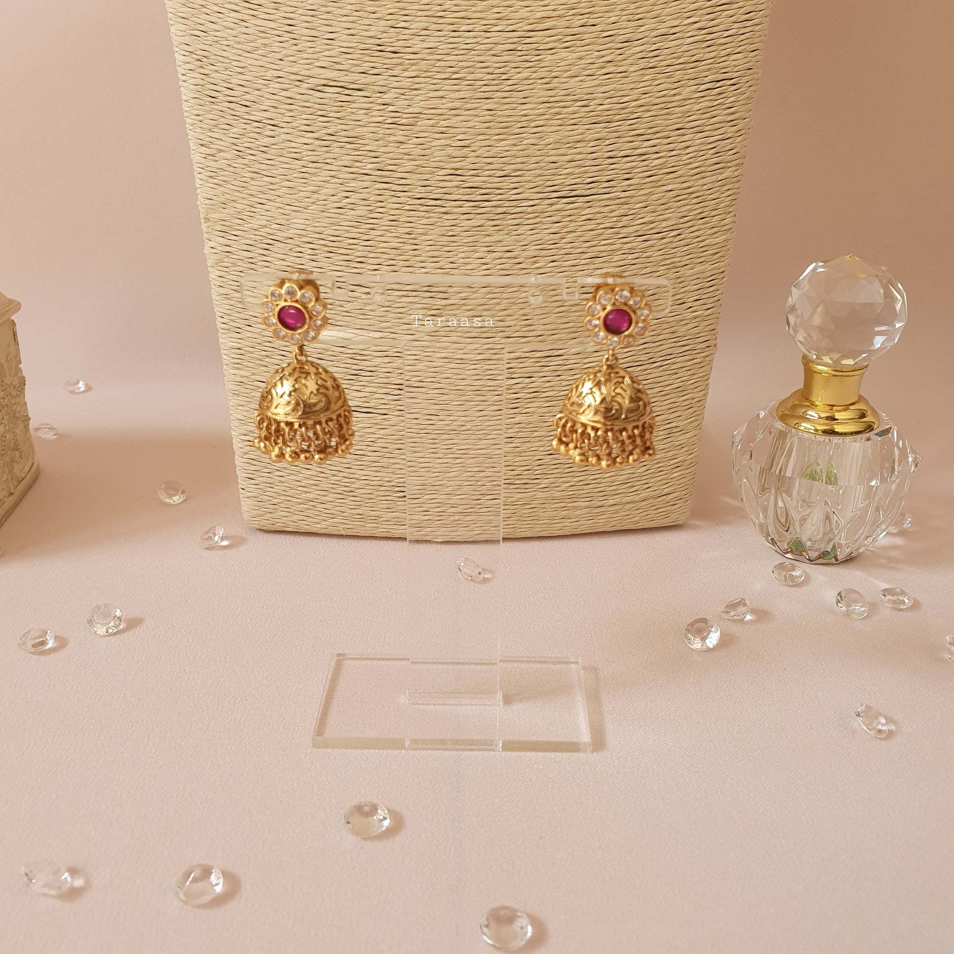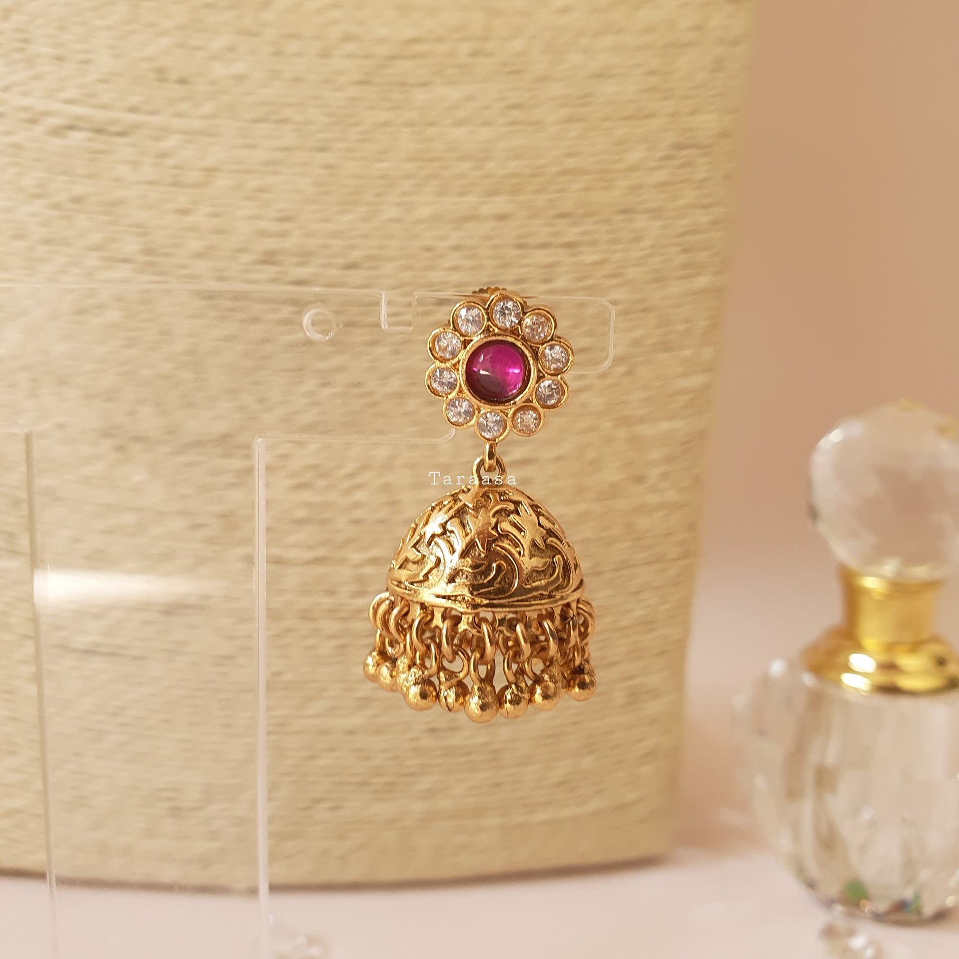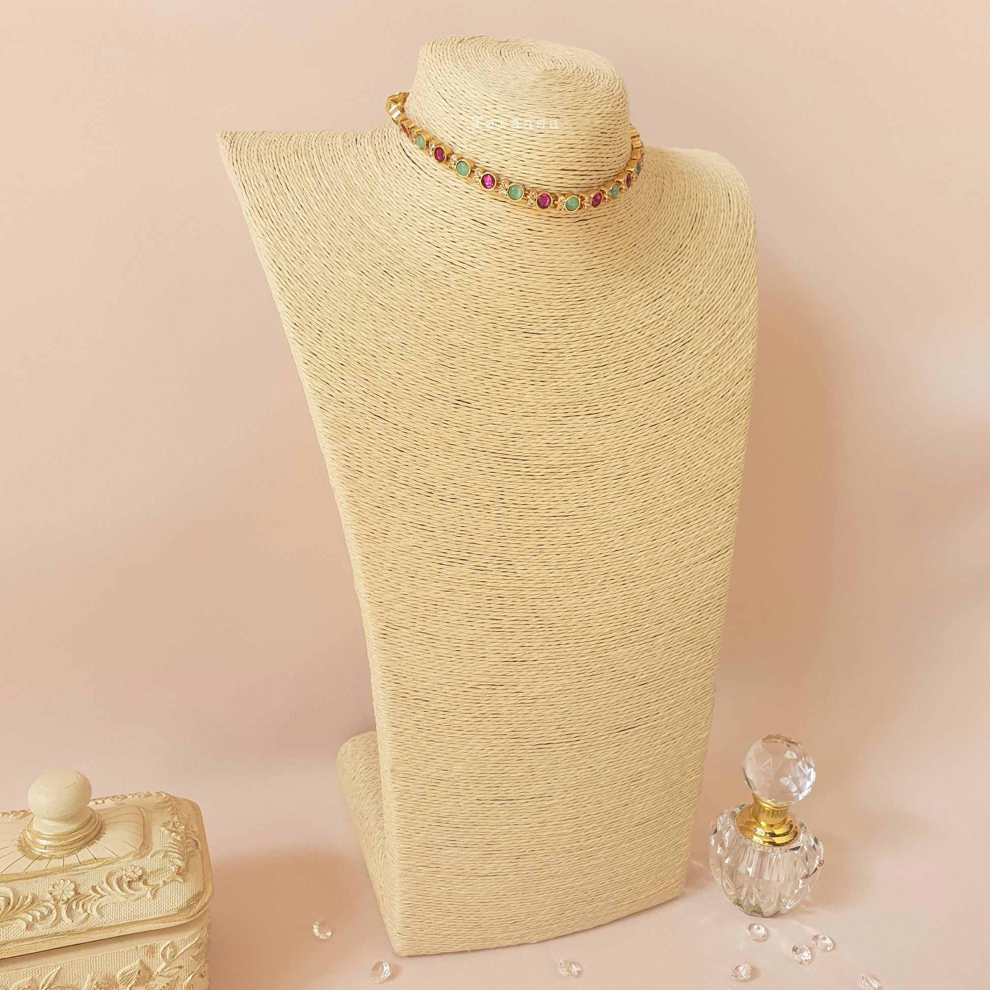 Delicate yet captivating, this set strikes the perfect balance between simplicity and elegance. A single row of glistening cerise and turquoise glass stones creates a minimal, sophisticated silhouette — effortlessly chic. Paired with charming jhumkis, it’s a versatile beauty that can shine solo or layer seamlessly with other favourites.