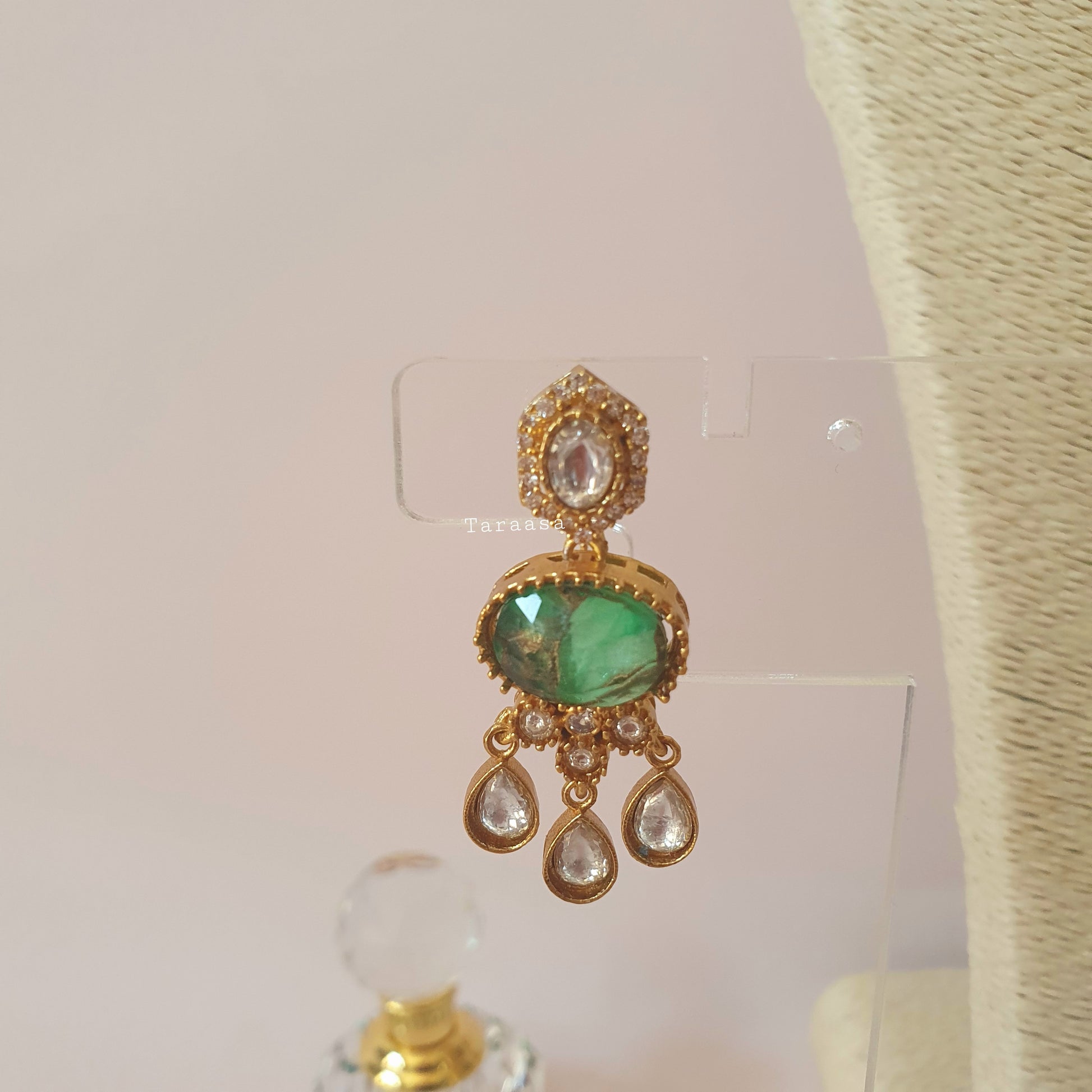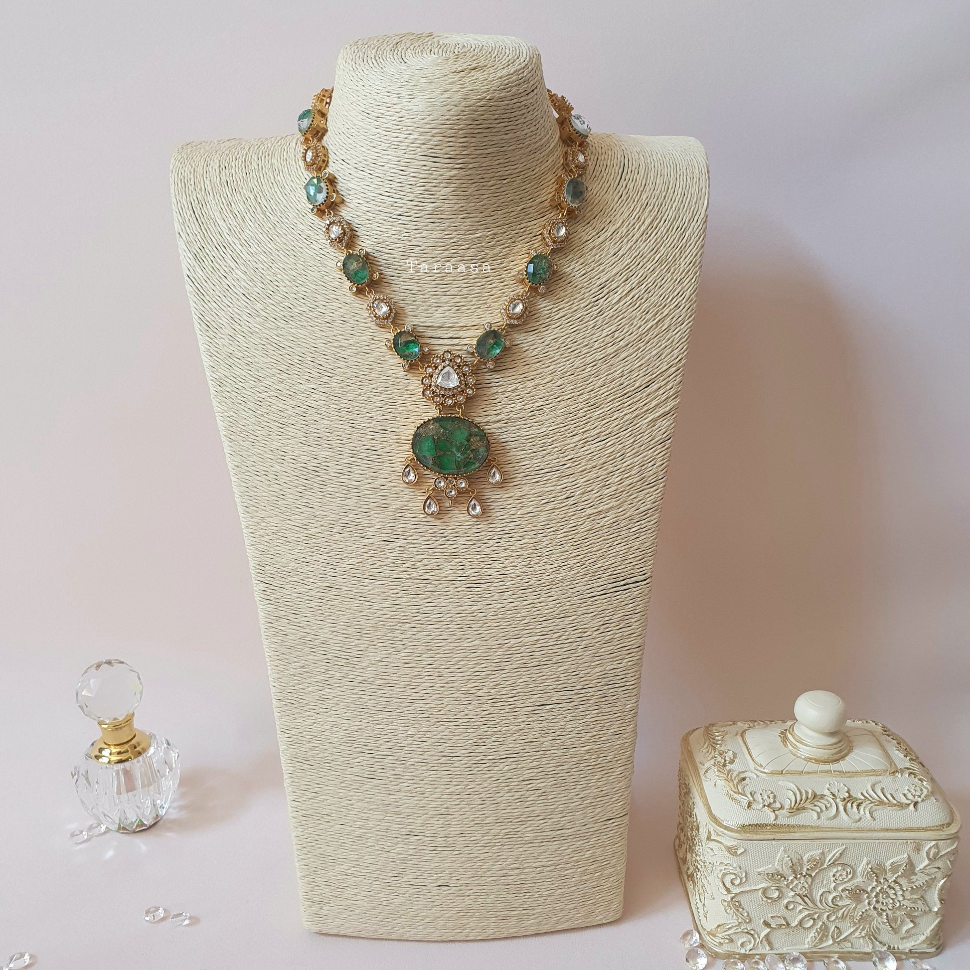 Set in luxurious gold metal, this necklace features premium Kundan stones framed with sparkling cubic zirconia, and alternating emerald firestones all anchored by a striking centerpiece. The matching earrings offer a classic, traditional touch that beautifully completes the look.