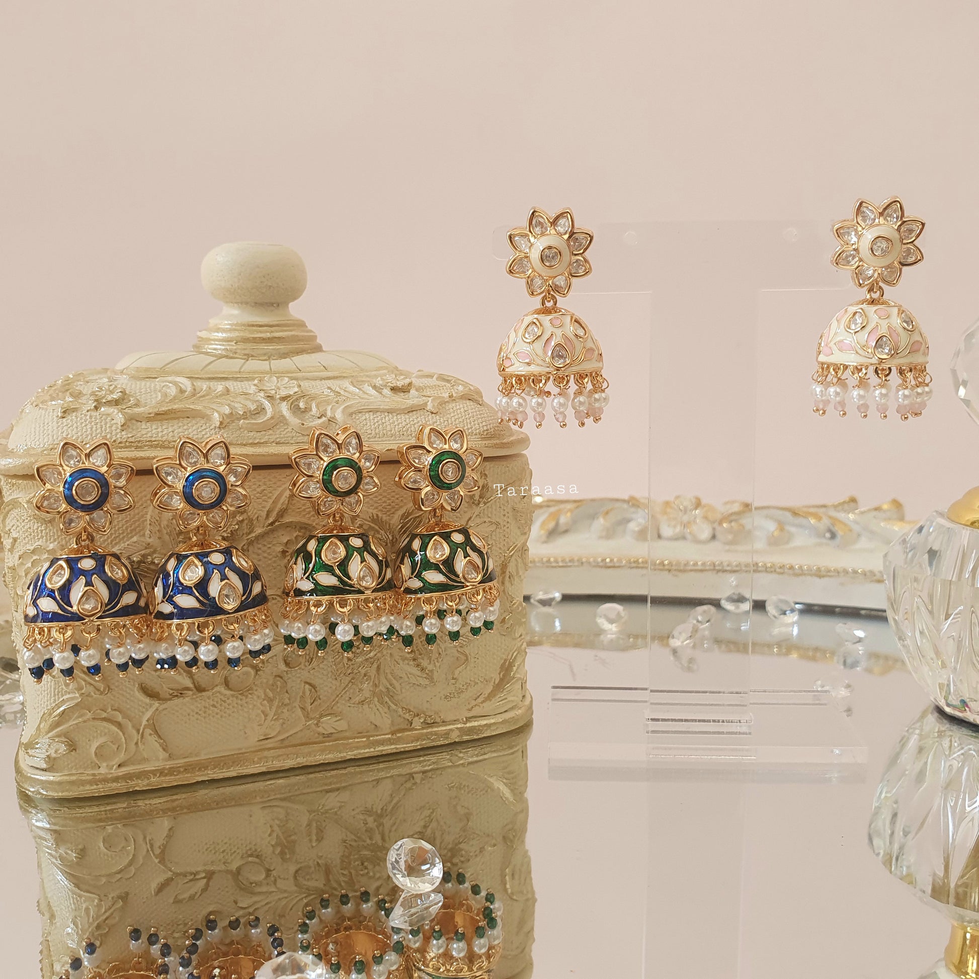 These luxury hand-painted Meenakari jhumkis are where tradition becomes haute couture. Each dome is a canvas of vibrant enamel artistry, kissed with intricate detailing that echoes royal frescoes. Cascading below, lustrous pearl drops sway like moonlit chandeliers, while radiant Kundan stones crown the design in regal brilliance