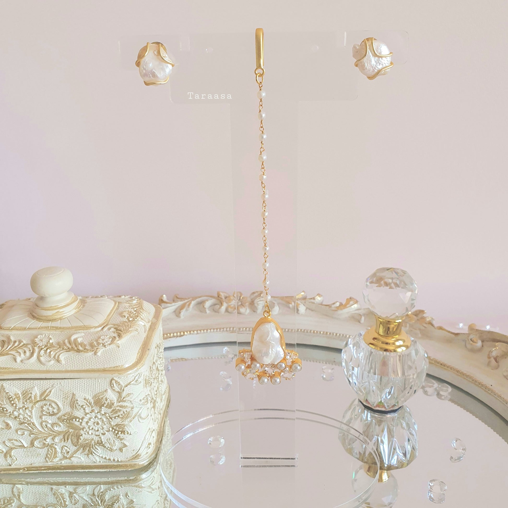 An eternal beauty, this fresh water pearl earrings and tikka is a modern translation of indian jewellery!