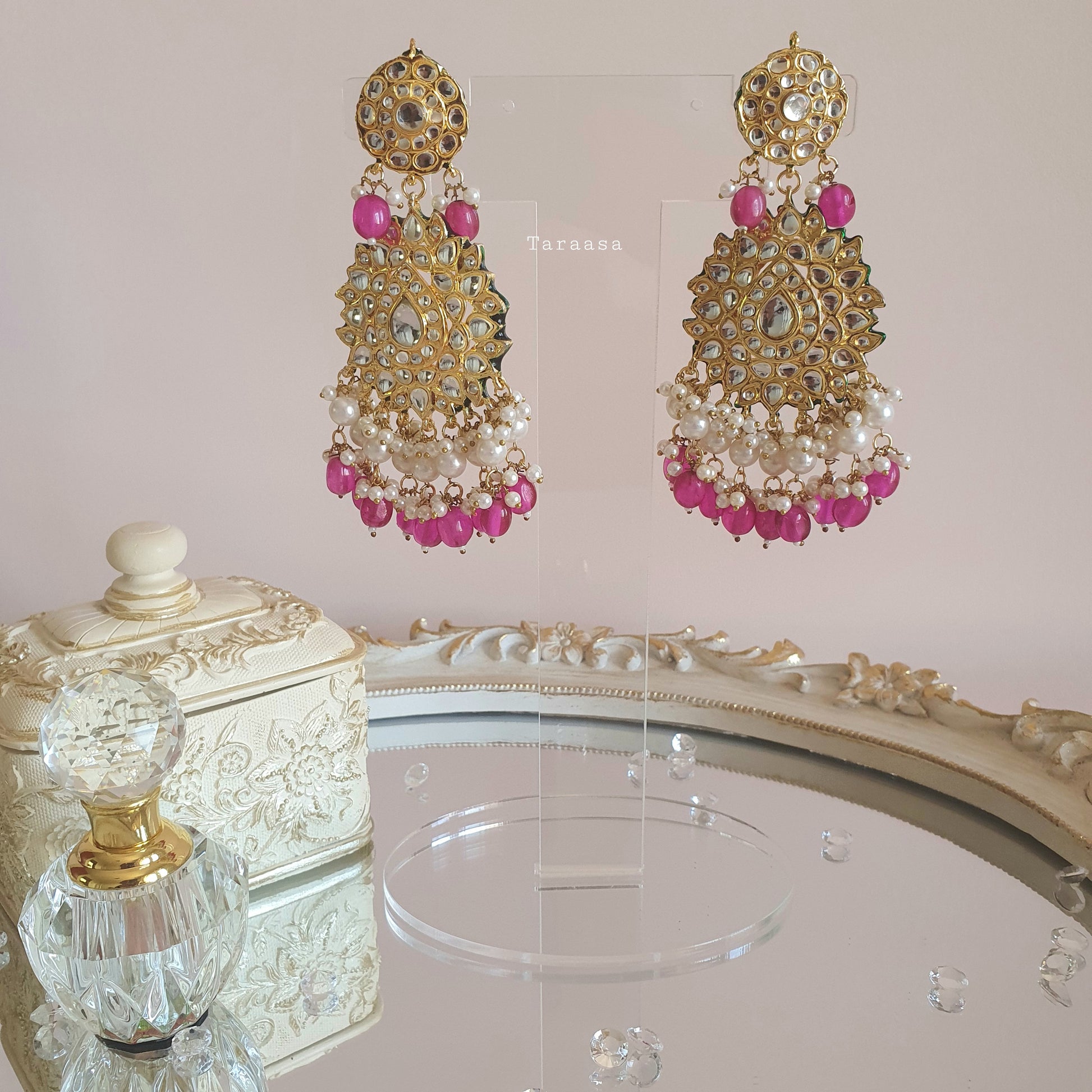 An artful harmony of kundan stones, elegant pearls and Fuchsia pink beads will have you feeling whimsical and extravagant in these large earrings. Perfect for that extra look!