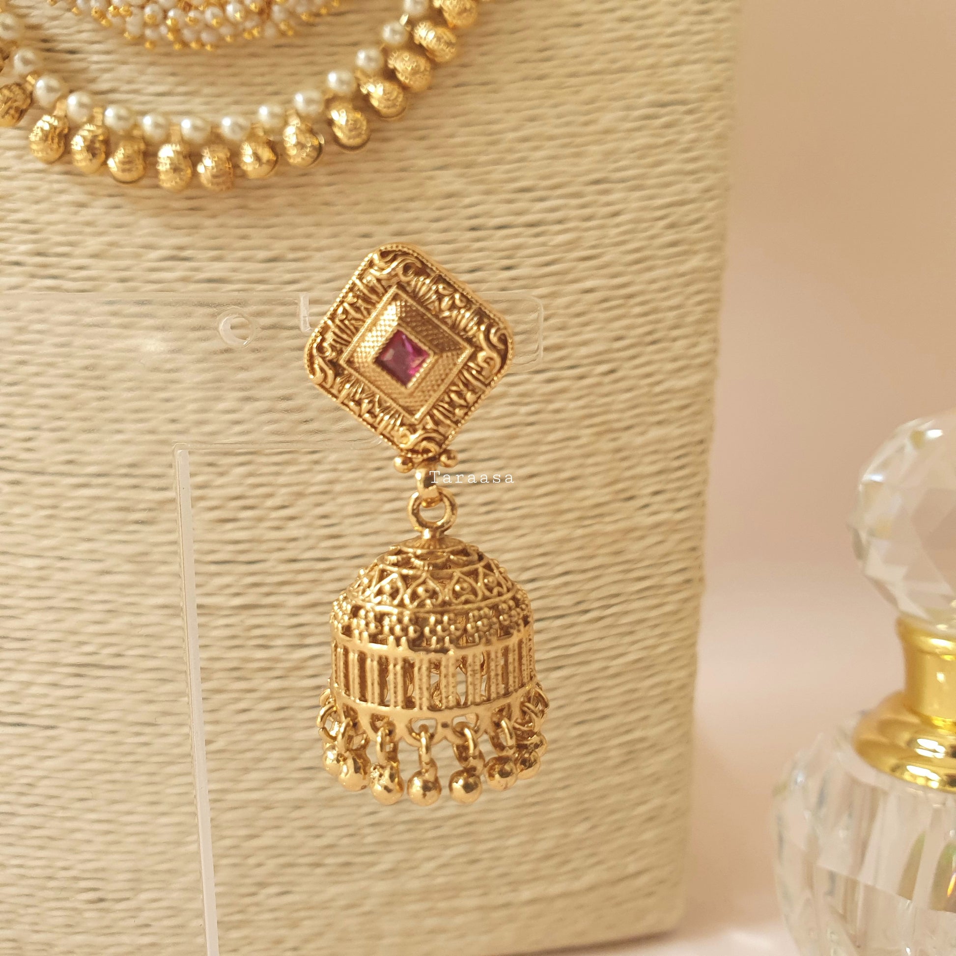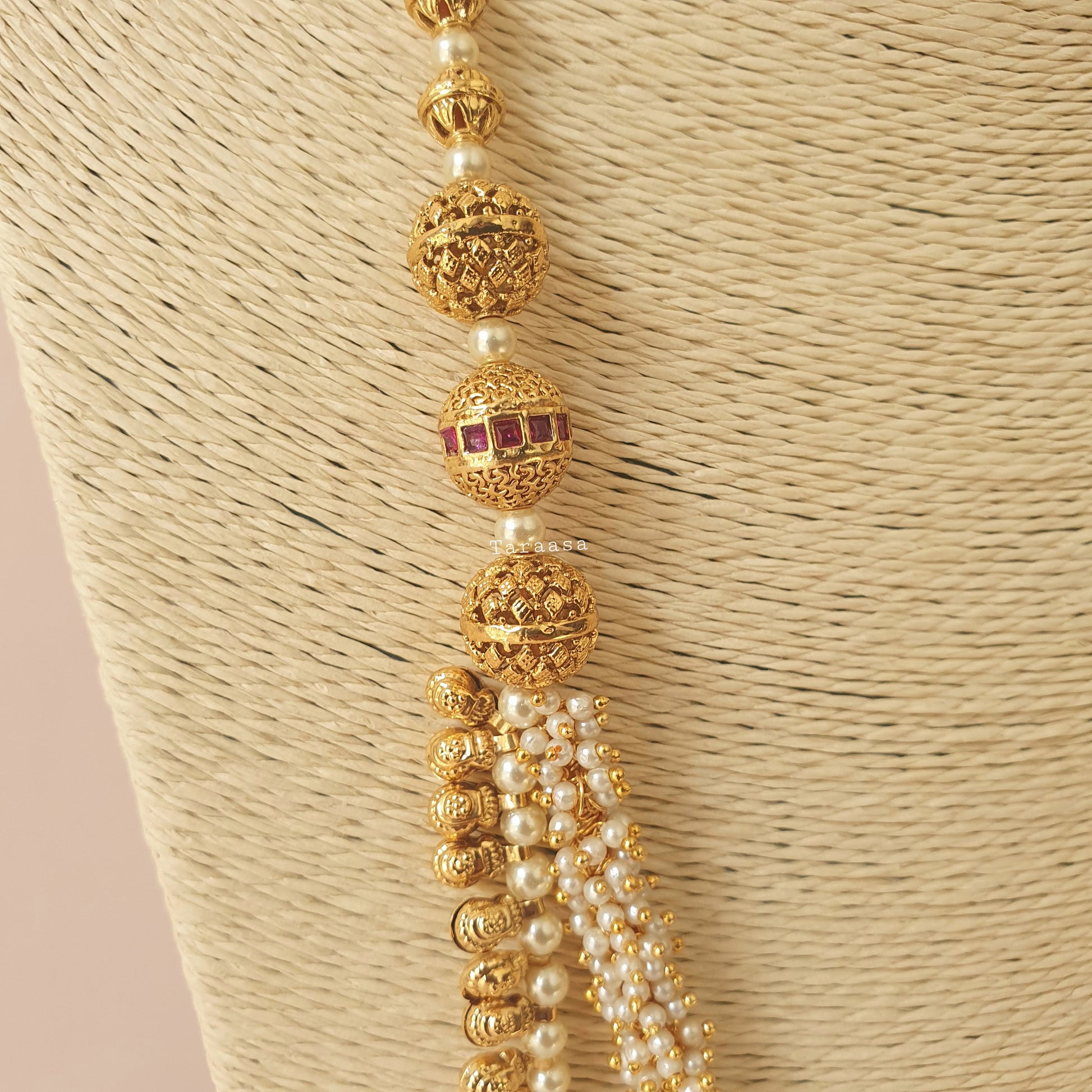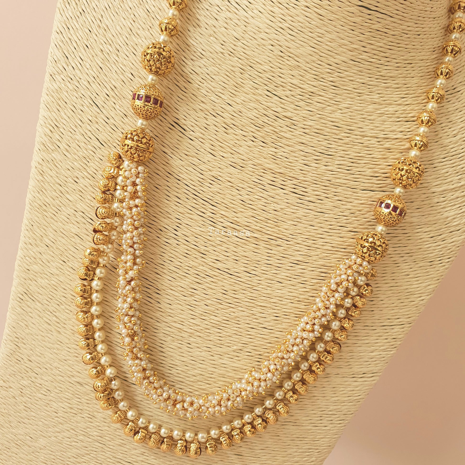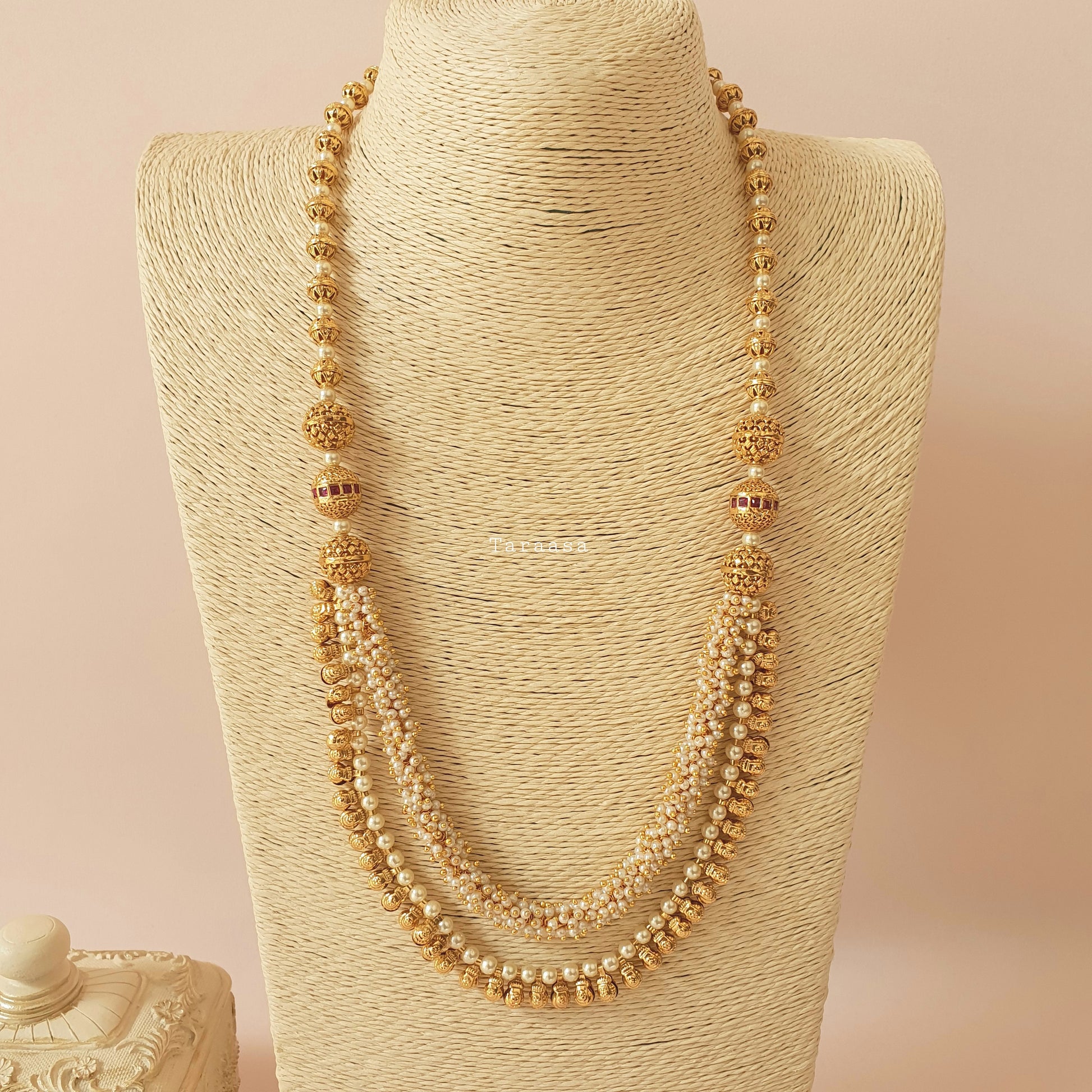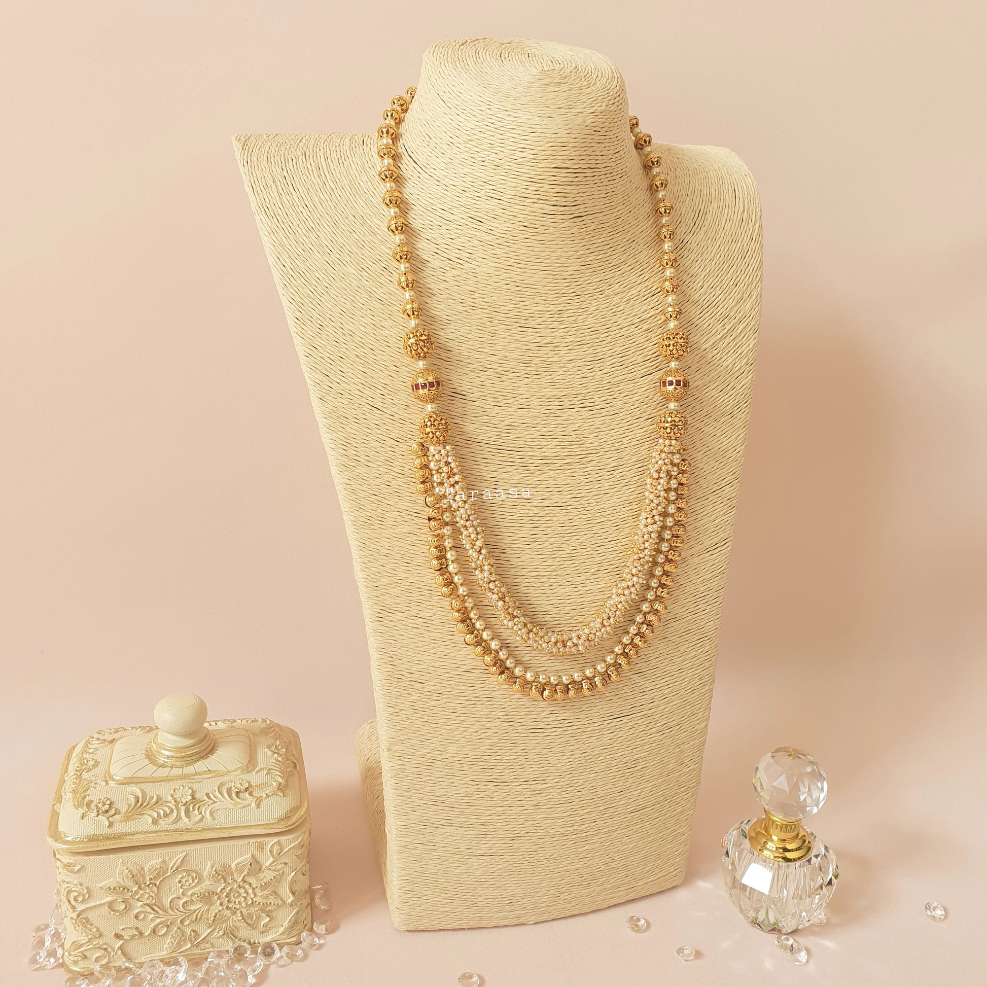 An adornment of rich tradition with this simple yet eye-catching mala set. Matte gold accompanied by layers of the hand strung pearls and golden balls, adding that touch of tradition. This set is completed with a set of traditional jumkhis.