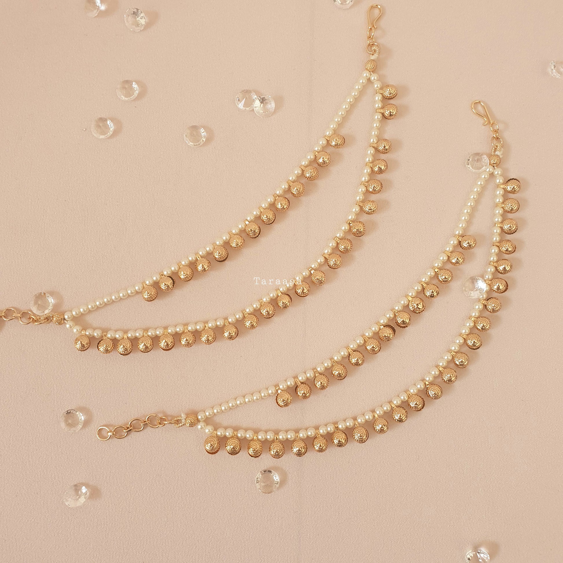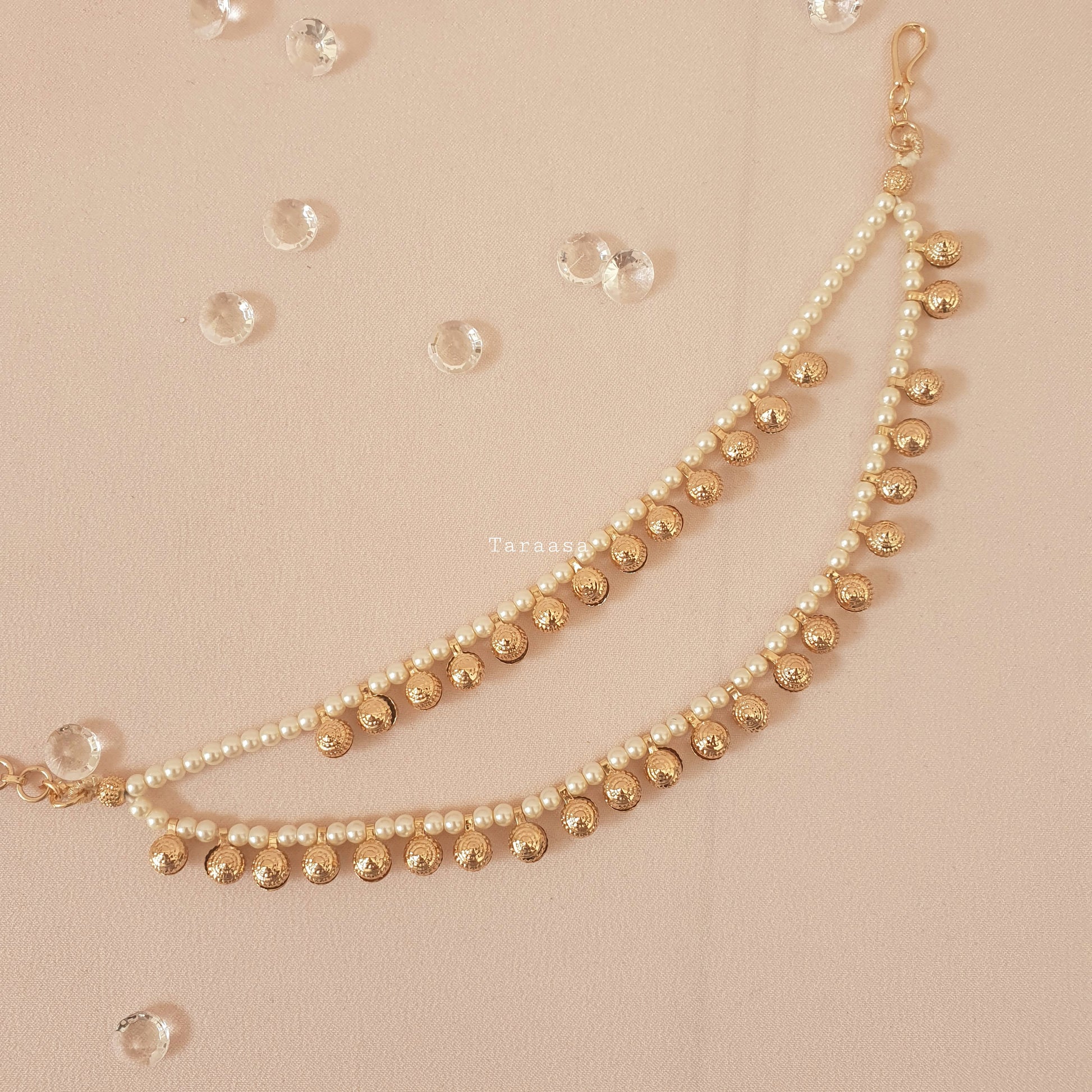 These pearl and gold kanchans whisper grace and elegance. Rows of lustrous pearls and gold beads weave a melody of tradition and celebration. A poetic fusion of elegance, and festivity—crafted to enchant with every step.