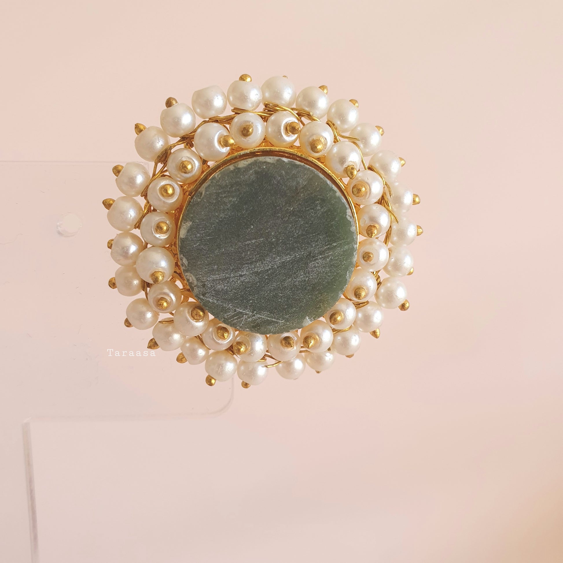 Beautiful crystal quartz stones in subtle pastel colours are surrounded by elegant, tiny pearls and set in luxe gold.