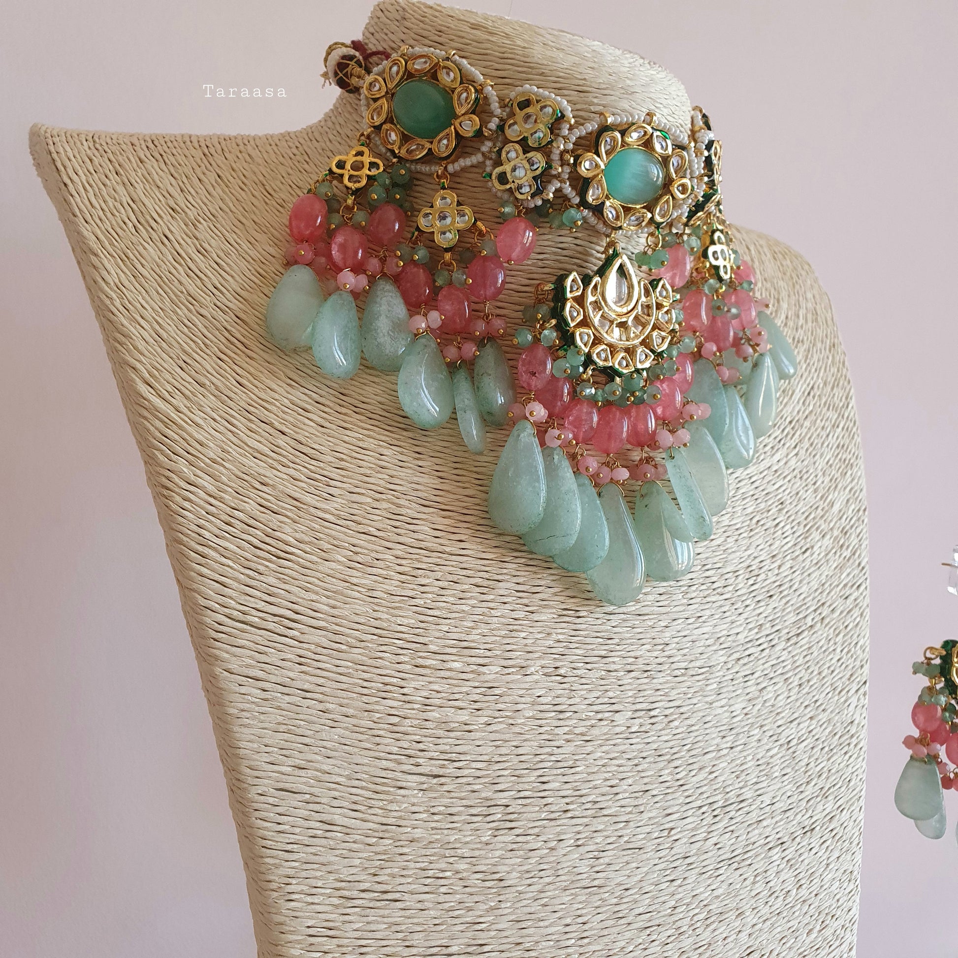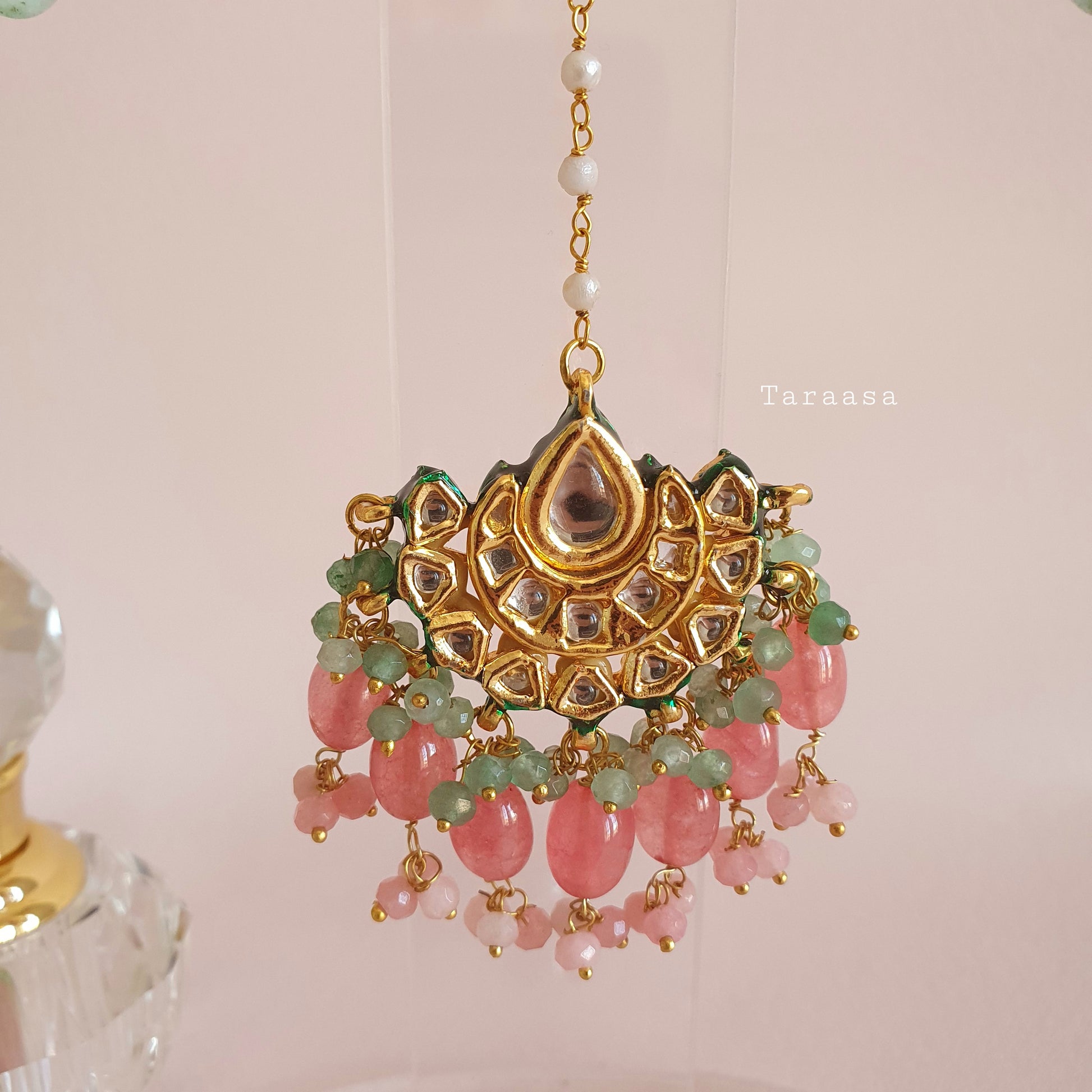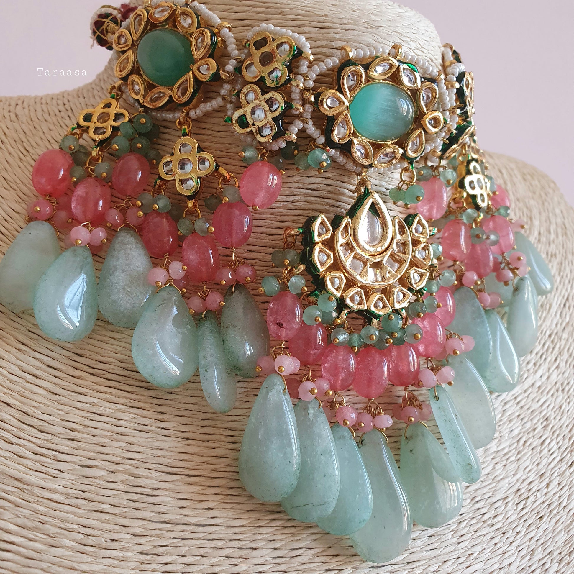 The green teardrop onyx glass beads are beautifully contrasted with pink beads. The reverse side is finished with a hand painted meenakari design.