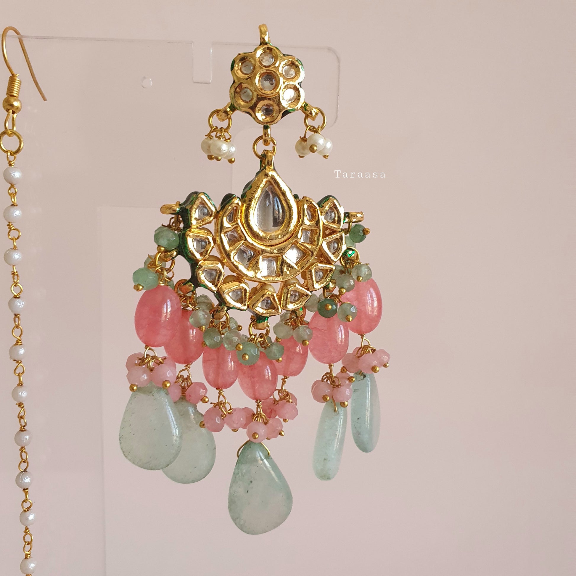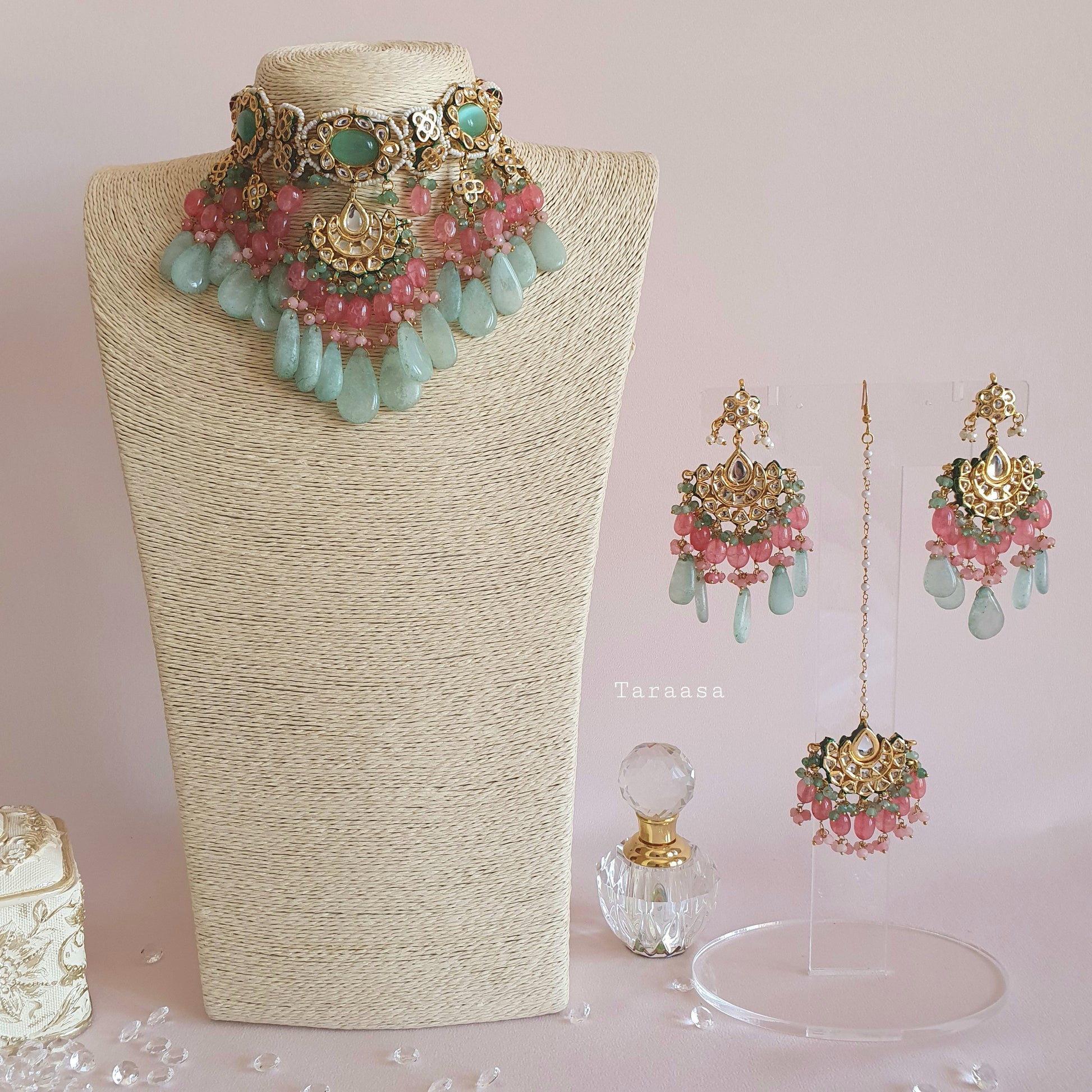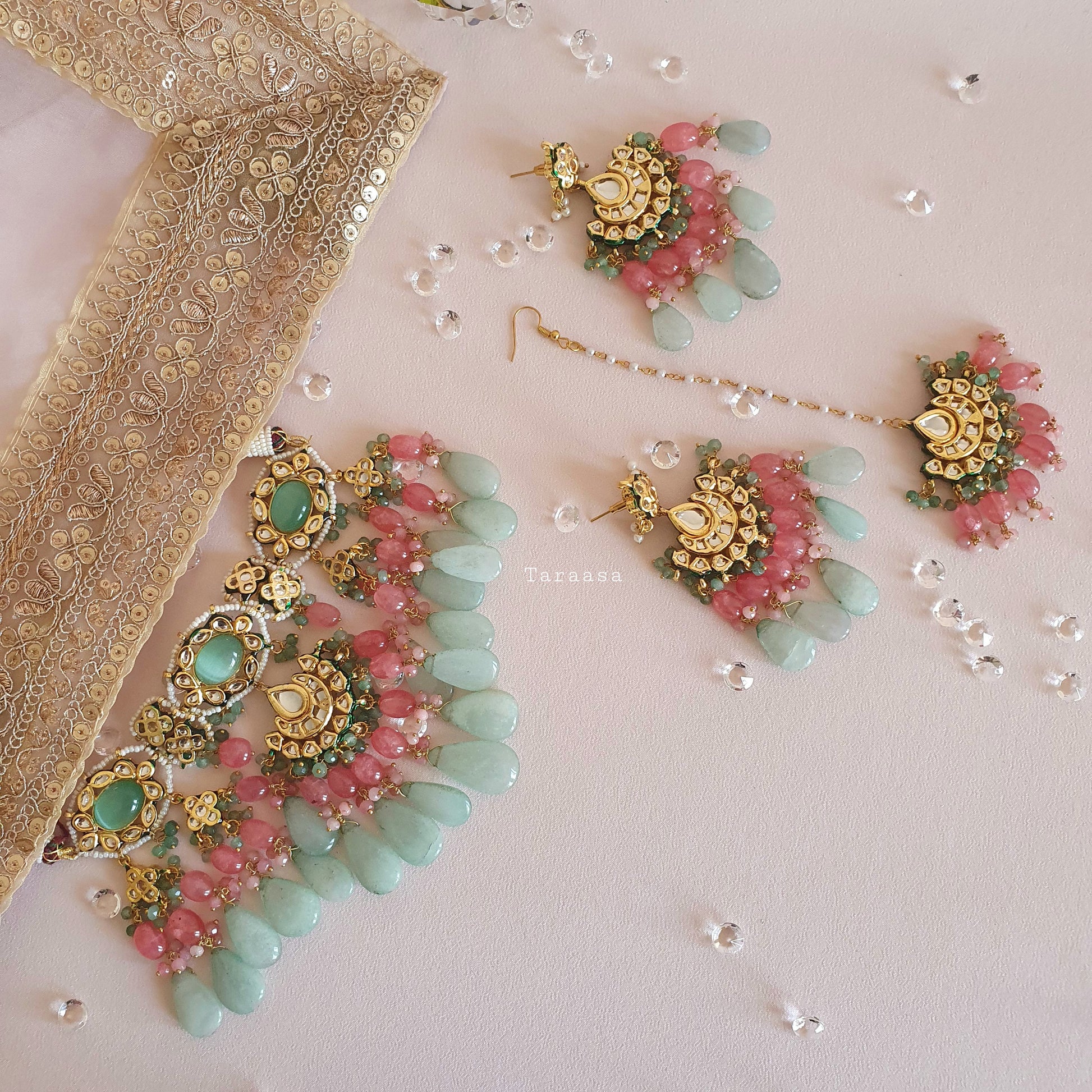 The green teardrop onyx glass beads are beautifully contrasted with pink beads. The reverse side is finished with a hand painted meenakari design.