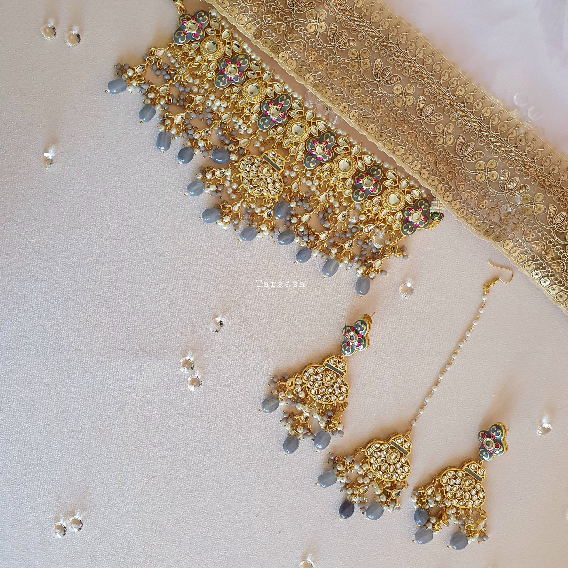 This delicate koala grey choker set contains artistic meenakari work with a hint of pink to accentuate the playfulness of the set. Set in a luxurious gold with kundan stones, a mix of pearls and koala grey crystal beads create an air of elegance.