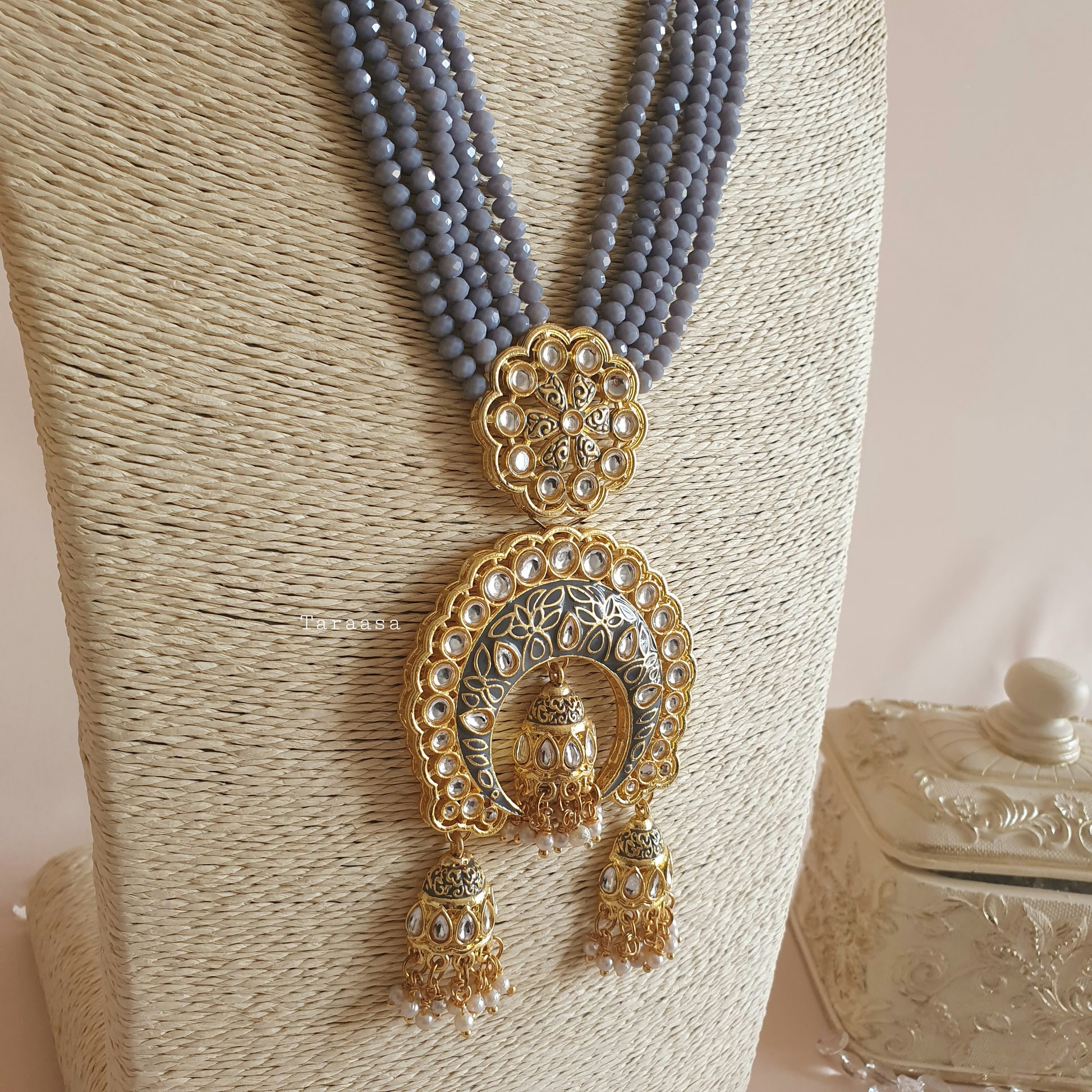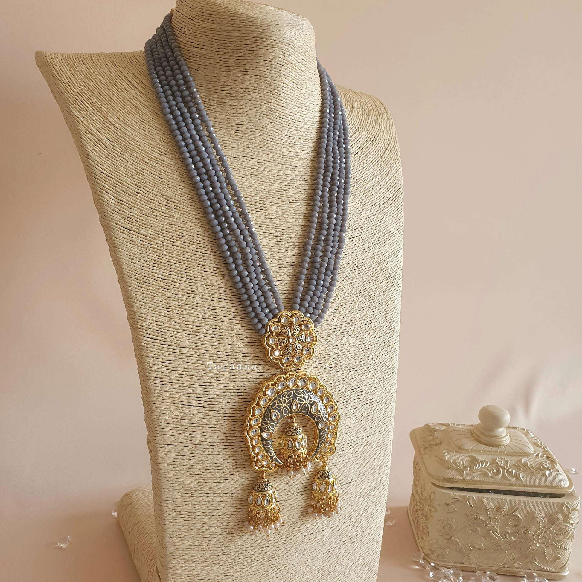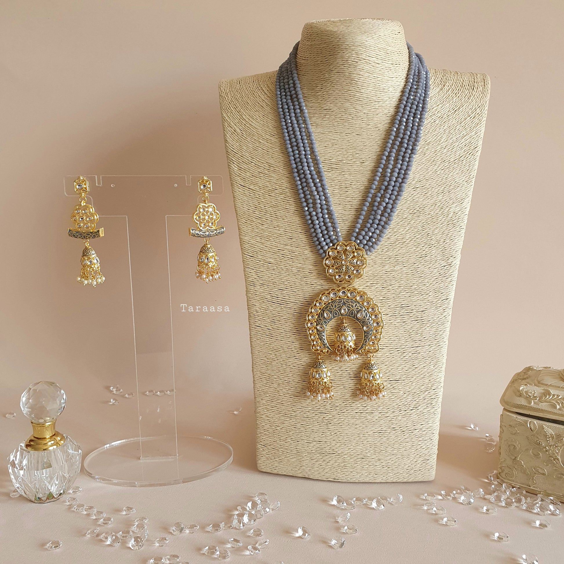 Our beautiful lightweight haars are made up of layers of crystal beads with meenakari pendants and traditional jumkhi drops, finished with tiny pearls for that elegant look. It is paired with a pair of matching earrings.