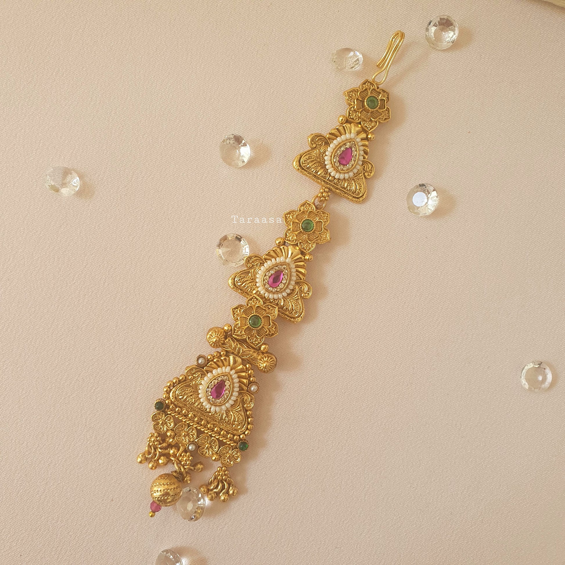 This set comes with a choker, haar, a pair of matching drop earrings as well as a pair of jumkhis. A mathapaathi completes this bridal set.