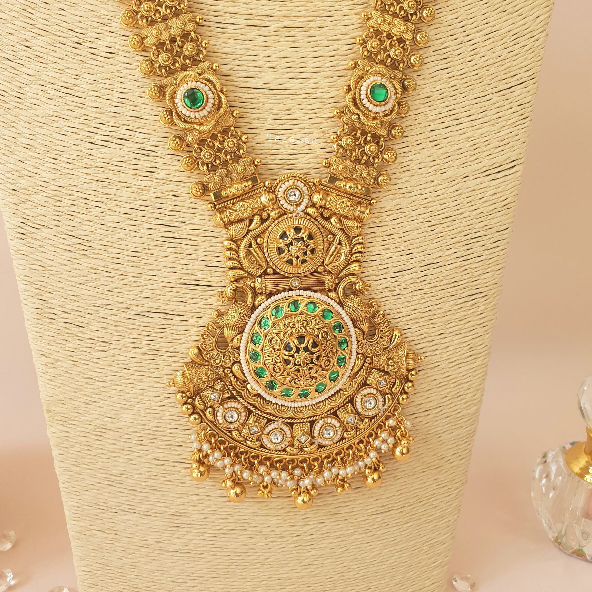 A majestic blend of traditional and heritage elements, this exquisite bridal set has been crafted in matte gold which is detailed in floral and peacock motifs with exuberant green glass stones, finished with dainty pearl detailing.