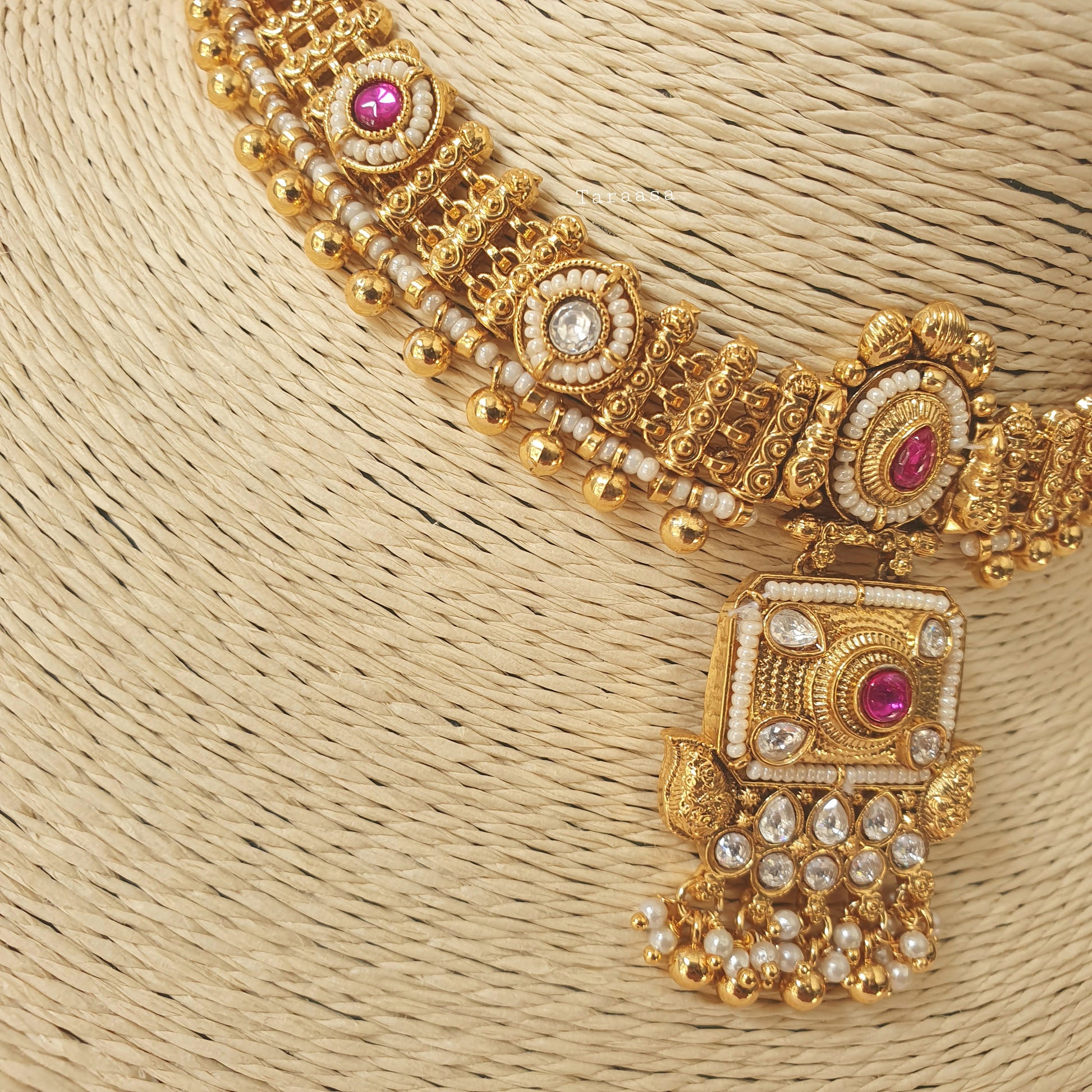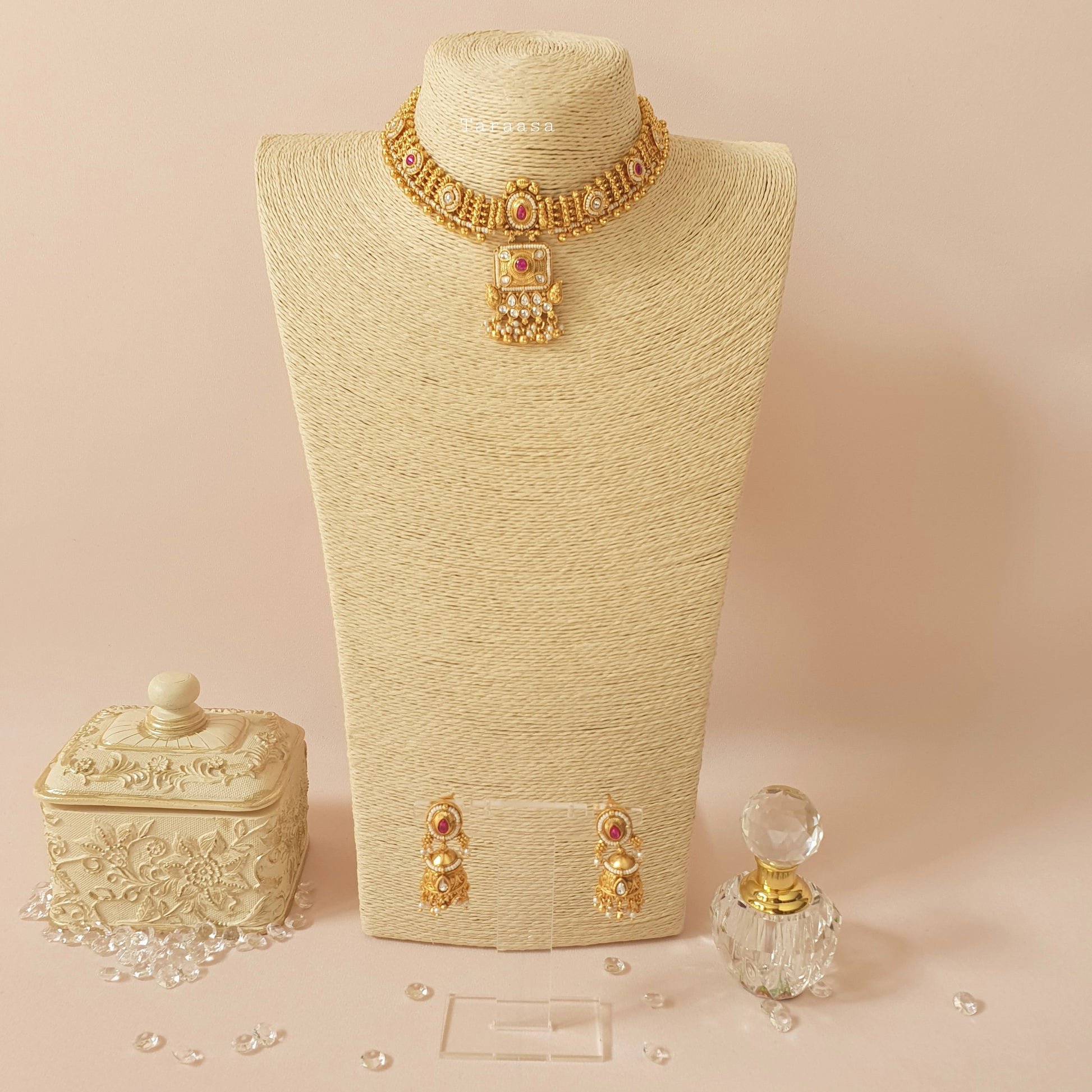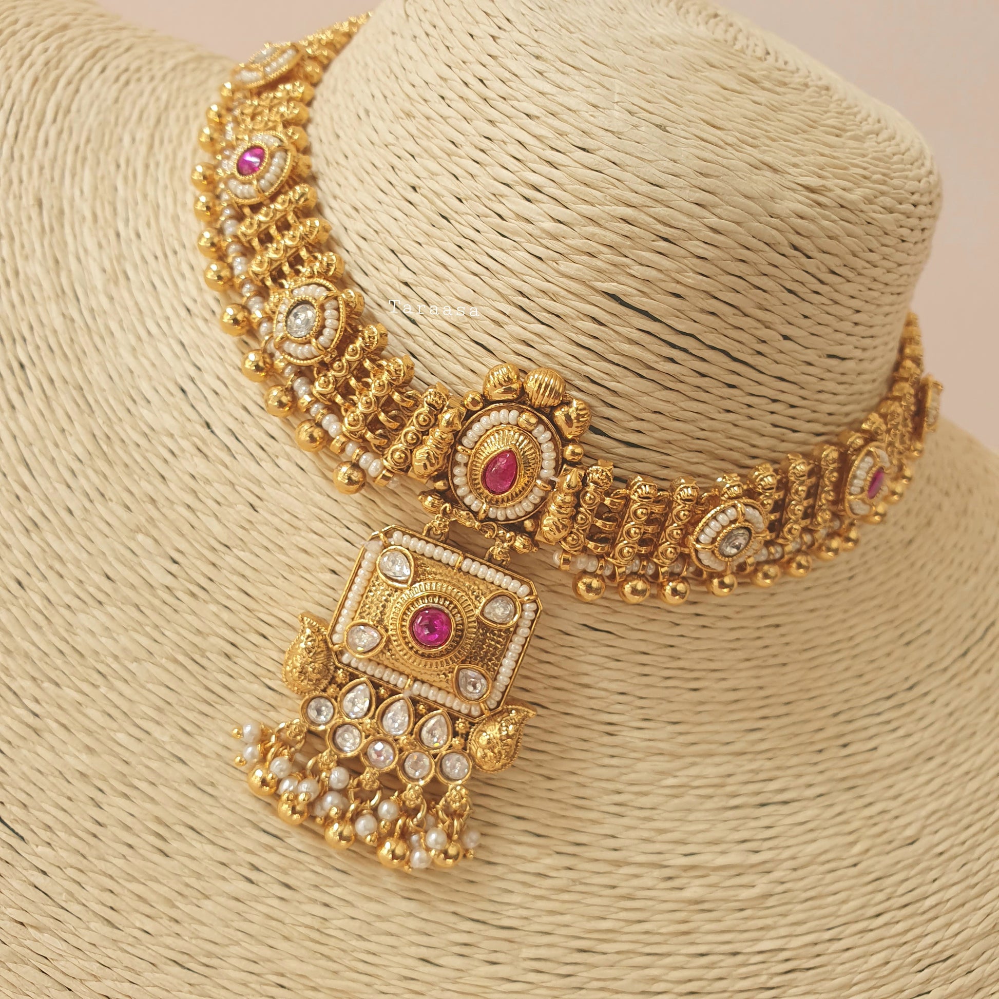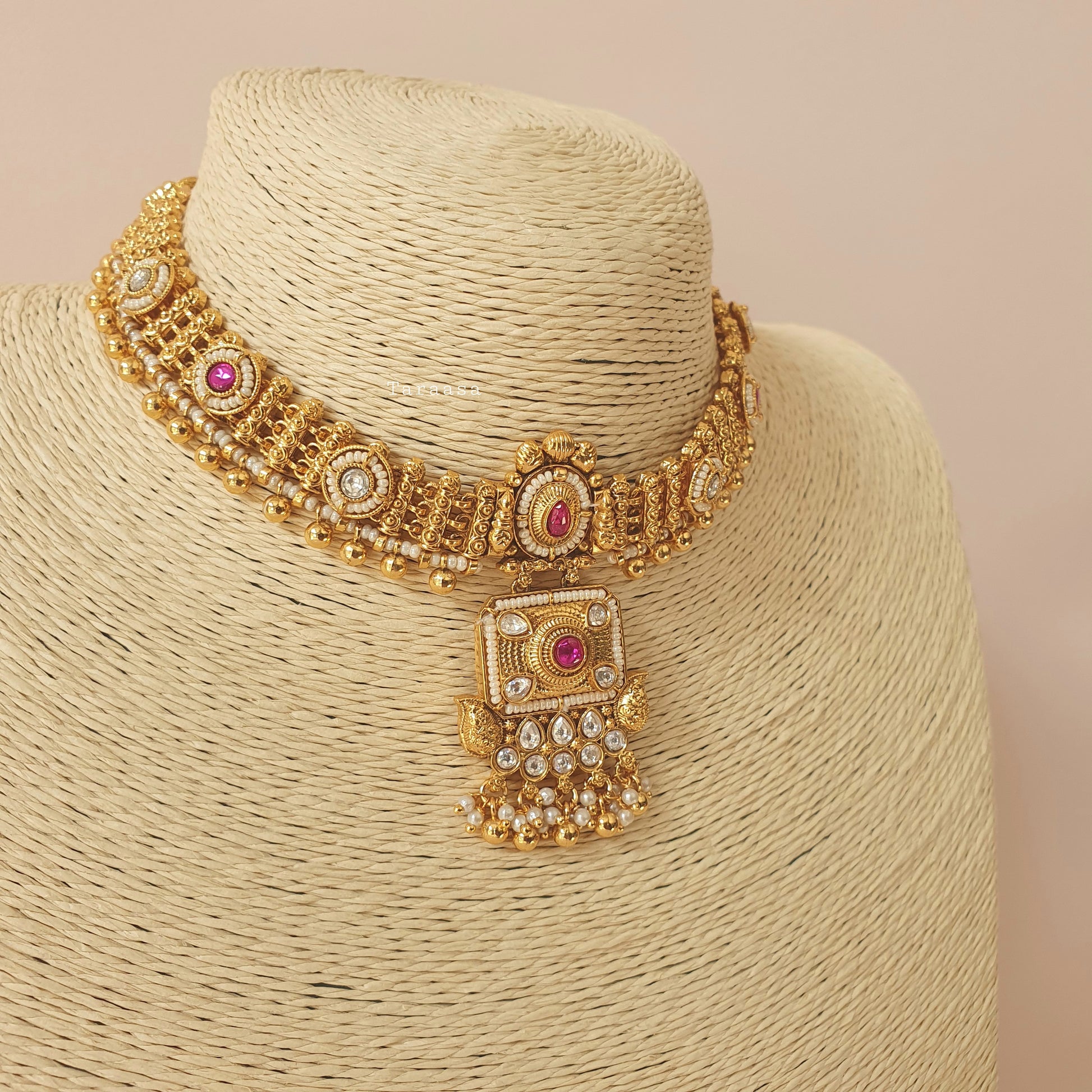 Tradition in every detail and adorned with kundan stones, cerise-hued accents and delicate pearls, this handcrafted South Indian choker from our Heritage Collection embodies timeless grace - a statement of culture, craftsmanship, and elegance. Paired with the prettiest little jumkhis - this set is the perfect finishing piece for every emsemble.