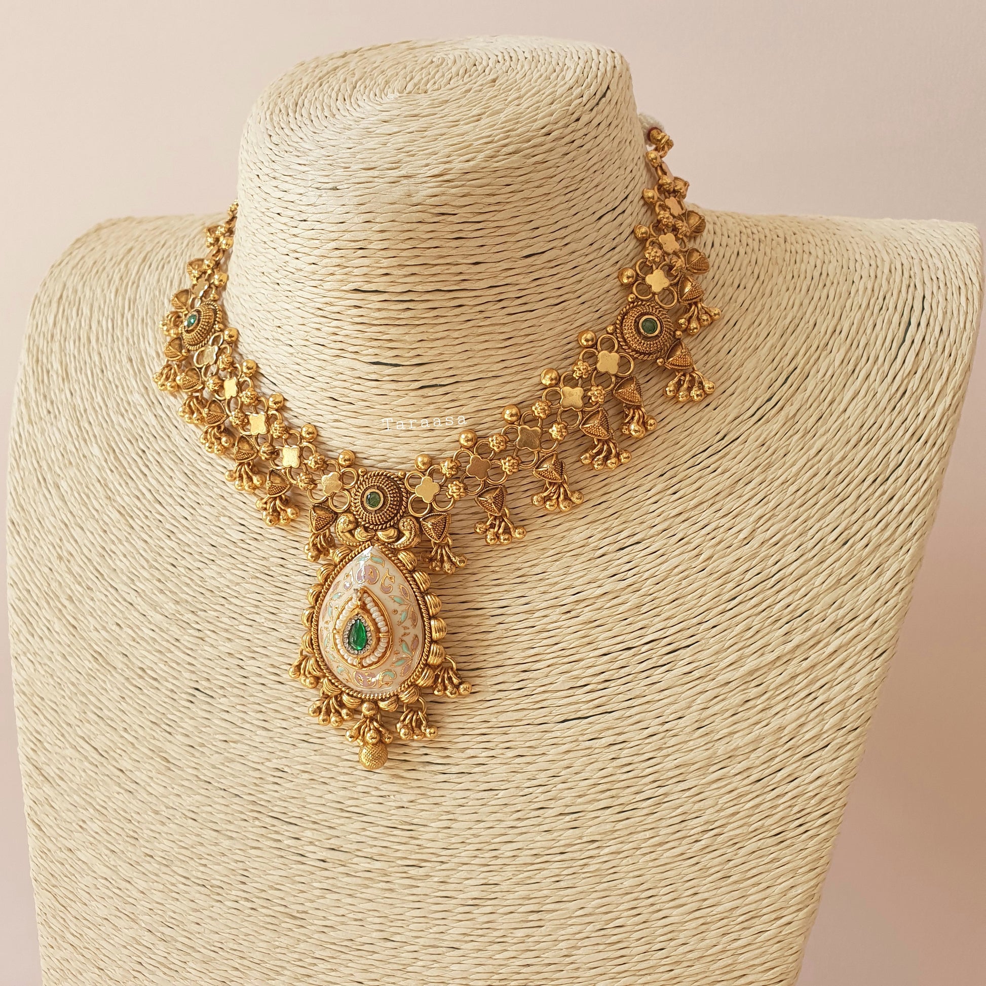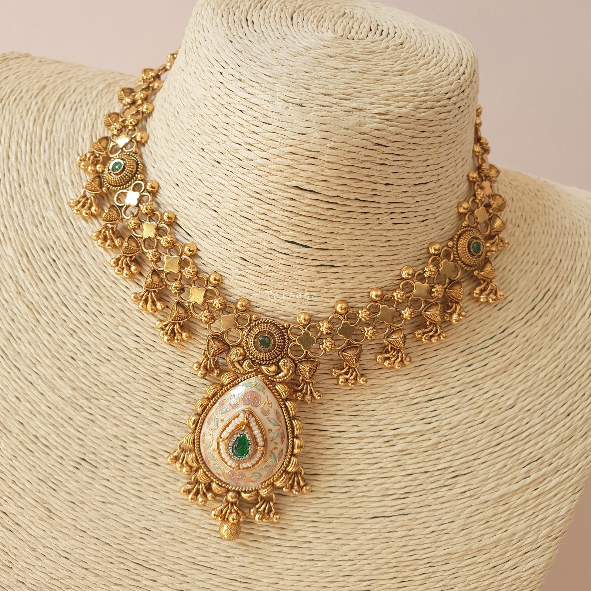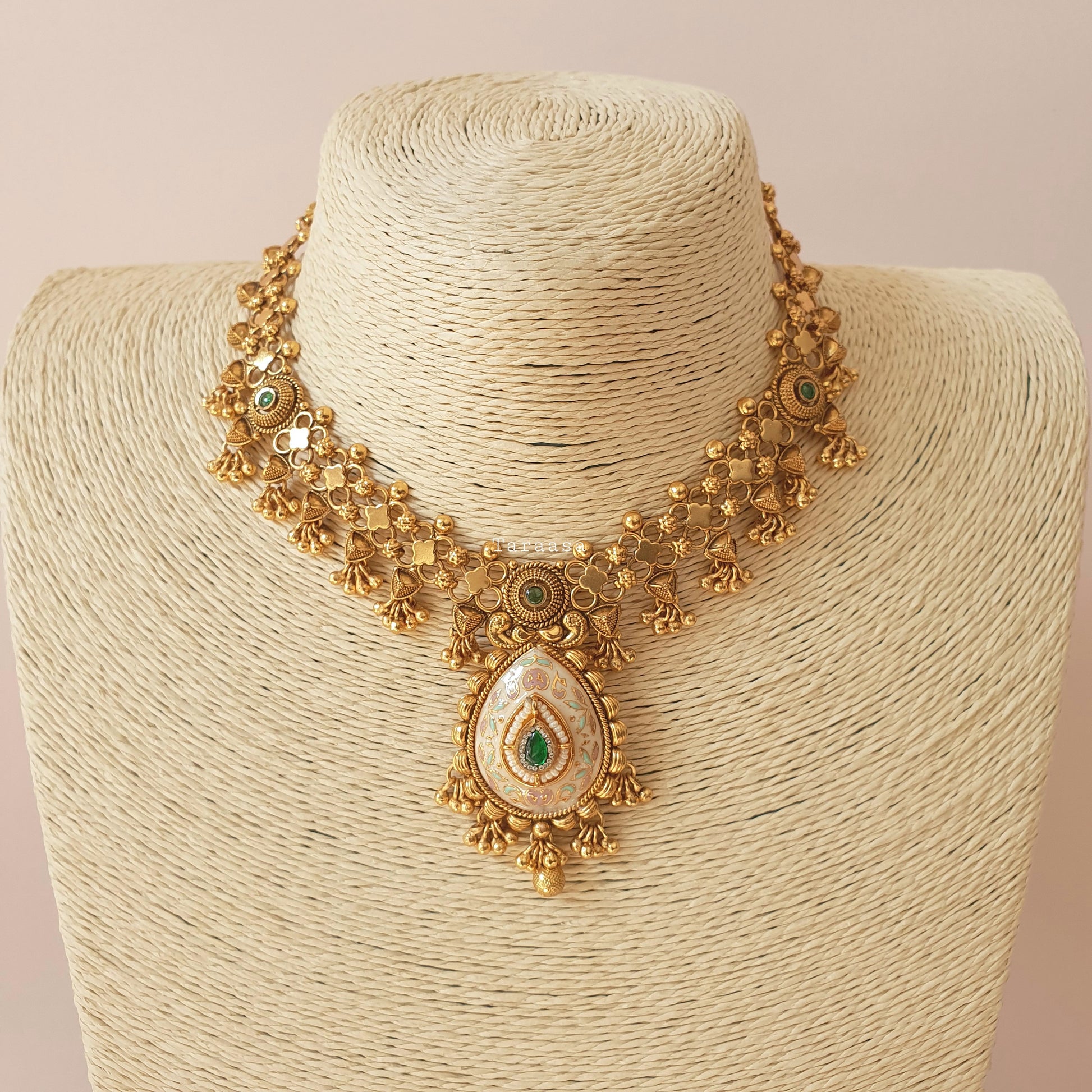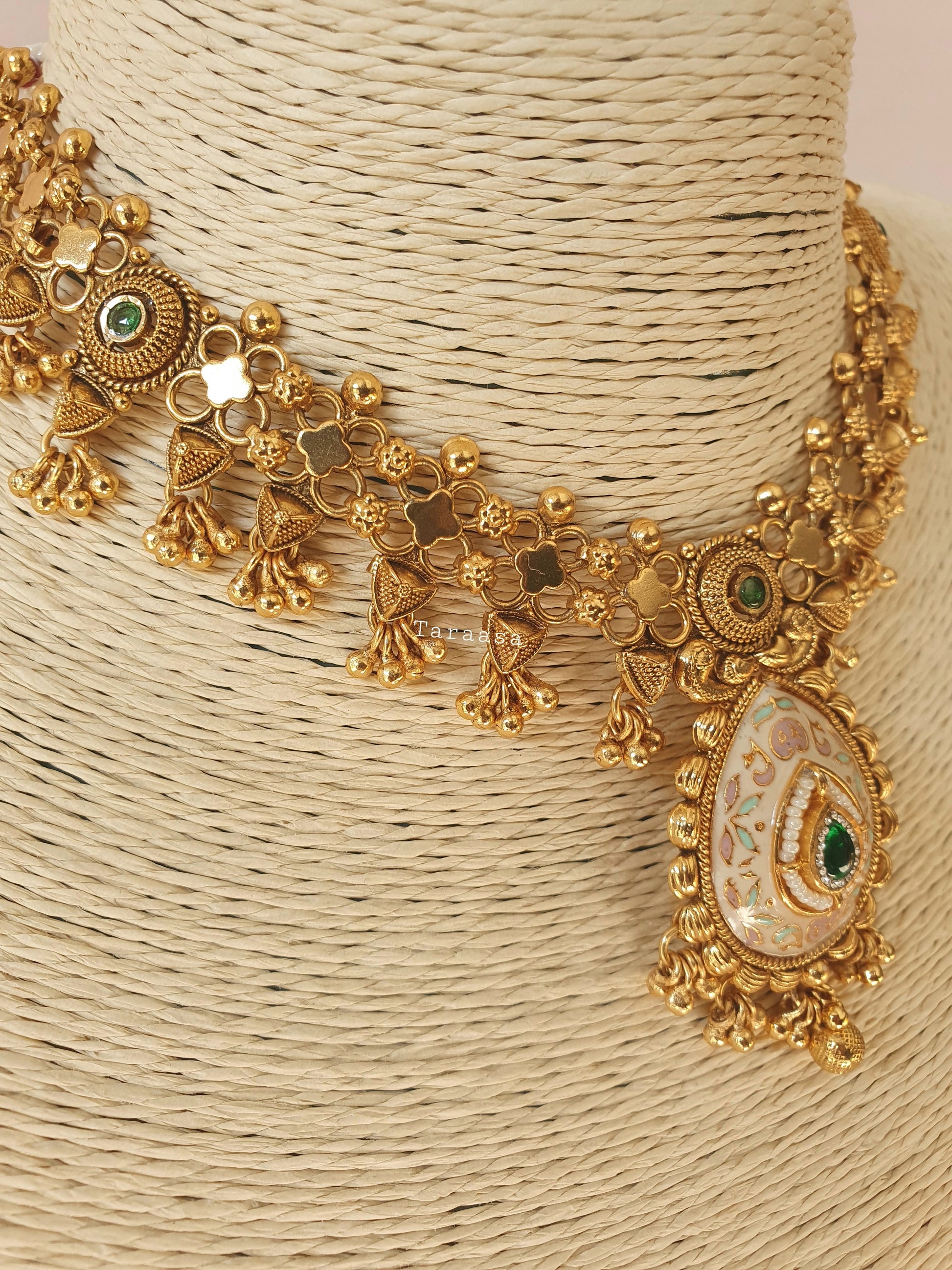 Timeless elegance, woven in gold. A regal South Indian choker from our Heritage Collection — intricately handcrafted with antique gold tones, hand painted pastel meenakari, and vibrant emerald accents. Perfect for the modern woman who cherishes tradition. Paired with the ornate meenakari statement earrings.