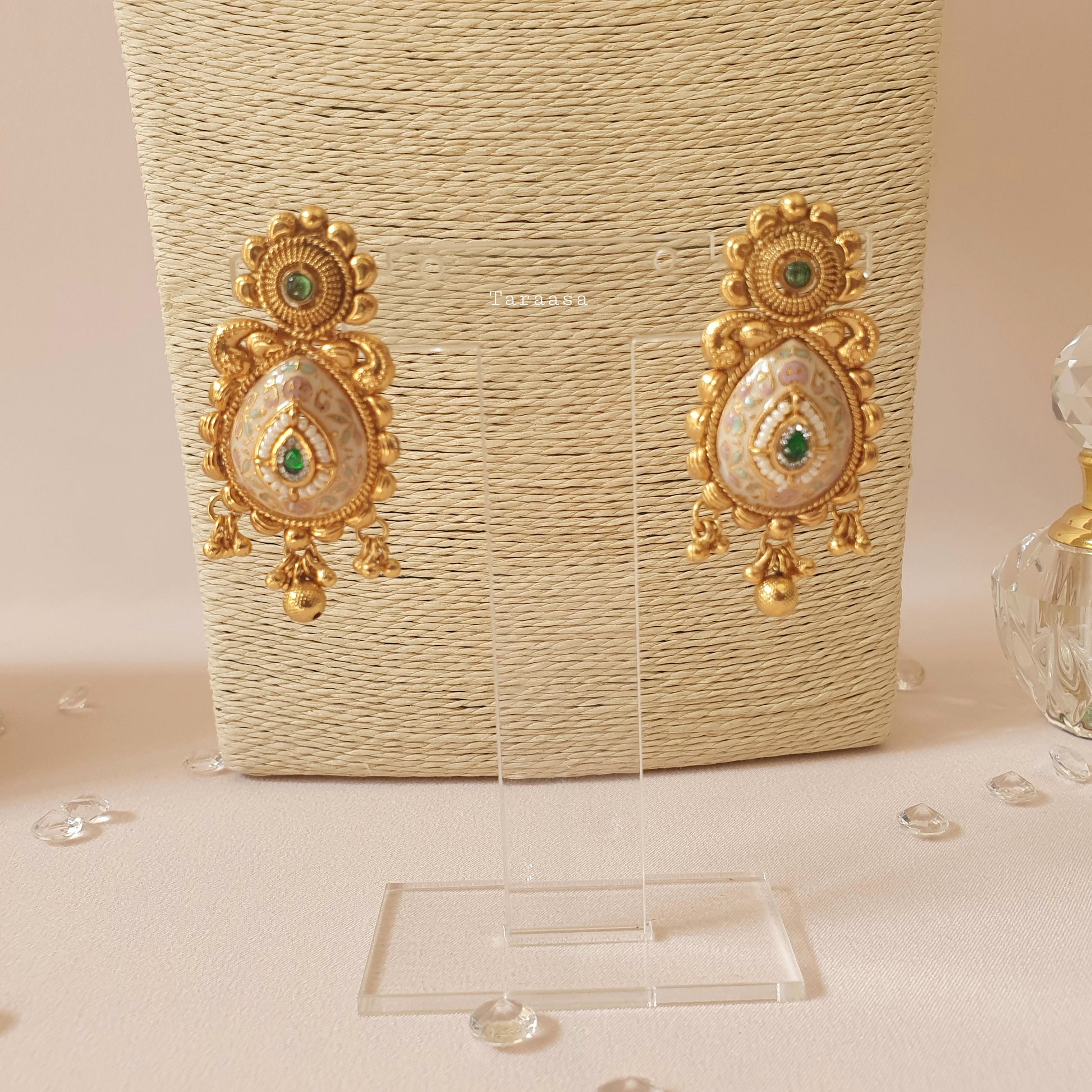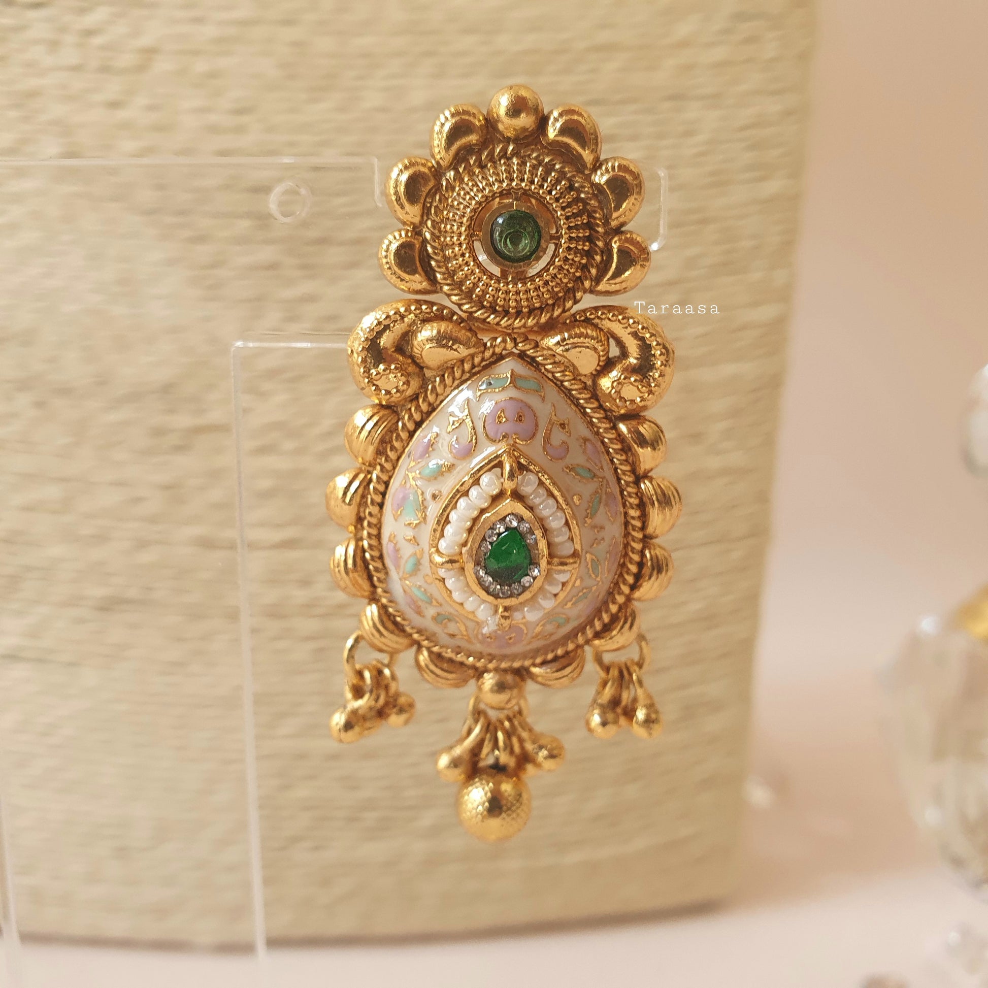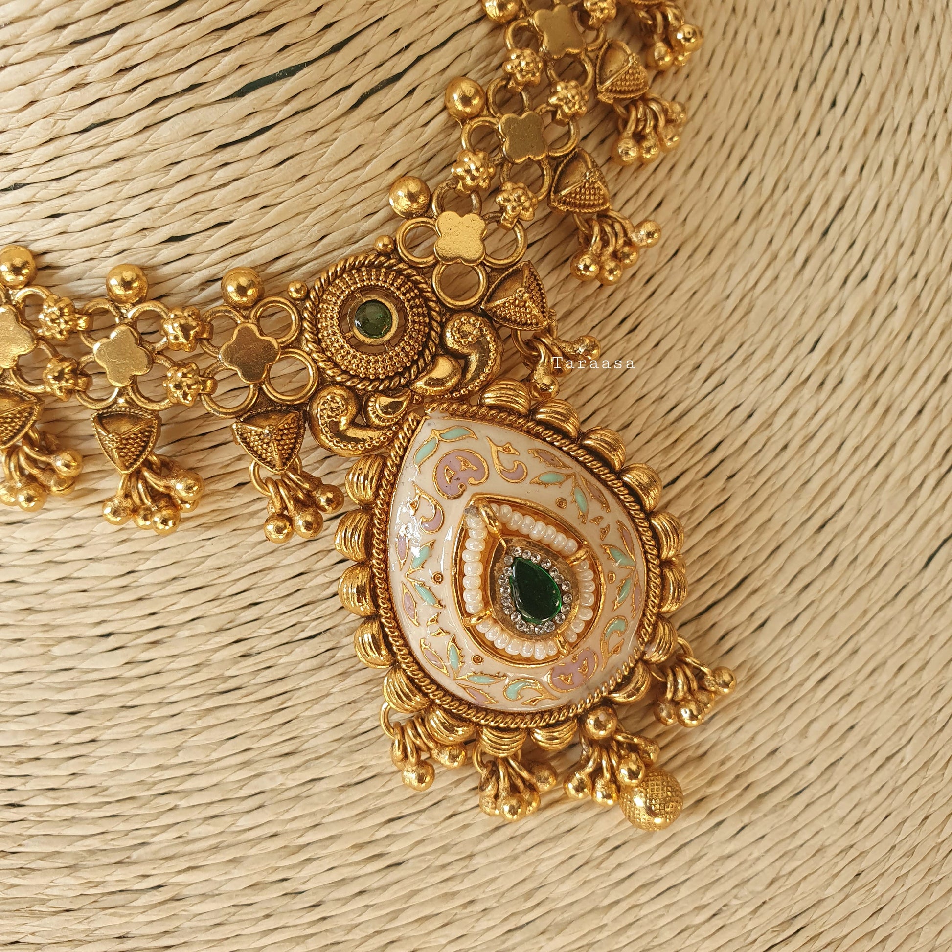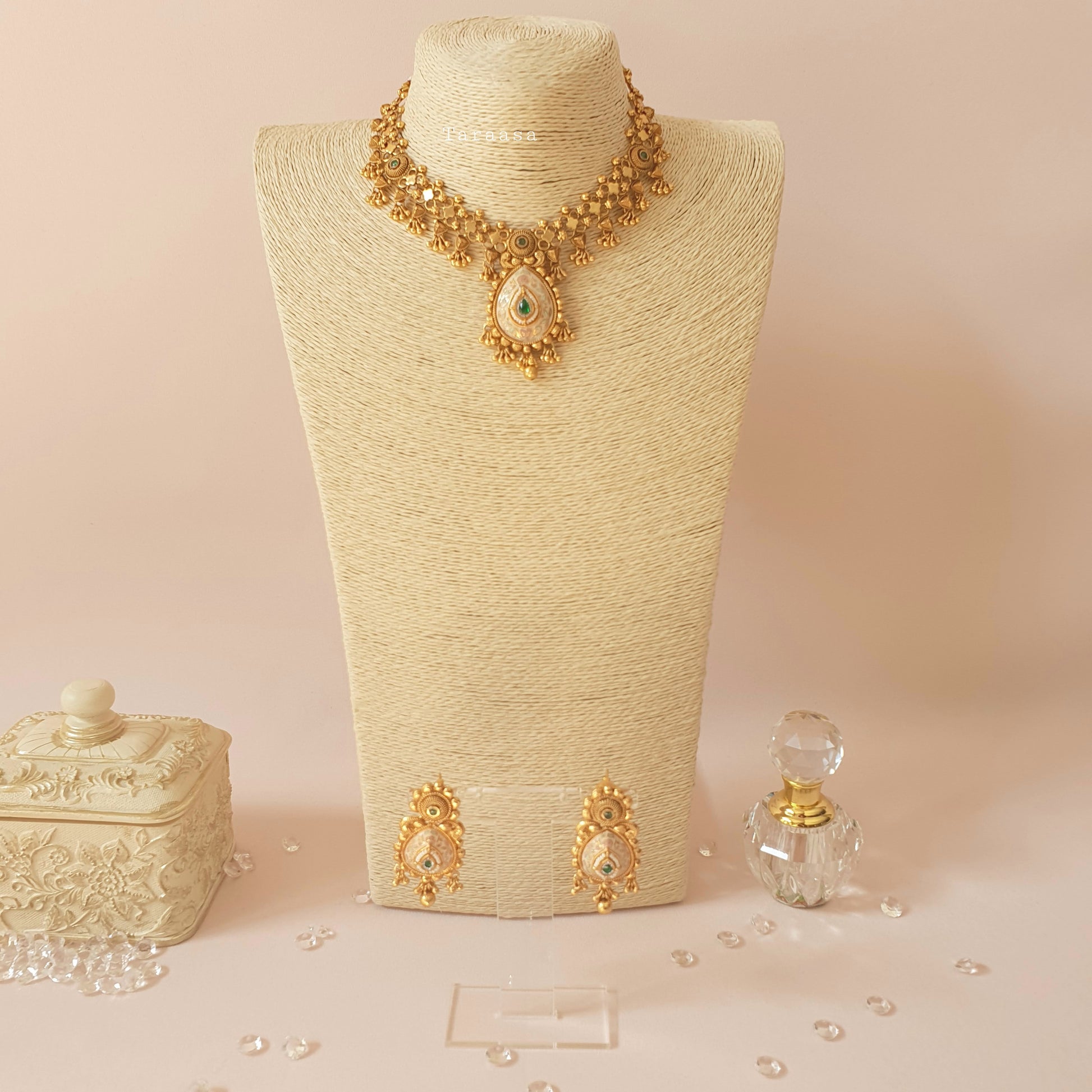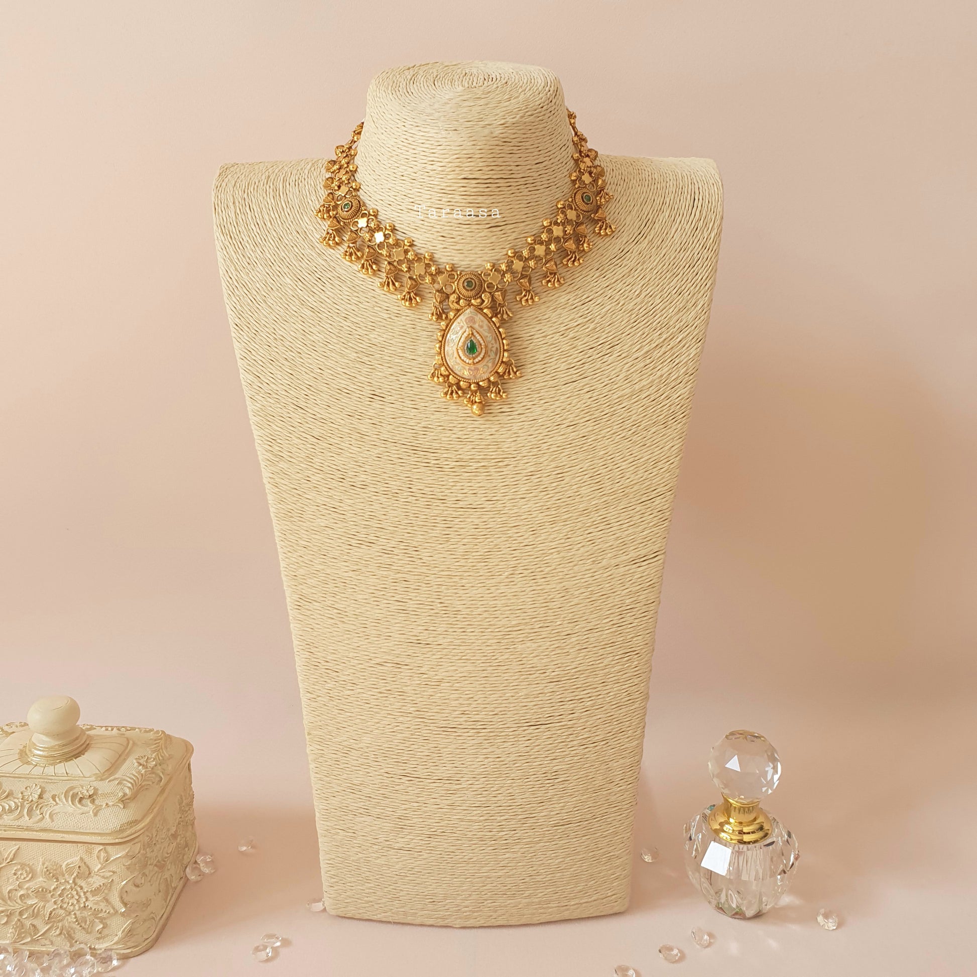 Timeless elegance, woven in gold. A regal South Indian choker from our Heritage Collection — intricately handcrafted with antique gold tones, hand painted pastel meenakari, and vibrant emerald accents. Perfect for the modern woman who cherishes tradition. Paired with the ornate meenakari statement earrings.