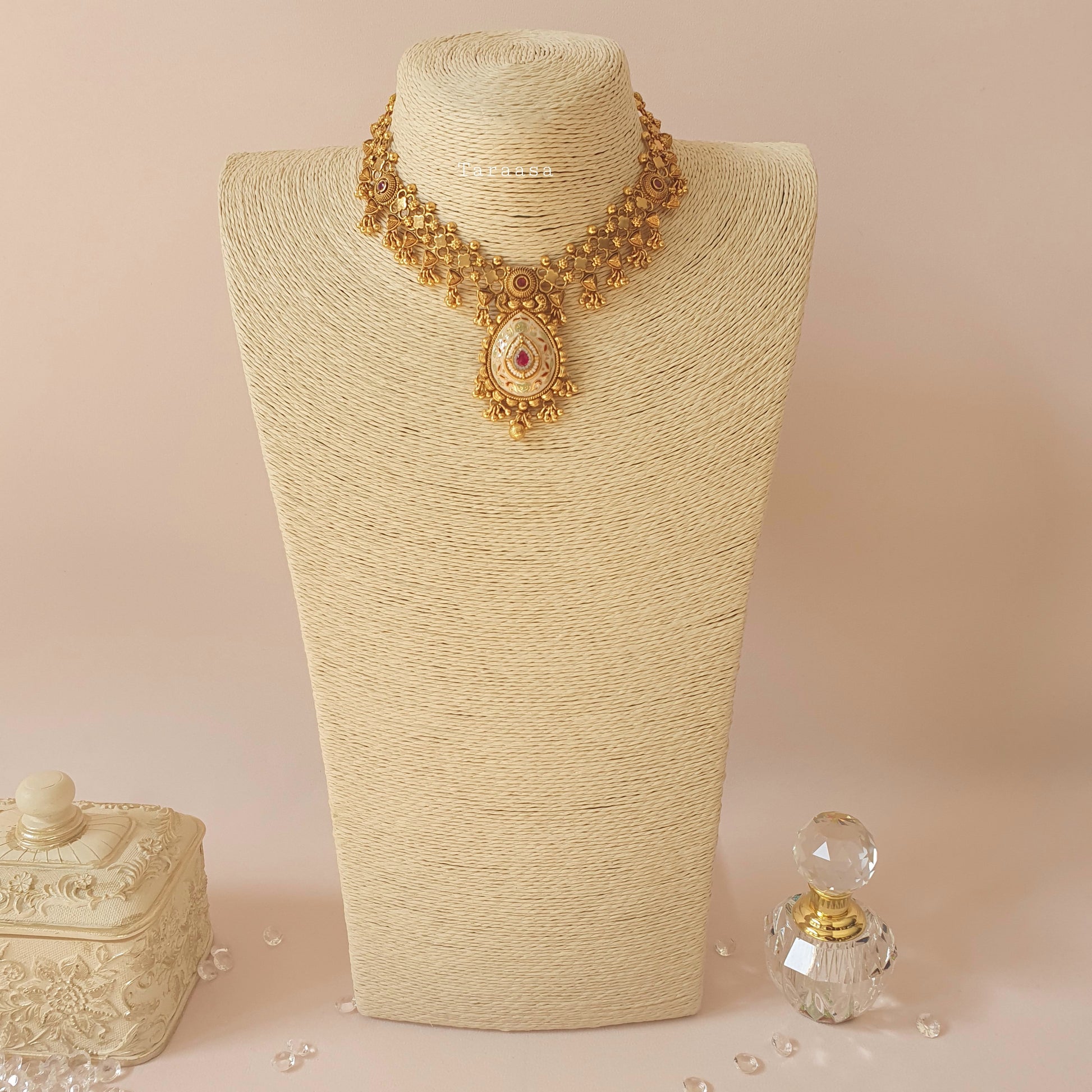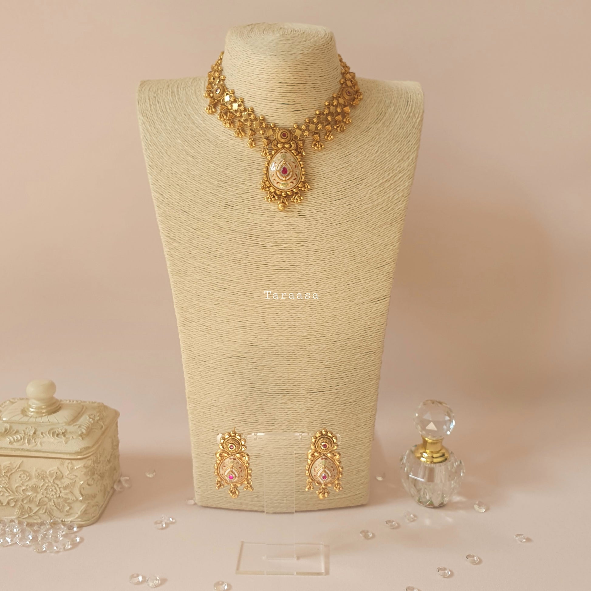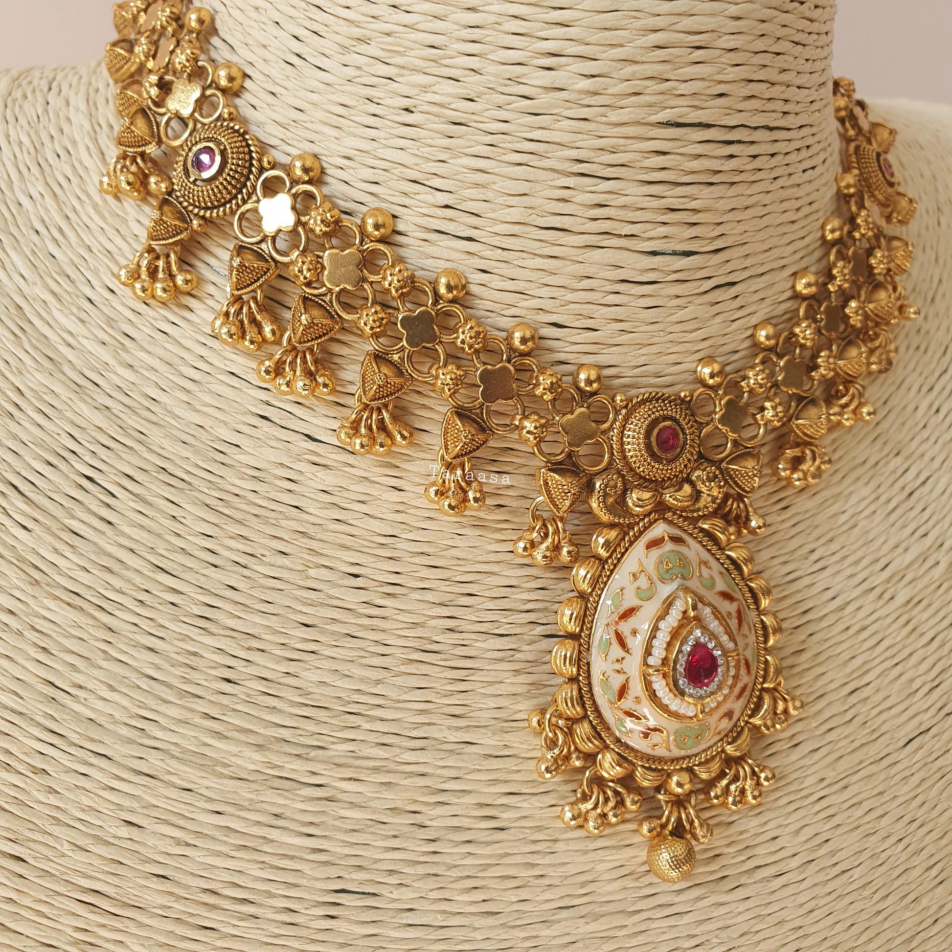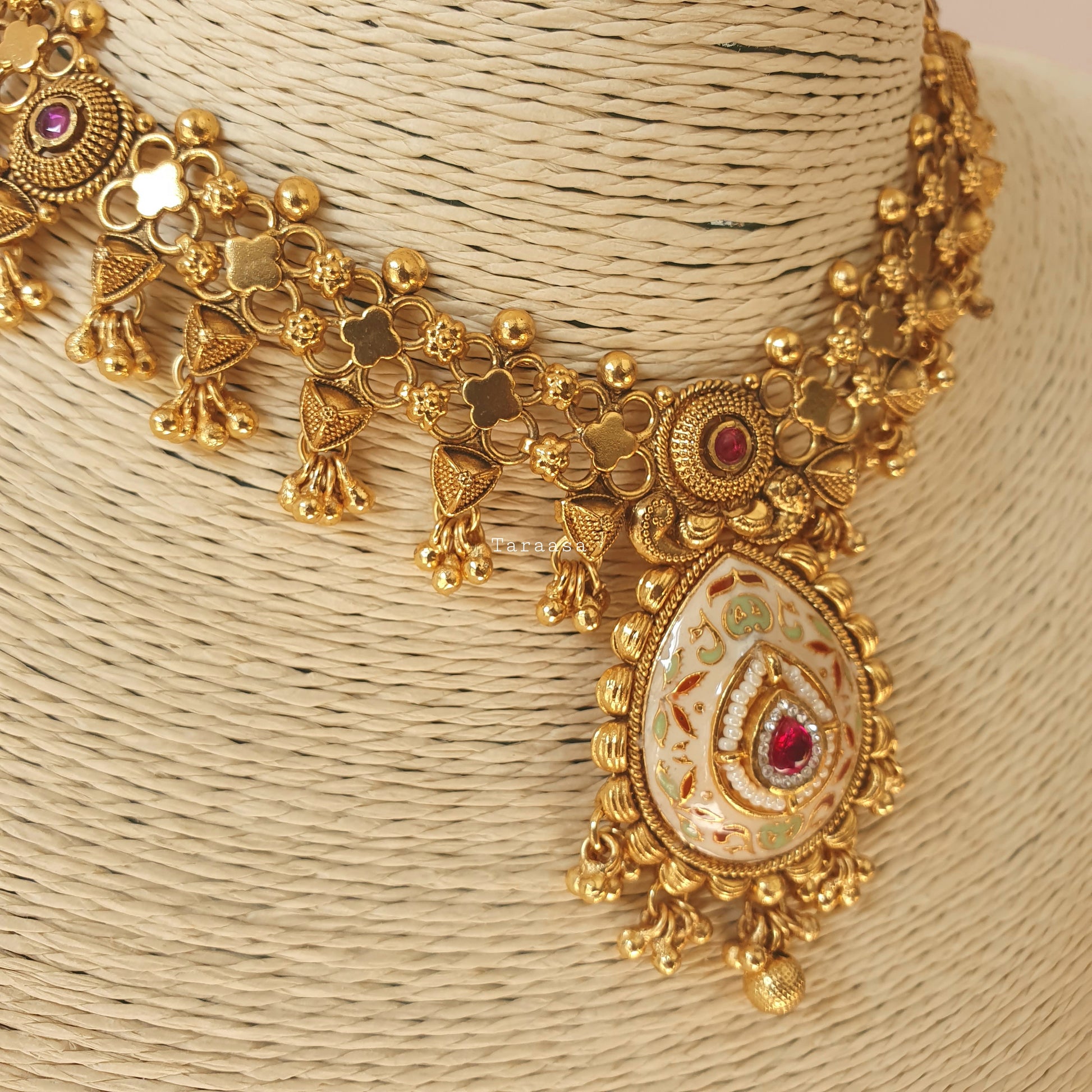 Timeless elegance, woven in gold. A regal South Indian choker from our Heritage Collection — intricately handcrafted with antique gold tones, hand painted pastel meenakari, and vibrant ruby accents. Perfect for the modern woman who cherishes tradition. Paired with the ornate meenakari statement earrings.