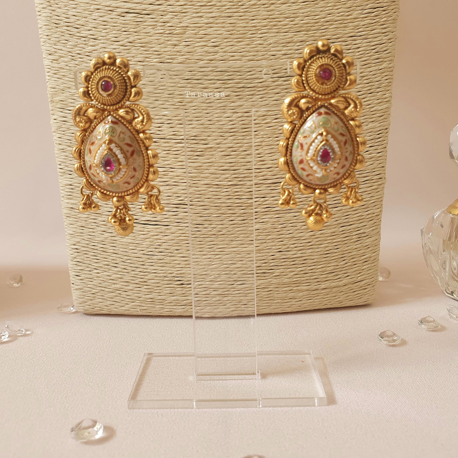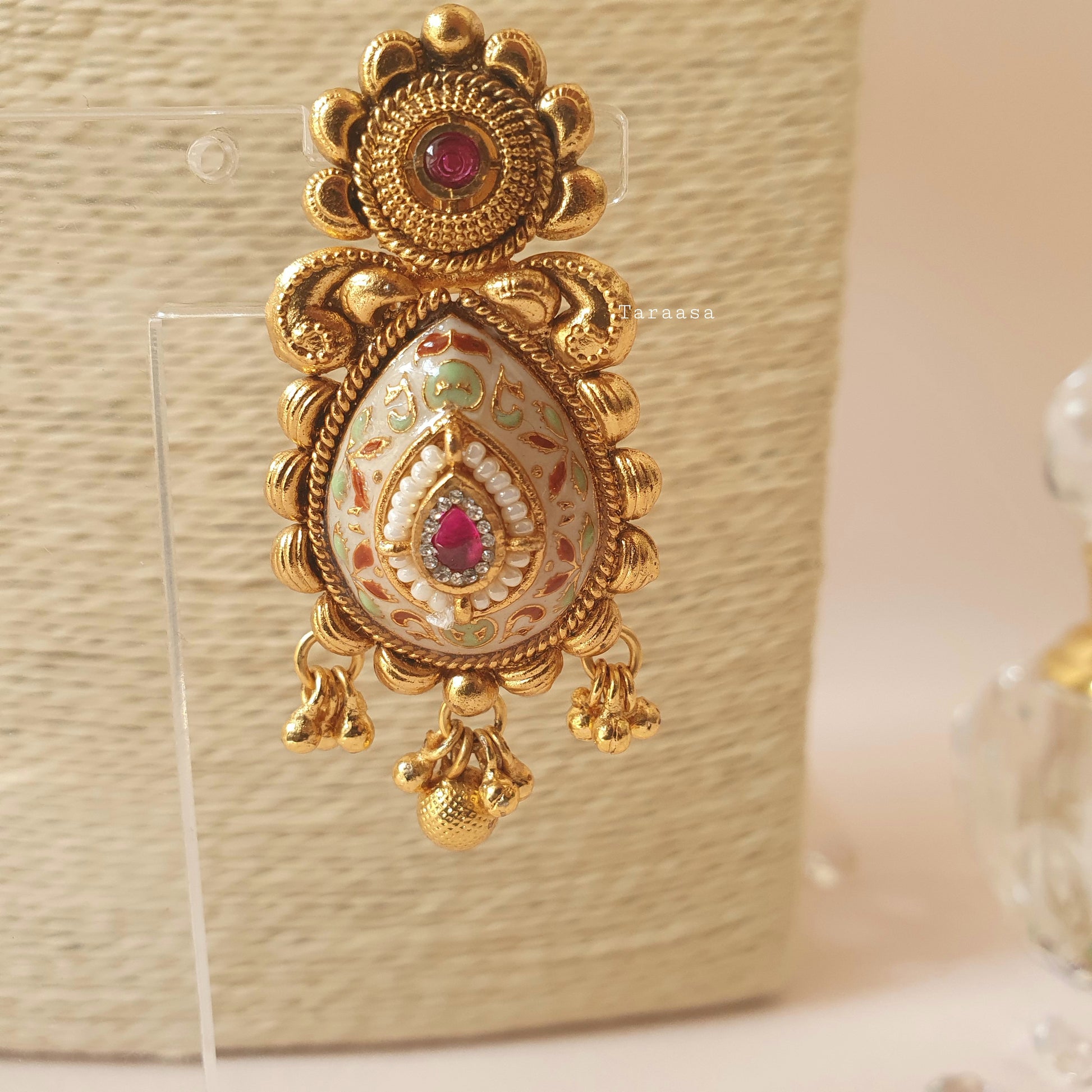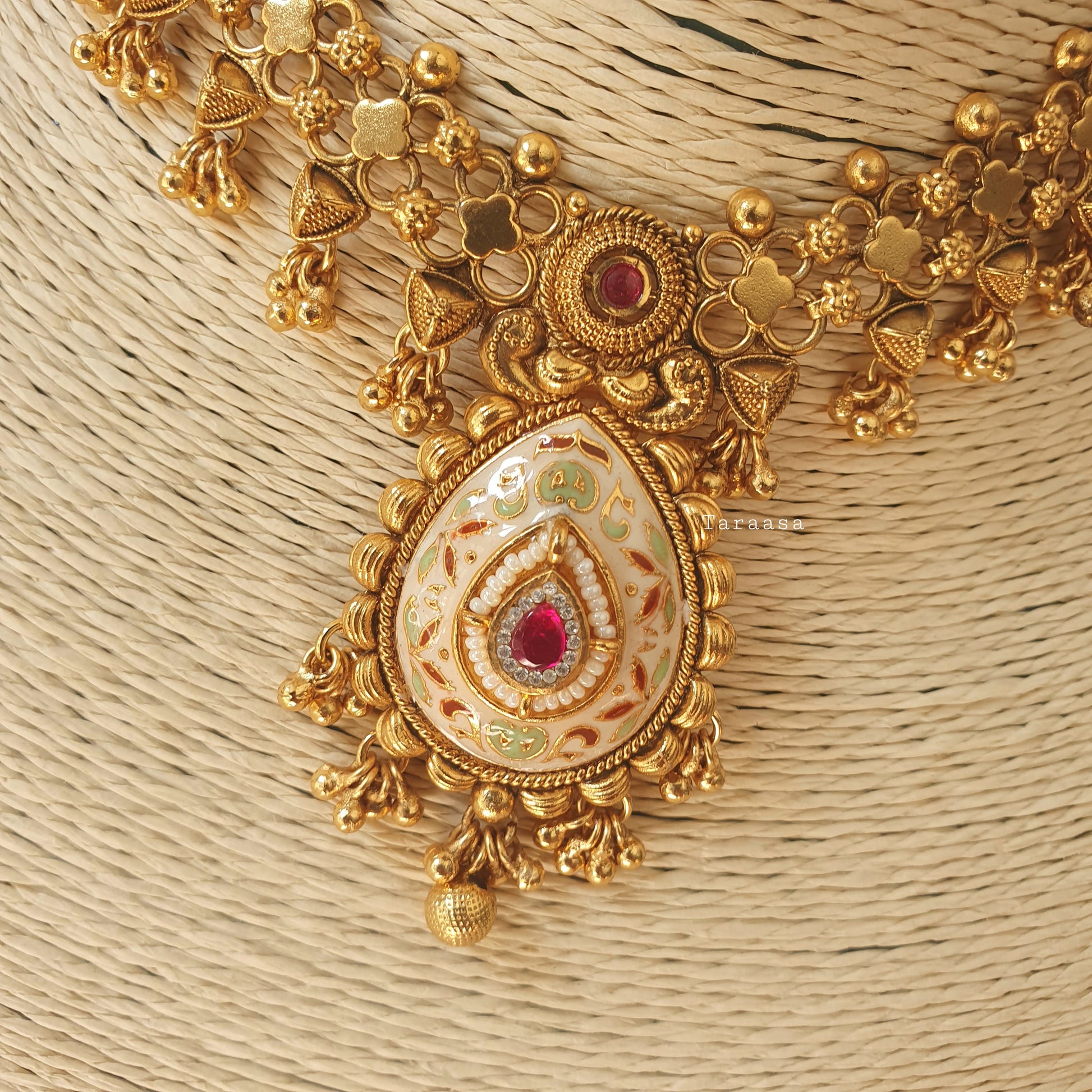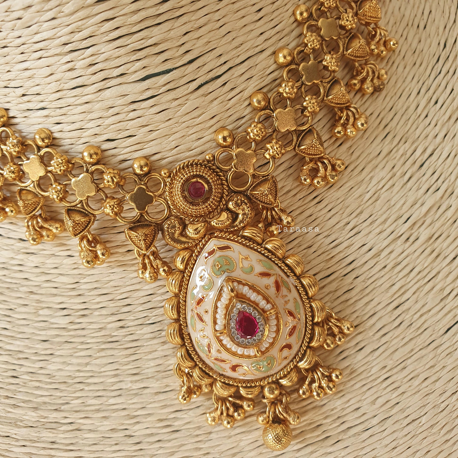 Timeless elegance, woven in gold. A regal South Indian choker from our Heritage Collection — intricately handcrafted with antique gold tones, hand painted pastel meenakari, and vibrant ruby accents. Perfect for the modern woman who cherishes tradition. Paired with the ornate meenakari statement earrings.