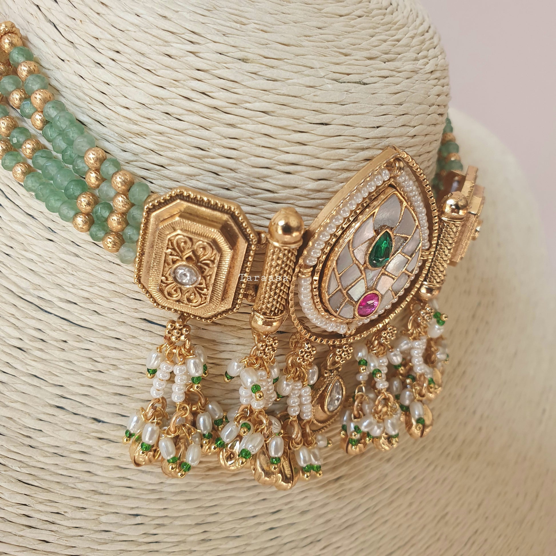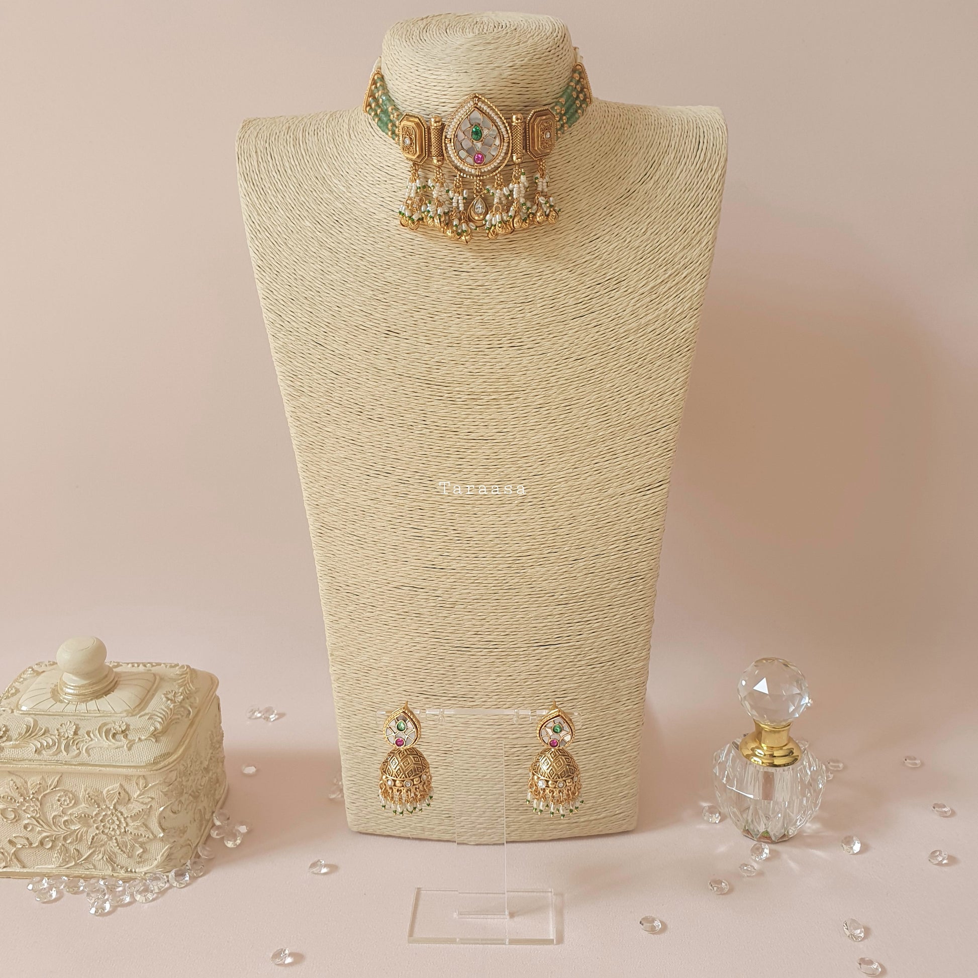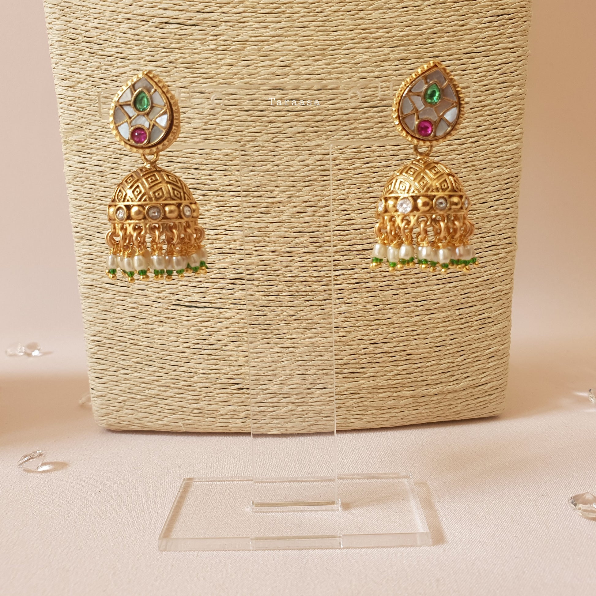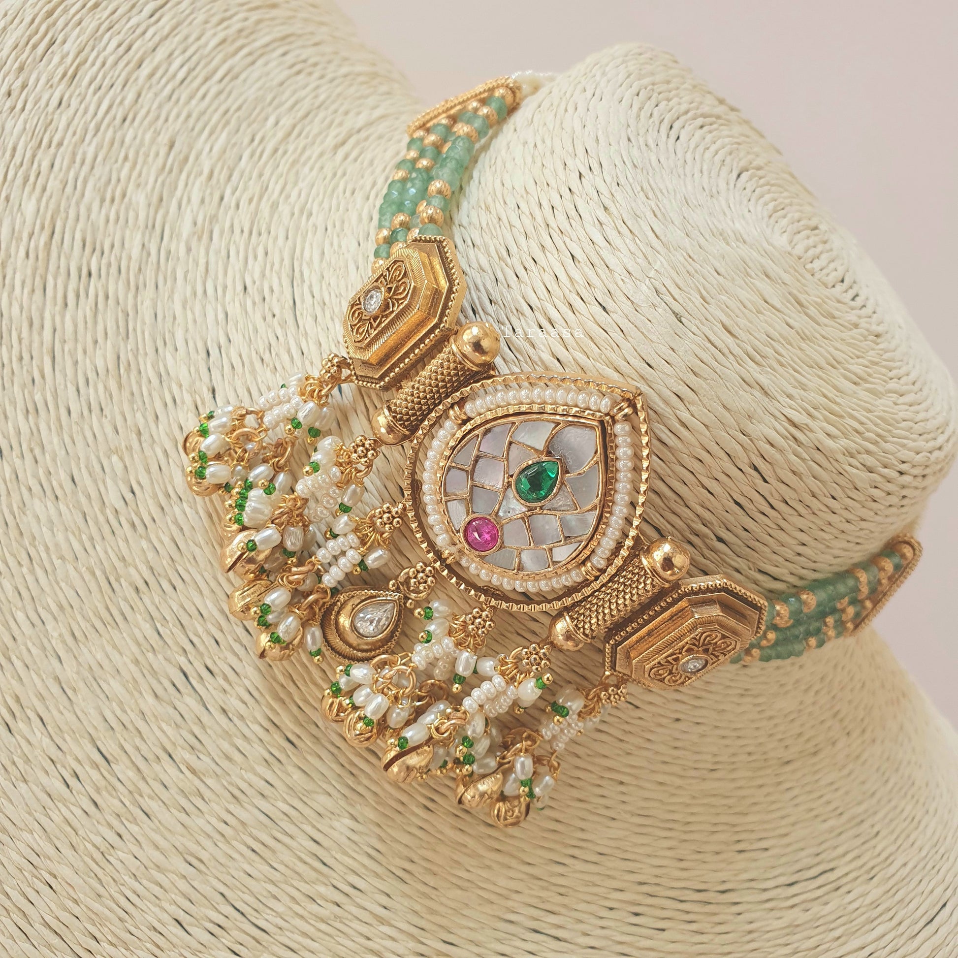A captivating fusion of South Indian and Mughal artistry, this exquisite set is steeped in royal elegance. Cascading rows of pearls and green crystal beads embrace a striking gold motif, crowned with a radiant mother of pearl centerpiece. Pearl edging and playful drops of gold and pearls bring movement and charm to every detail. Finished with a pair of enchanting jhumkis, this set is an elegant tribute to tradition with a fresh, timeless flair.