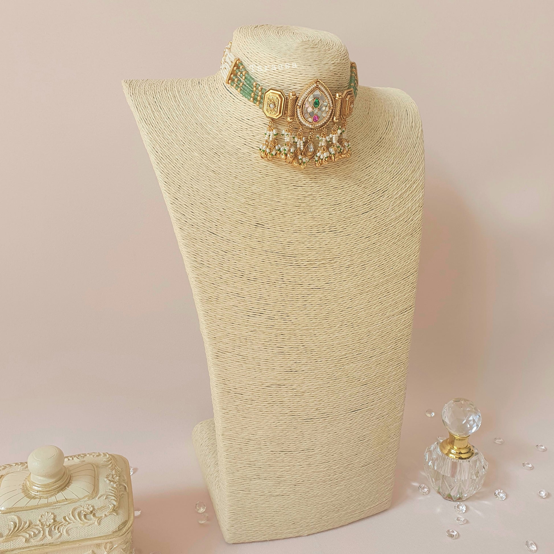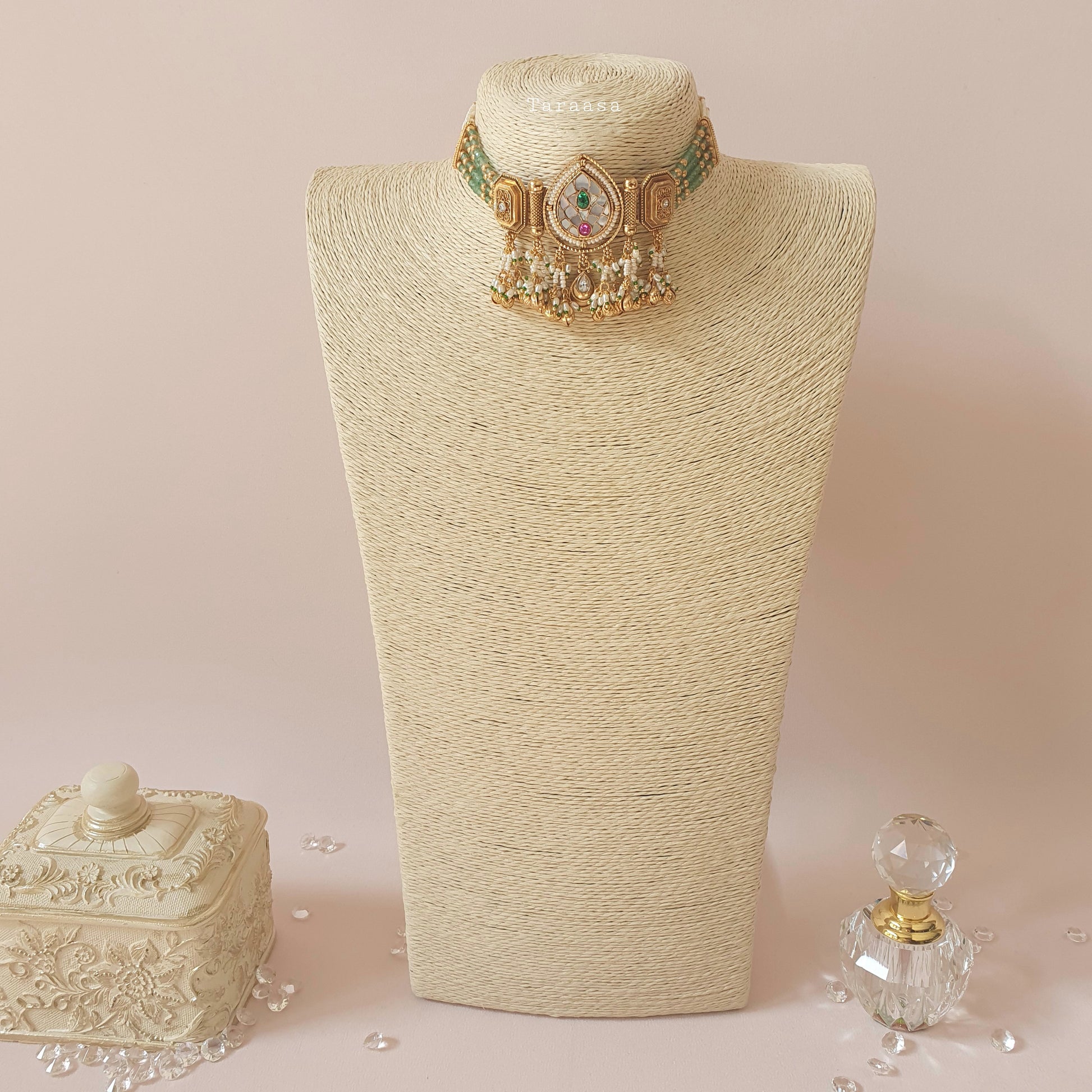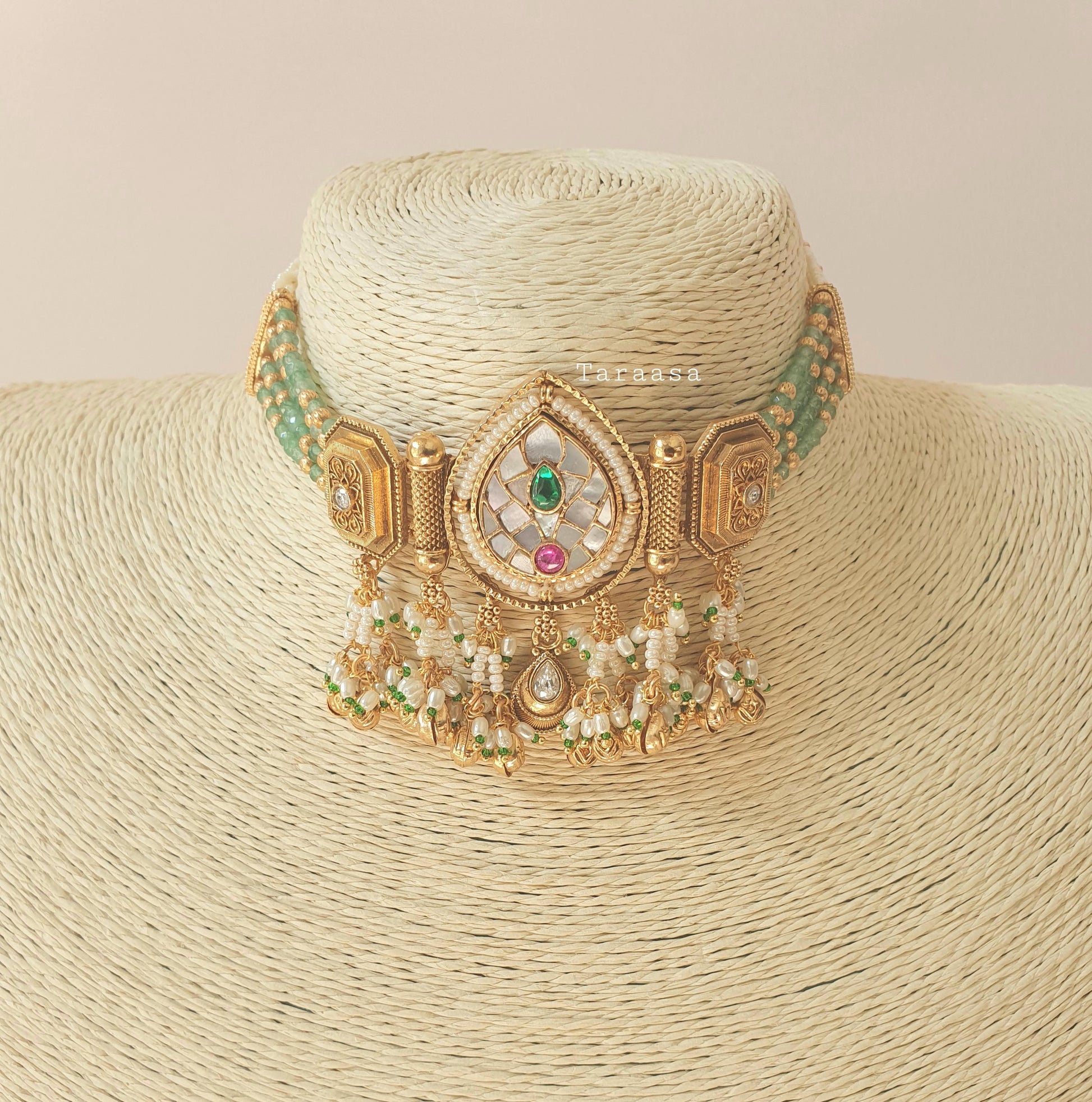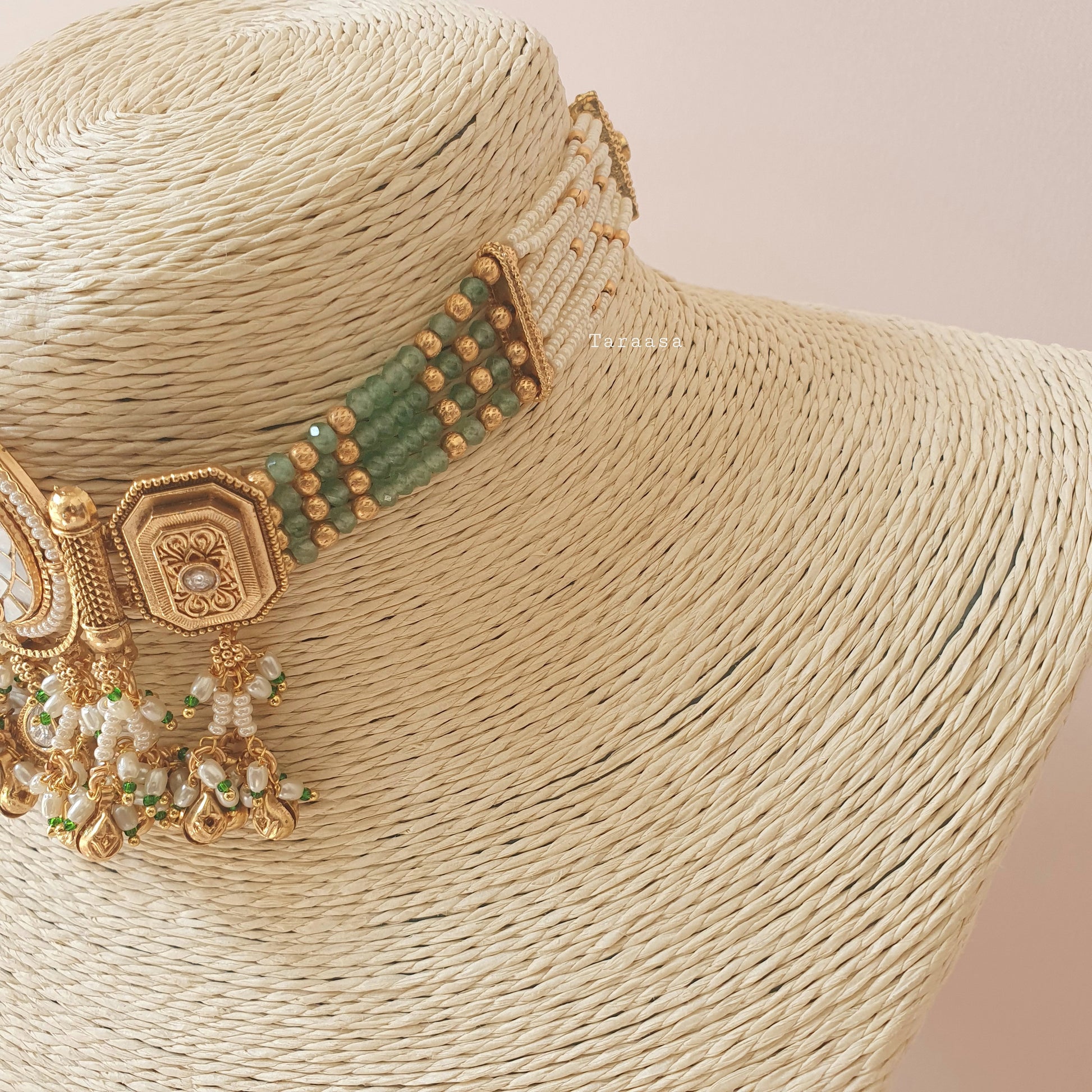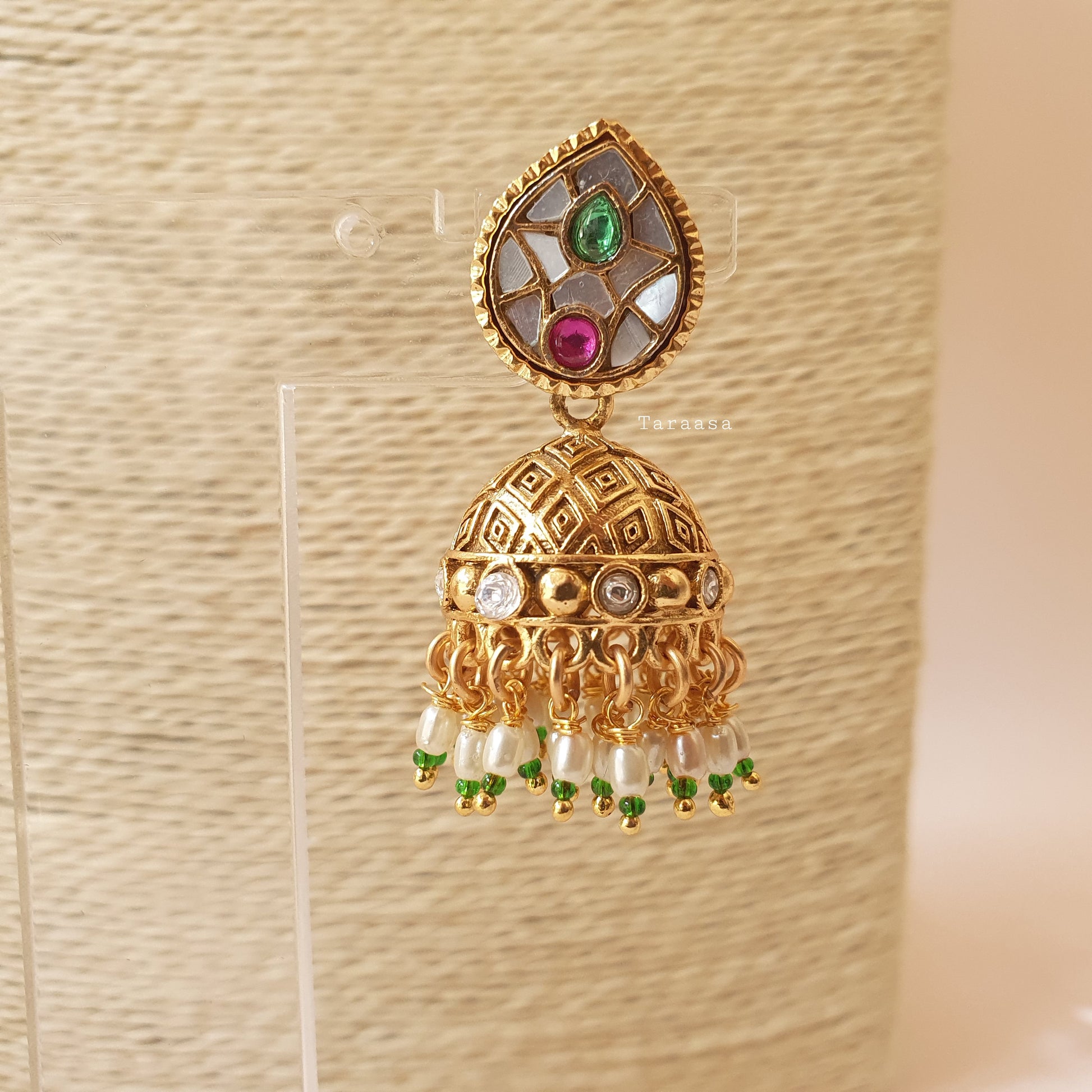 A captivating fusion of South Indian and Mughal artistry, this exquisite set is steeped in royal elegance. Cascading rows of pearls and green crystal beads embrace a striking gold motif, crowned with a radiant mother of pearl centerpiece. Pearl edging and playful drops of gold and pearls bring movement and charm to every detail. Finished with a pair of enchanting jhumkis, this set is an elegant tribute to tradition with a fresh, timeless flair.