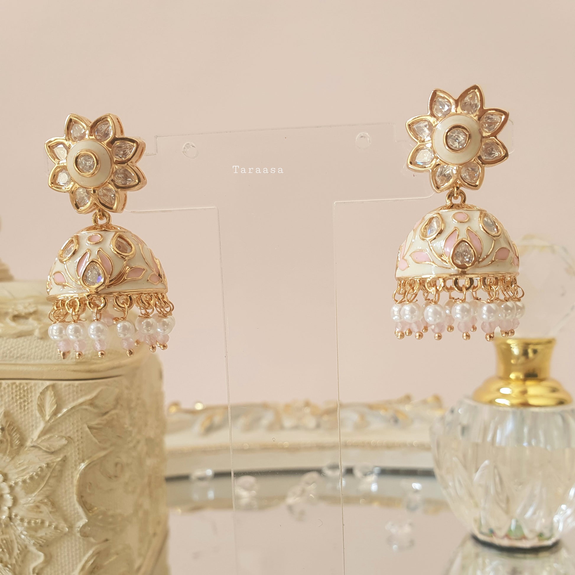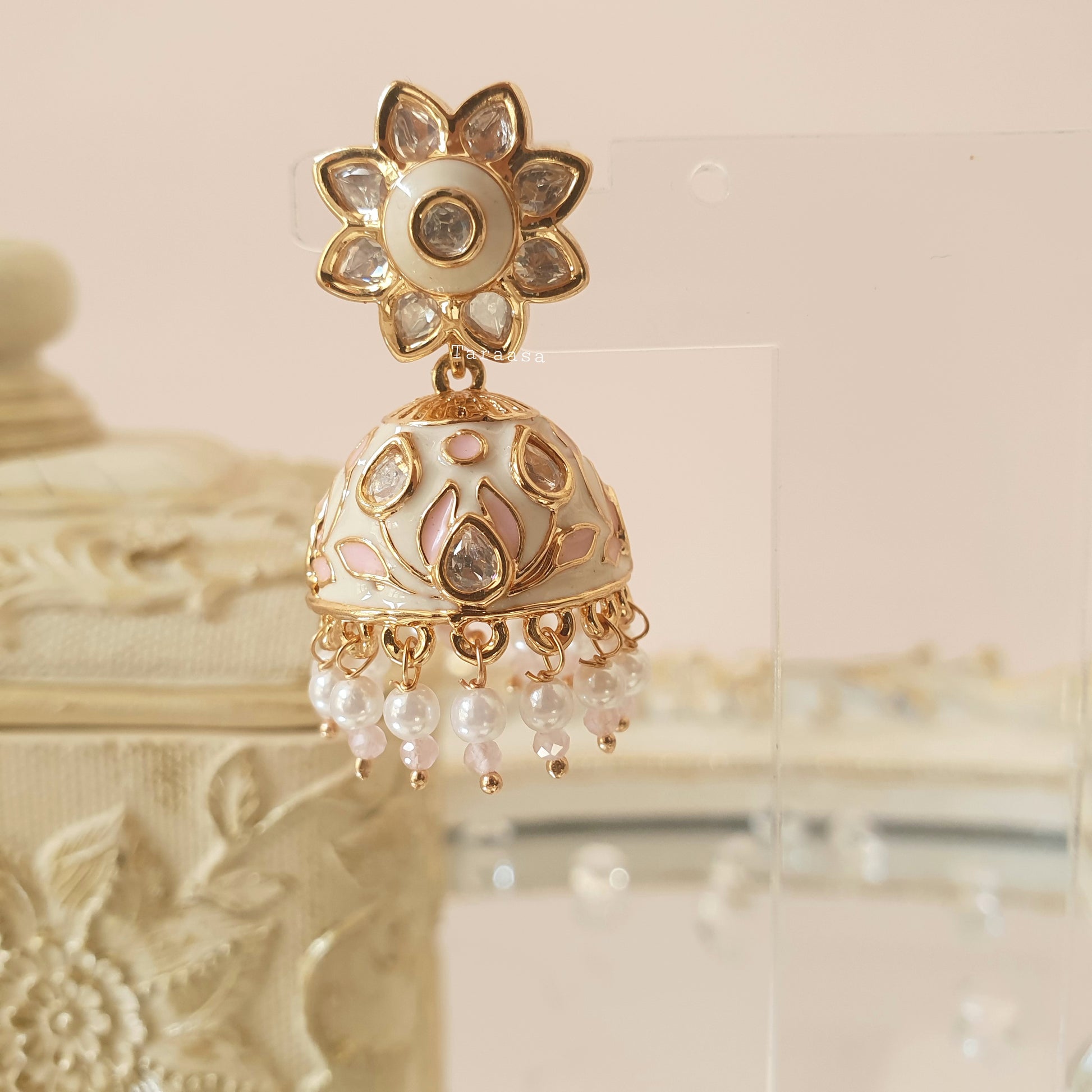These luxury hand-painted Meenakari jhumkis are where tradition becomes haute couture. Each dome is a canvas of vibrant enamel artistry, kissed with intricate detailing that echoes royal frescoes. Cascading below, lustrous pearl drops sway like moonlit chandeliers, while radiant Kundan stones crown the design in regal brilliance