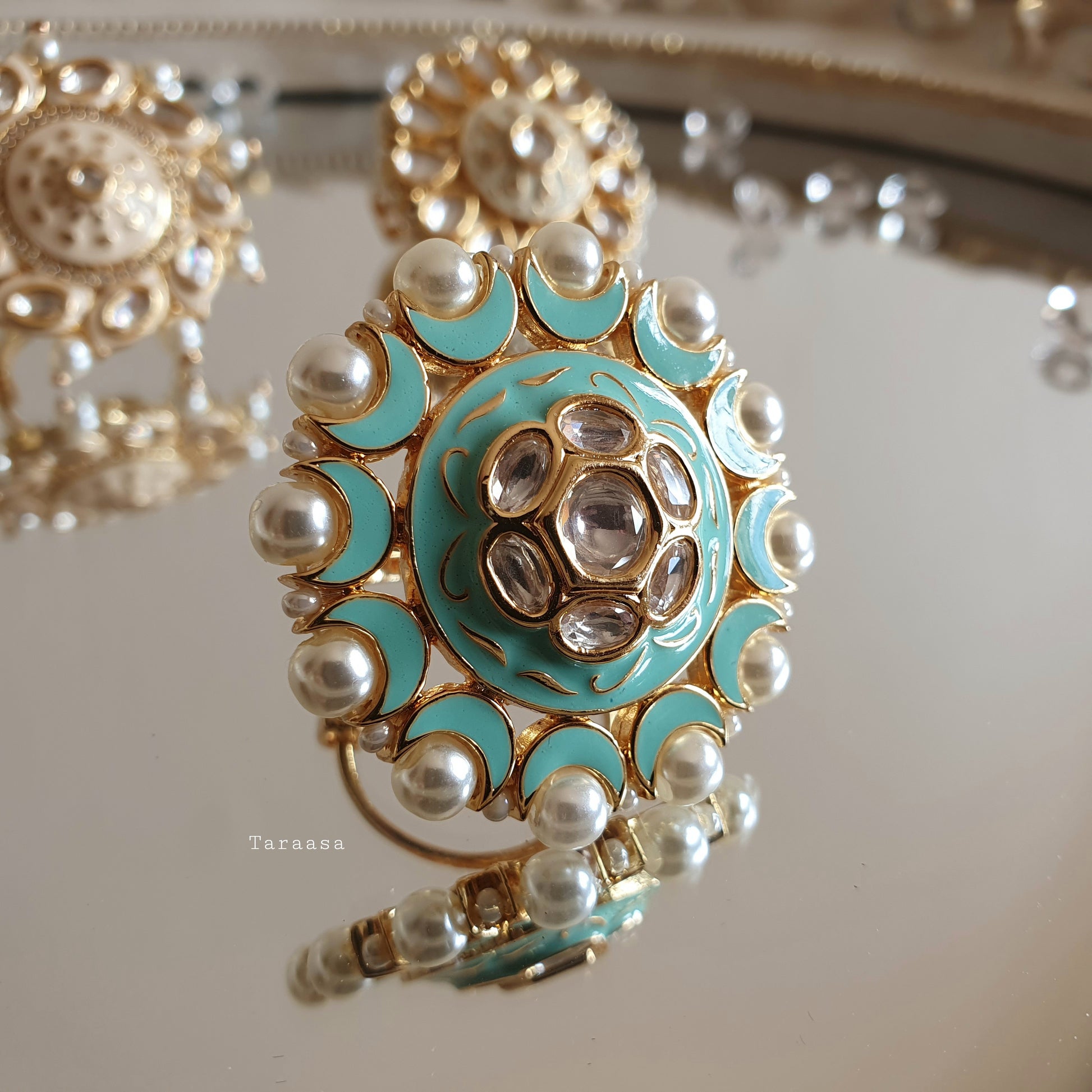 Turquoise meenakari and kundan ring with pearl detail with an adjustable backing to fit any size. Elegant and extravagant!