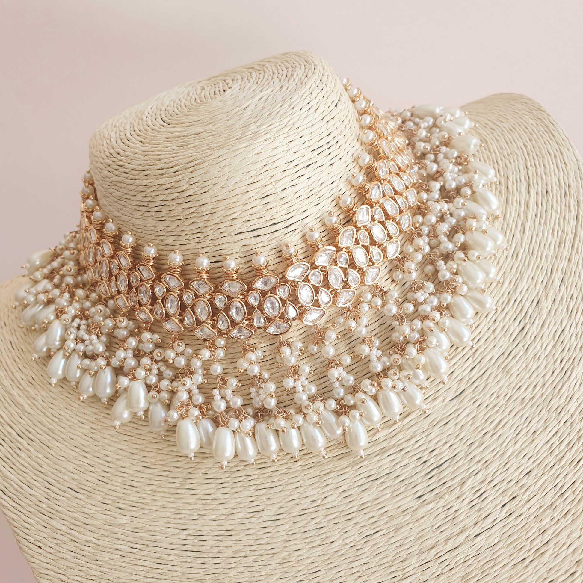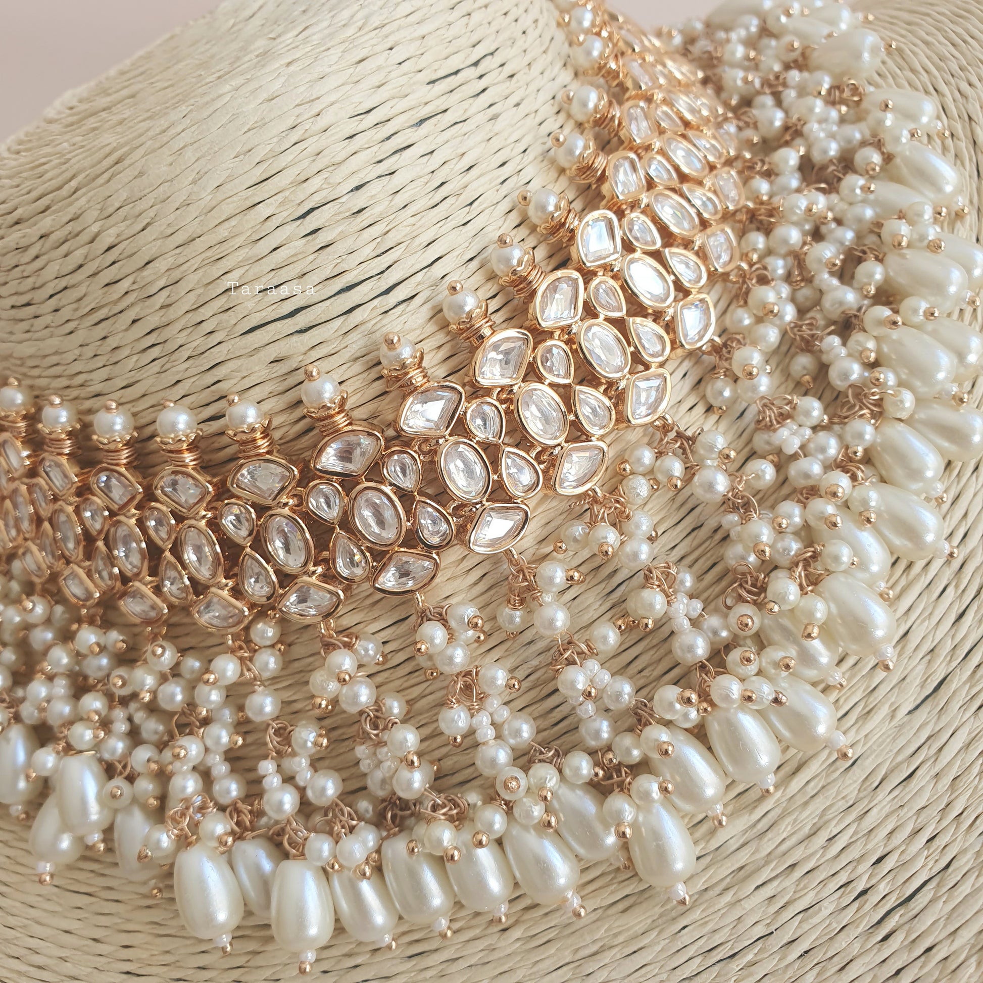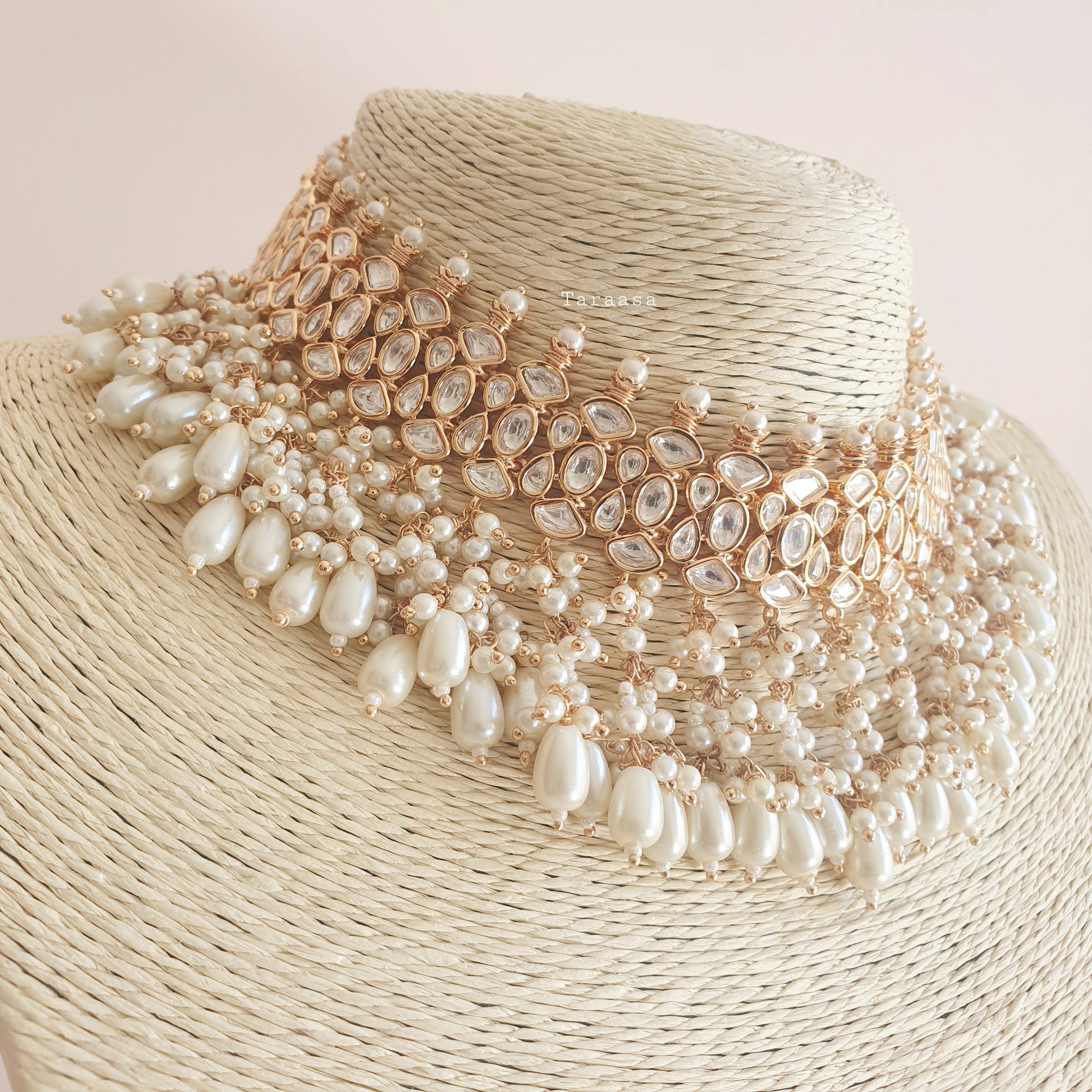 Serving all the exuberance that your bridal ensemble needs with this masterpiece bridal set, studded in quality kundan stones and carefully hand strung in layers and layers of pearls for unparalleled quality. The extravagant jumkhi earrings and large tikka bring this luxury bridal set together to cater to just what a millennial bride seeks!