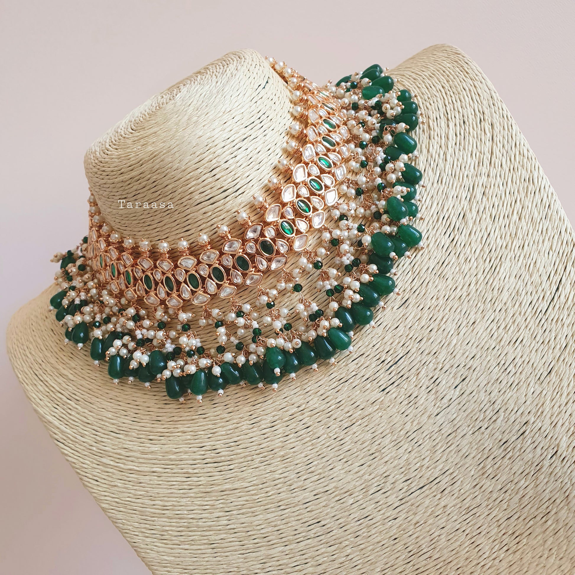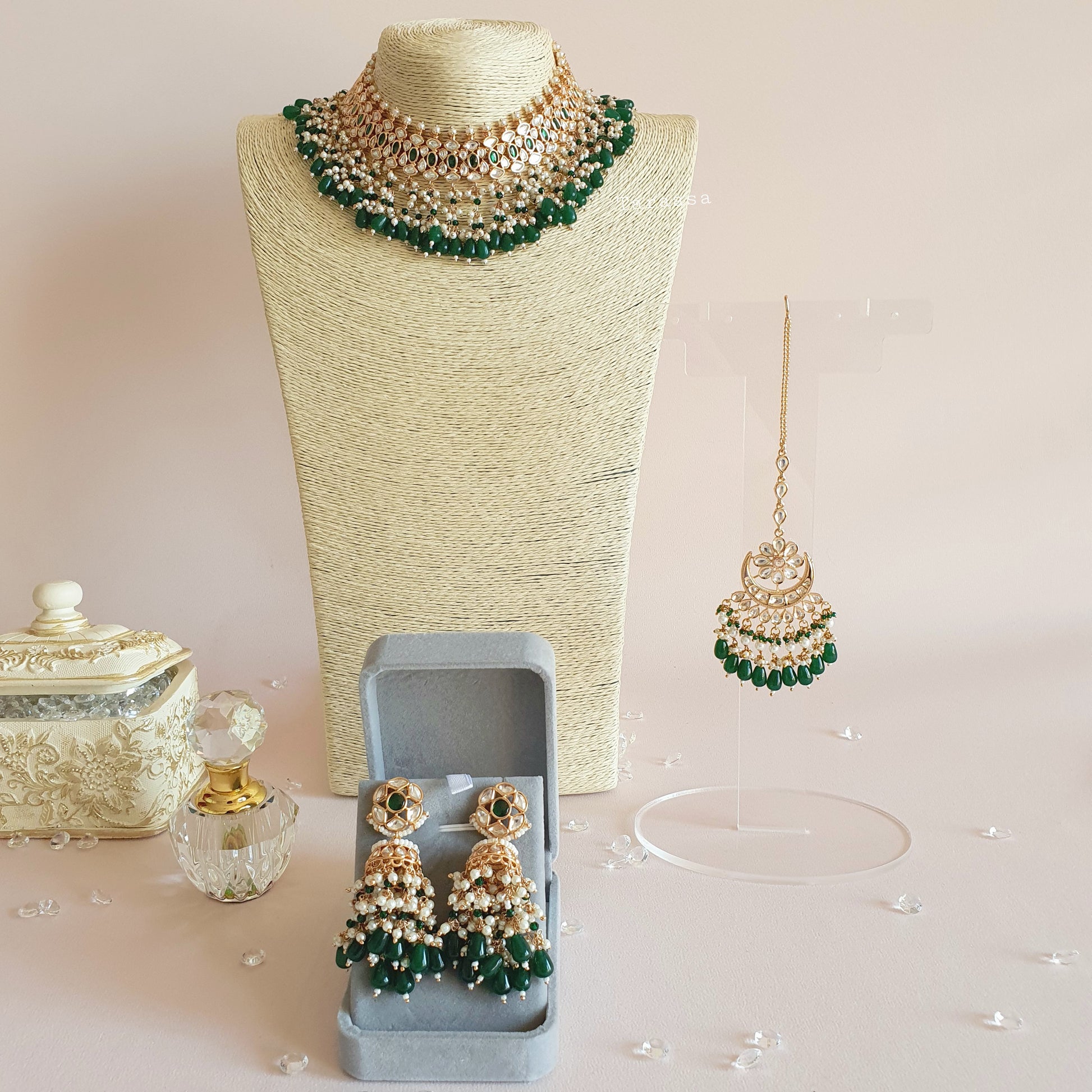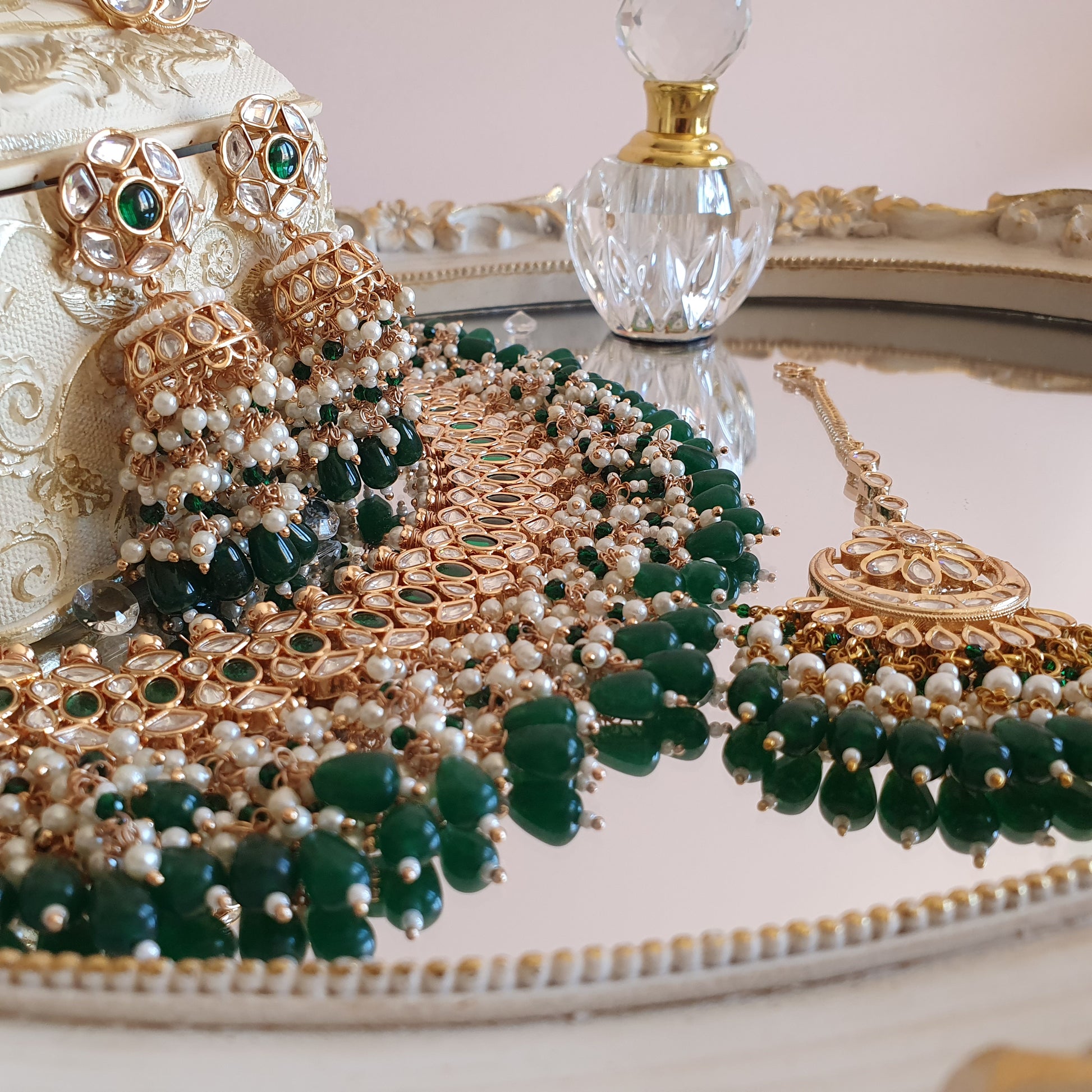 Serving all the exuberance that your bridal ensemble needs with this masterpiece bridal set, studded in quality kundan with alternating emerald crystals stones. It is carefully hand strung in pretty clusters of pearls and emerald crystal beads for unparalleled quality.