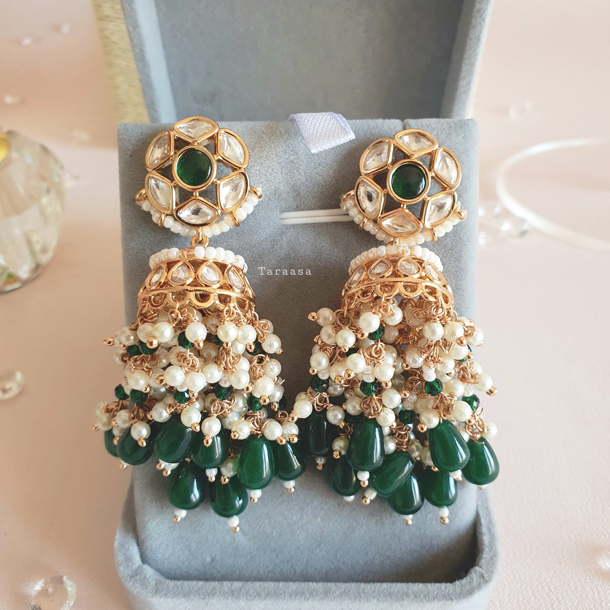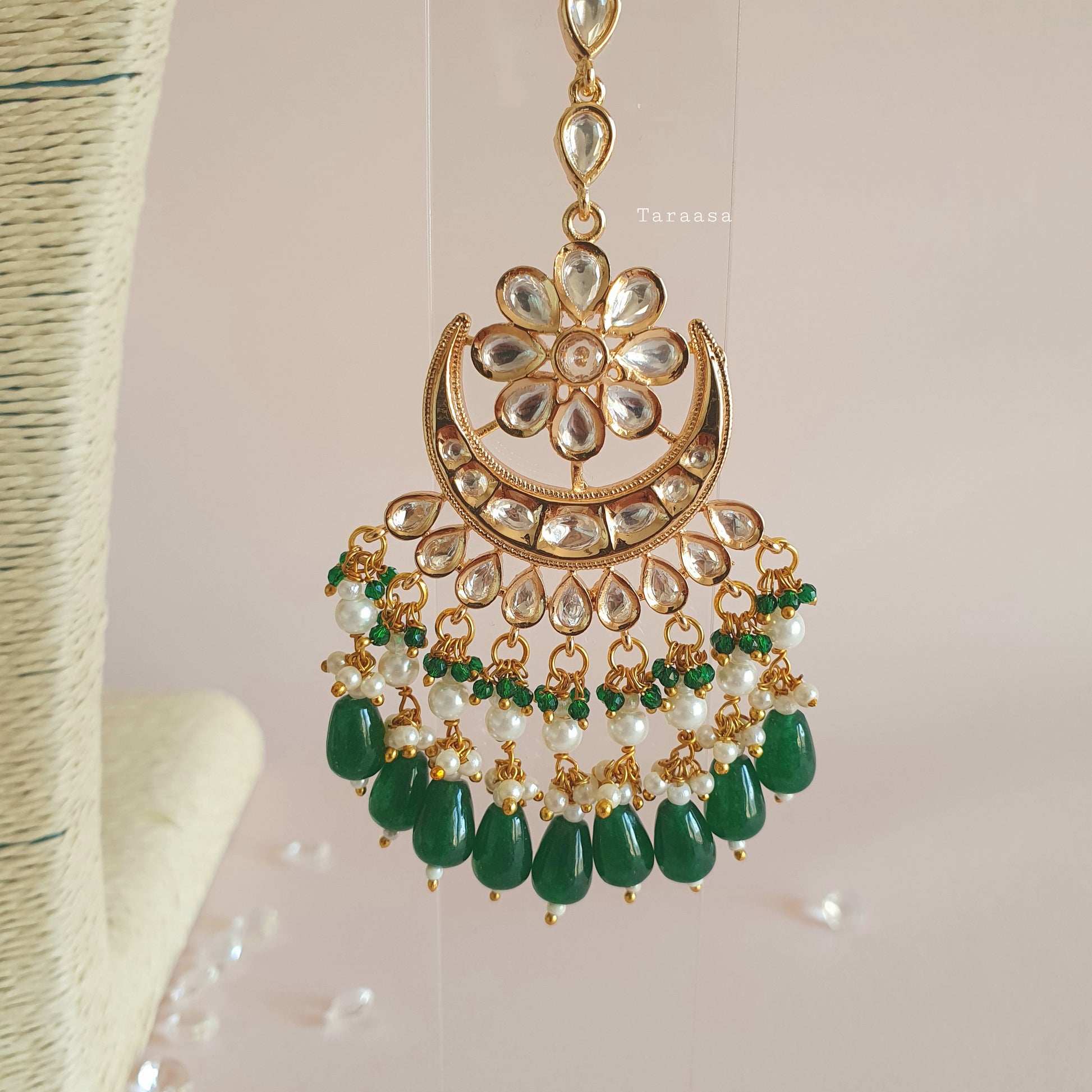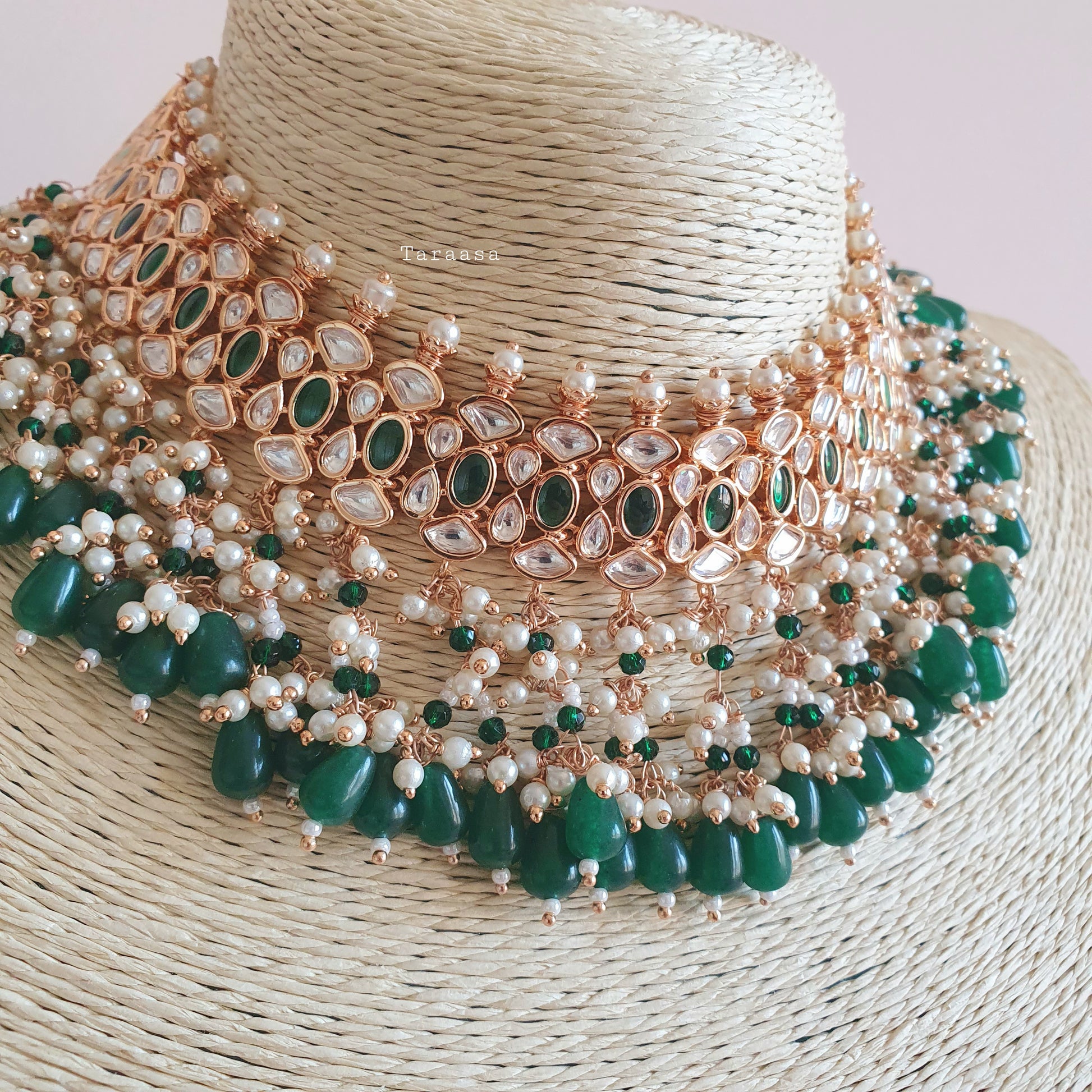 Serving all the exuberance that your bridal ensemble needs with this masterpiece bridal set, studded in quality kundan with alternating emerald crystals stones. It is carefully hand strung in pretty clusters of pearls and emerald crystal beads for unparalleled quality.