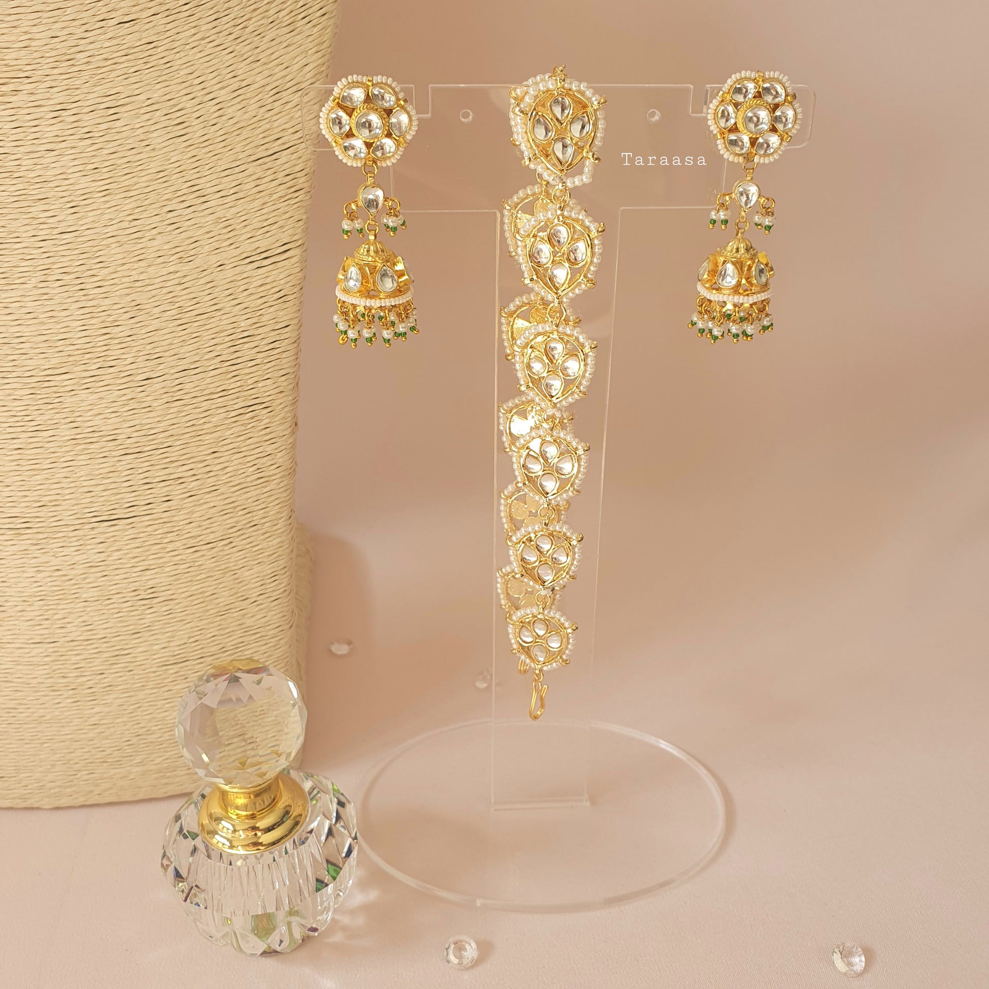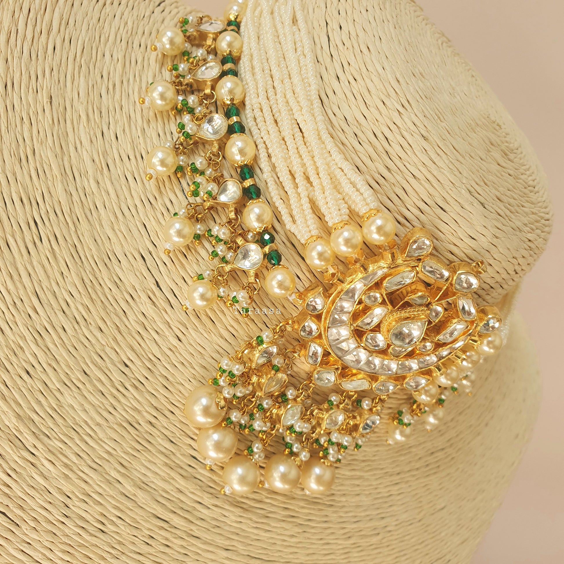 Timeless treasures, fit for a princess! Intricately crafted in a luxe gold, the finest kundan stones and pearls, this versatile set can be used with an array of eastern and western looks. The touch of green crystal beads elevates this piece. This set includes a choker, a pair of earrings and a sheeshpool, which can also be used as a choker. The grandeur of timeless jewels is here to stay!