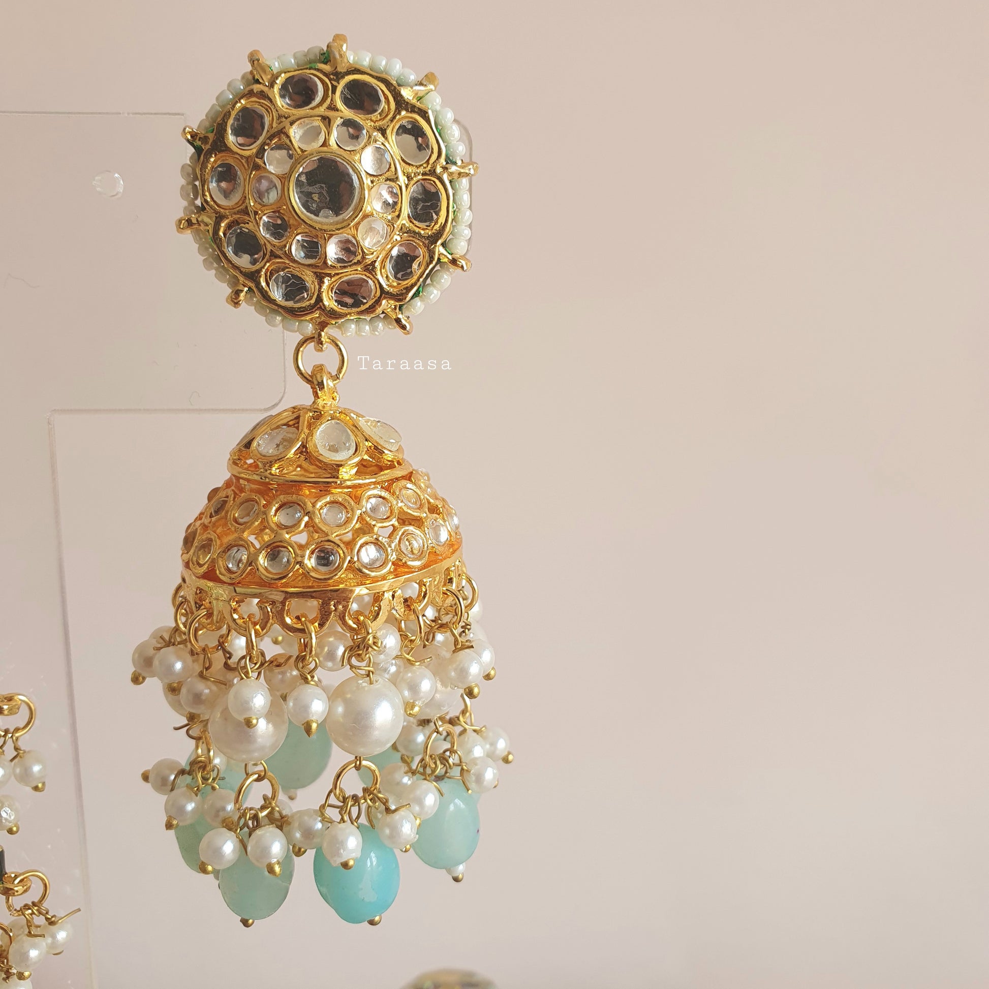 An artful harmony of kundan stones, elegant pearls and light blue beads will have you feeling whimsical and extravagant in these grand jumkhi and tikka sets.