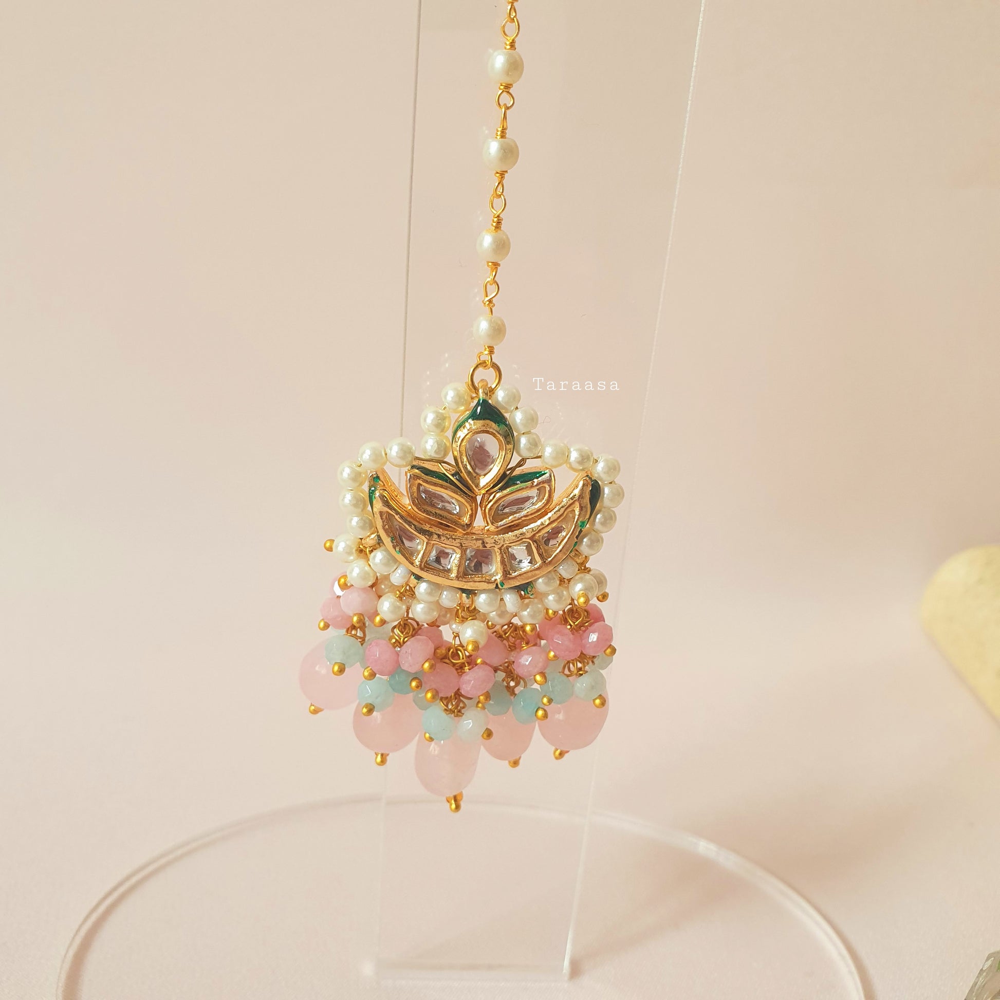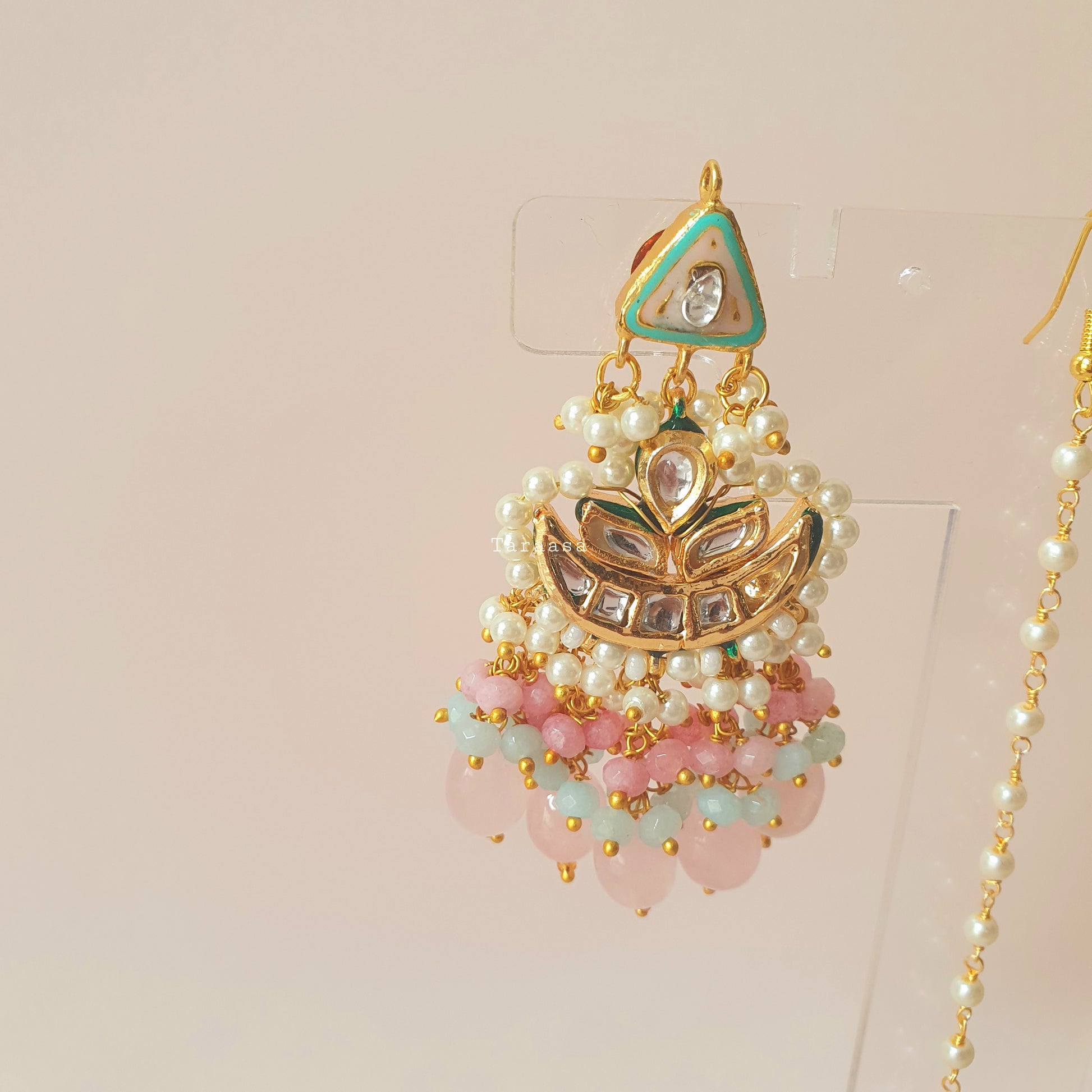 Ropes of the prettiest Aqua crystal stones come together at an exuberant hand-painted green meenakari centrepiece, accented with sparkling kundan stones and clusters of delicately hand-strung pearls and crystal beads in pink and blue. A single pink glass stone adds the perfect balance of colour, tying the entire design together.