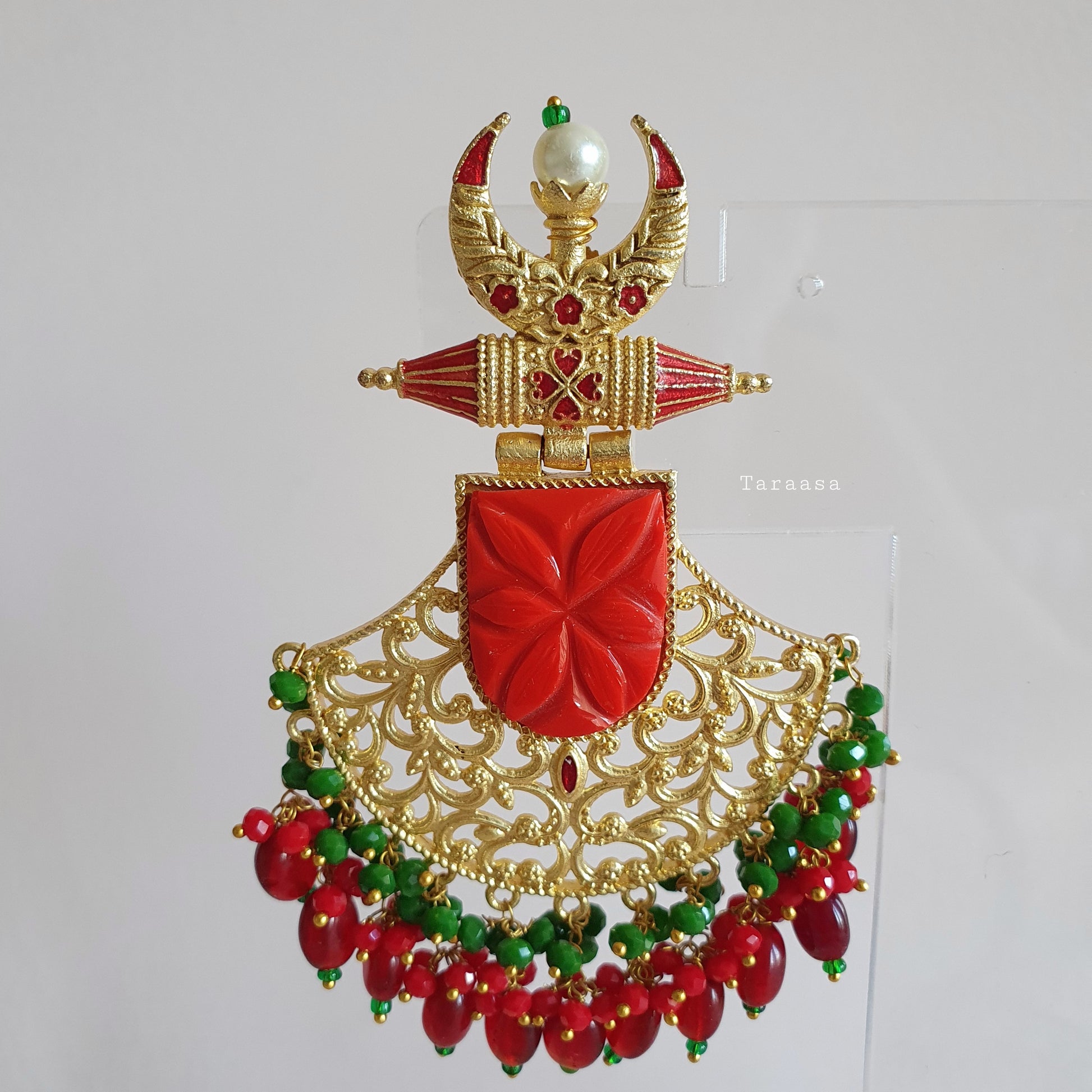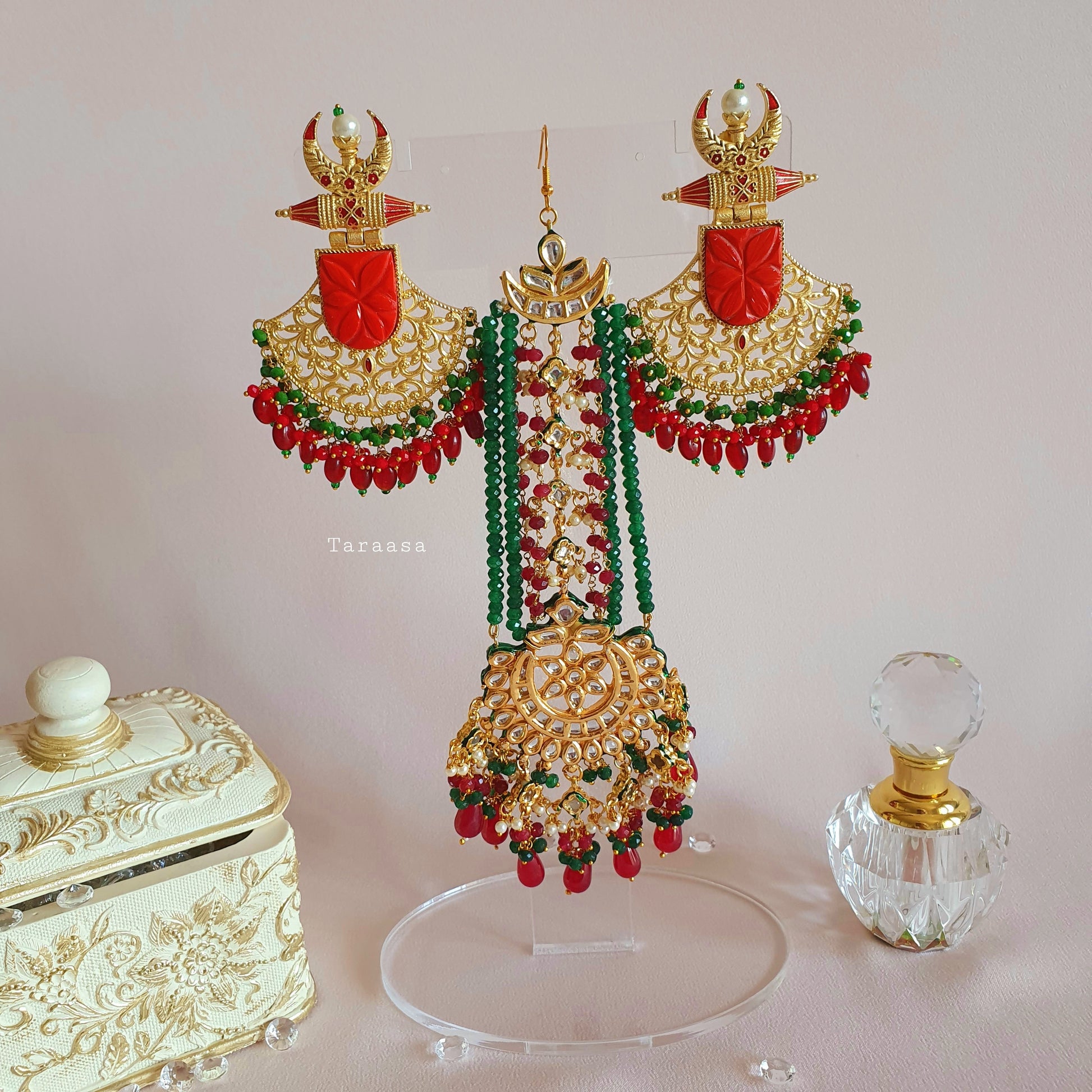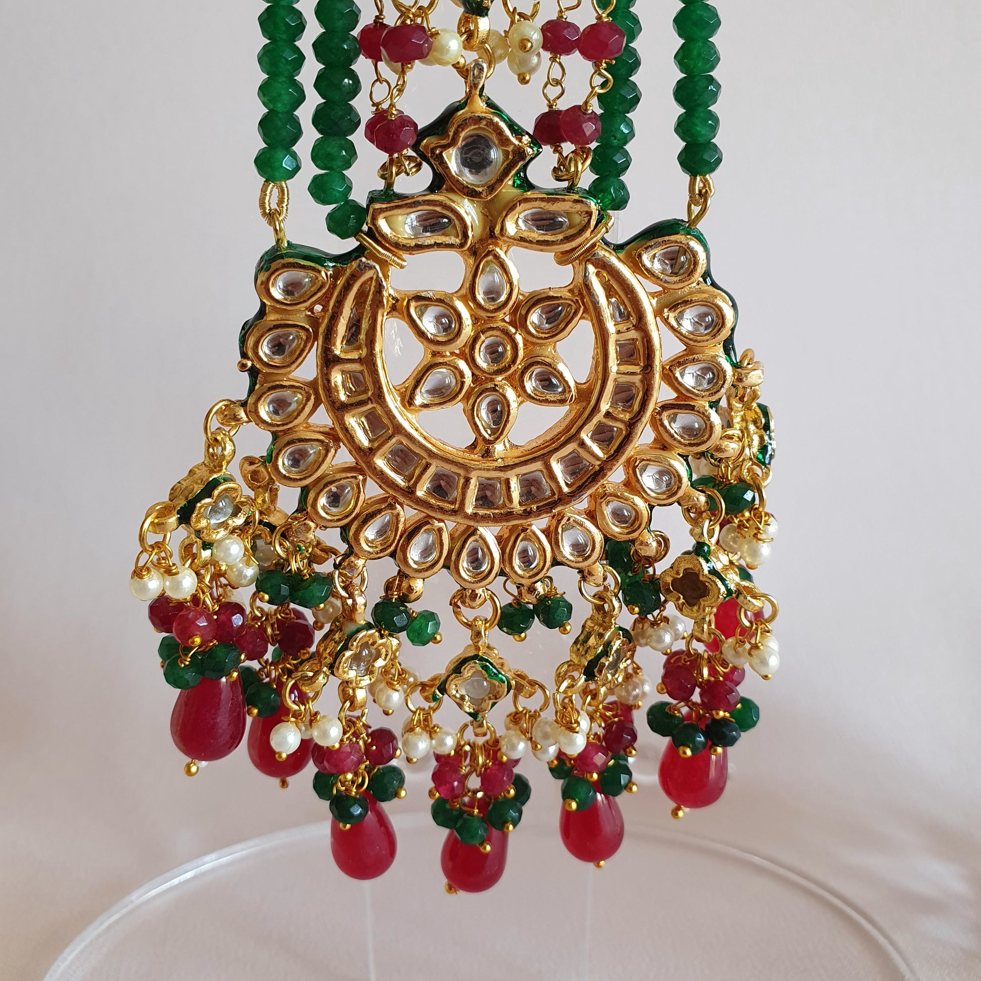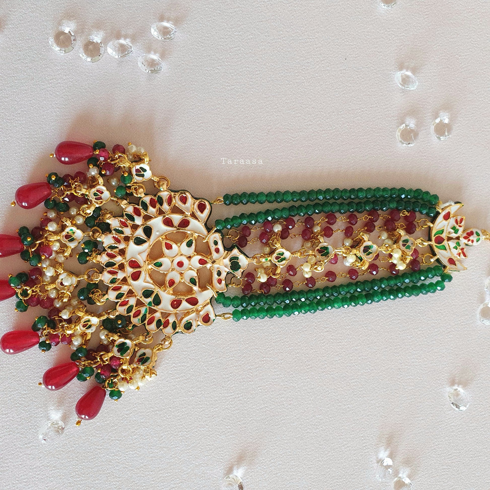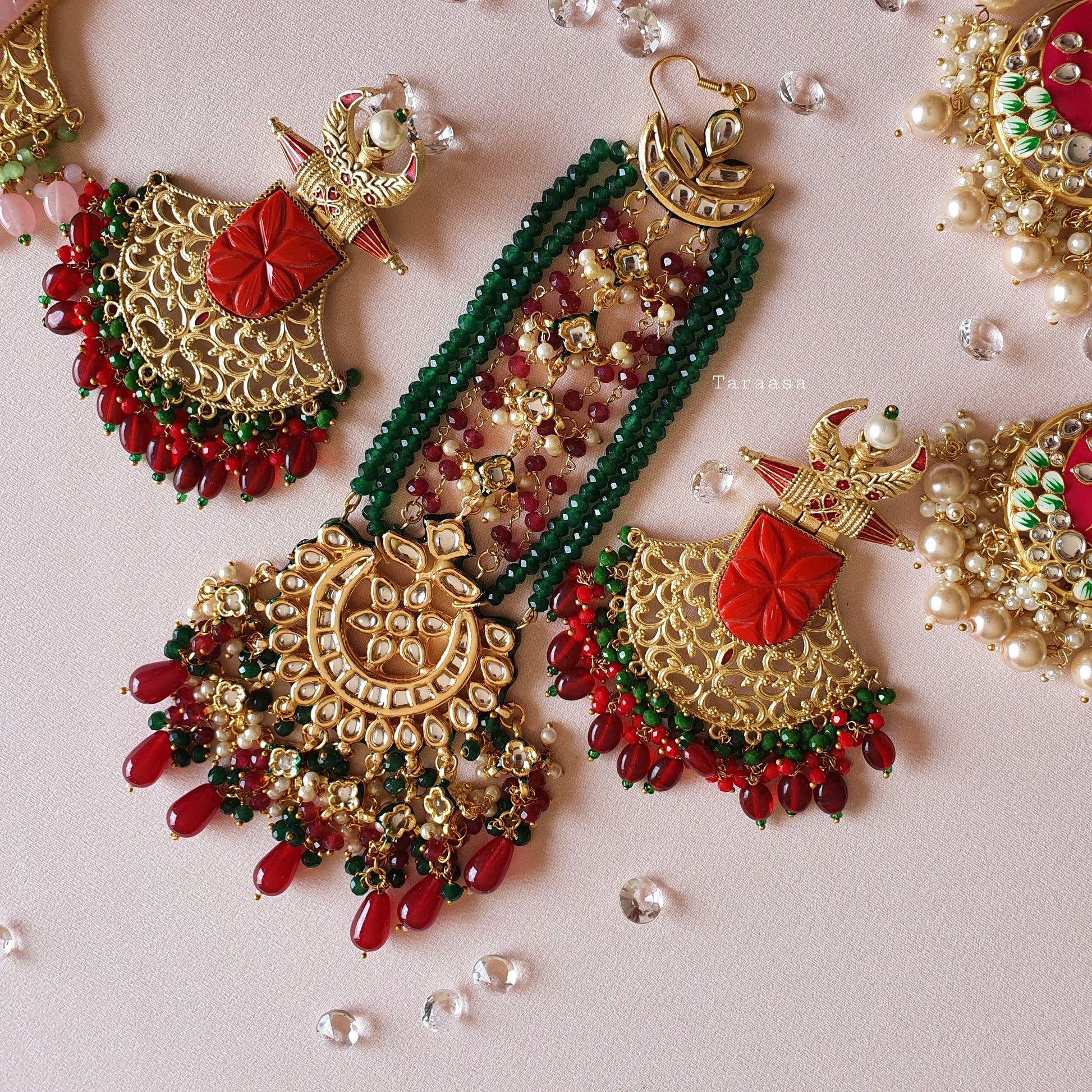 These gorgeous beaded passa tikka and earring sets are every bit the fabulousness you need to finish your look. Perfect as a semi-bridal set or for the guest, this is as extra as it comes! Exuberant colours of crystal beads with a hint of tiny pearls are set with exquisite kundan. The reverse side handpainted meenakari make these sets reversible and reusable time and time again.