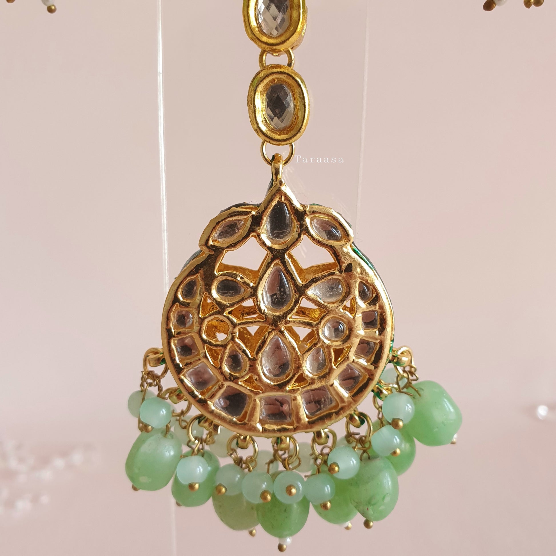 Set in a rich gold of quality floral kundan bordered with tiny pearls and carefully handstrung in pretty clusters of mint green beads, this kundan bridal set is traditional and glamorous.