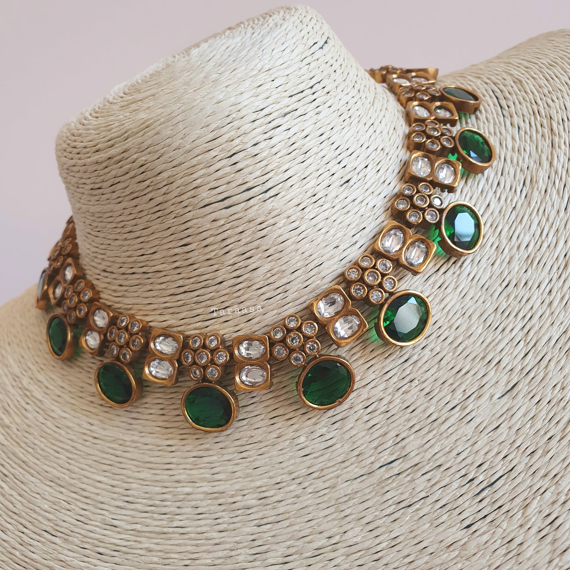 These dainty necklace sets are made of the highest quality moissanite stones, known to be more brilliant than diamonds. The prettiest florets are set in a dark gold with sparkling emerald crystal drops. This elegant piece will surely turn heads and comes with a matching pair of earrings, perfect to also be worn on their own.