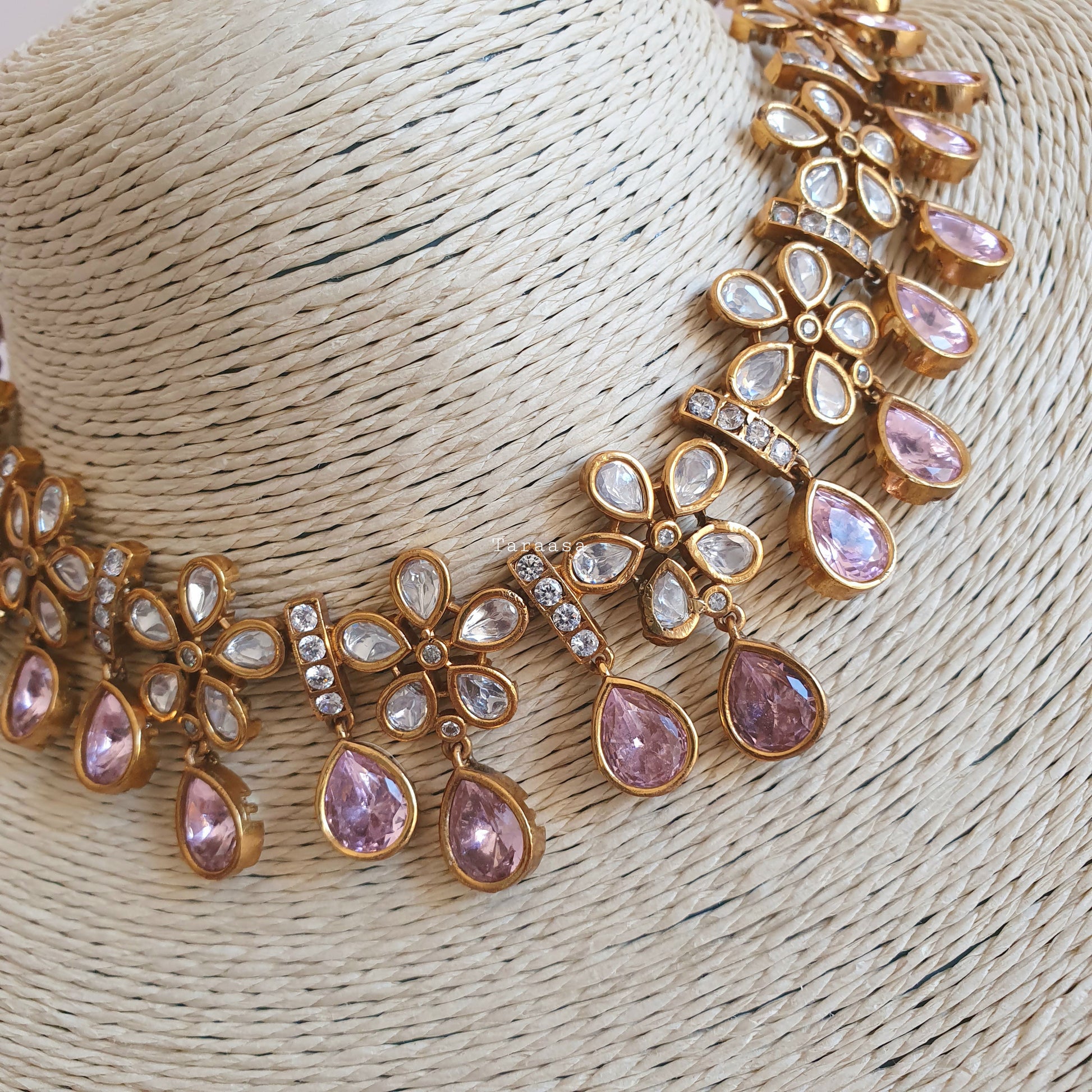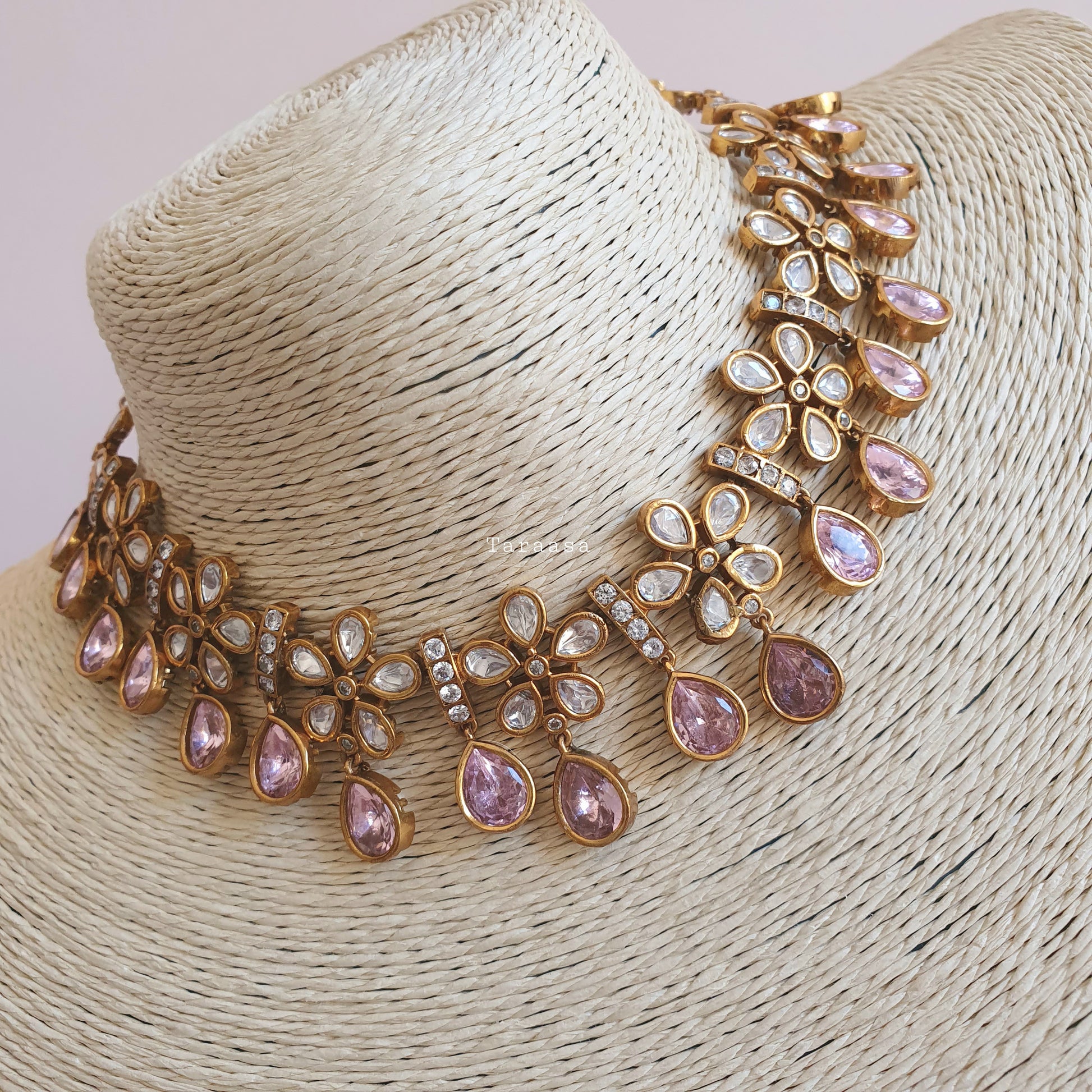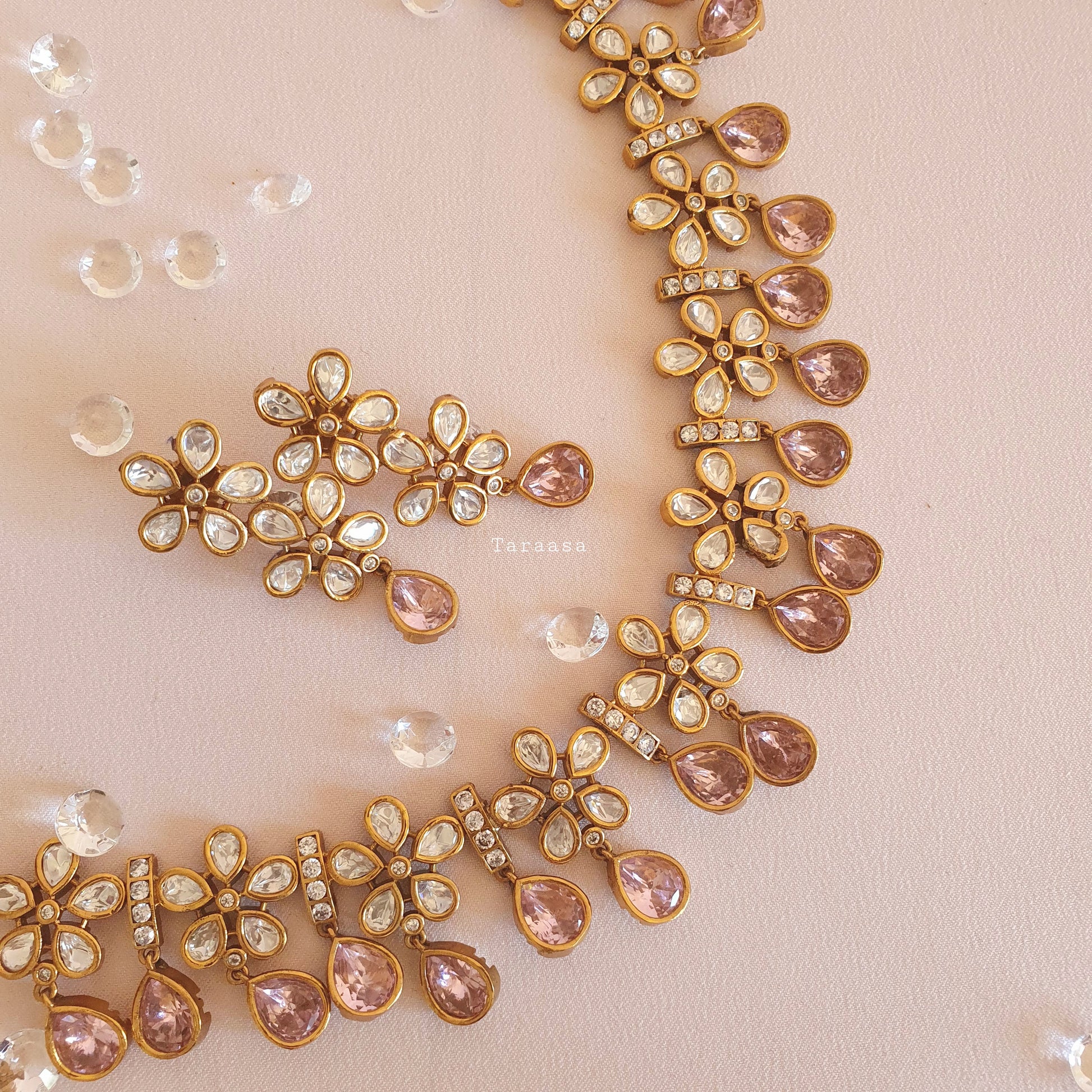 These dainty necklace sets are made of the highest quality moissanite stones, known to be more brilliant than diamonds. The prettiest florets are set in gold with sparkling pink drops. This elegant piece will surely turn heads and comes with a matching pair of earrings, perfect to also be worn on their own.