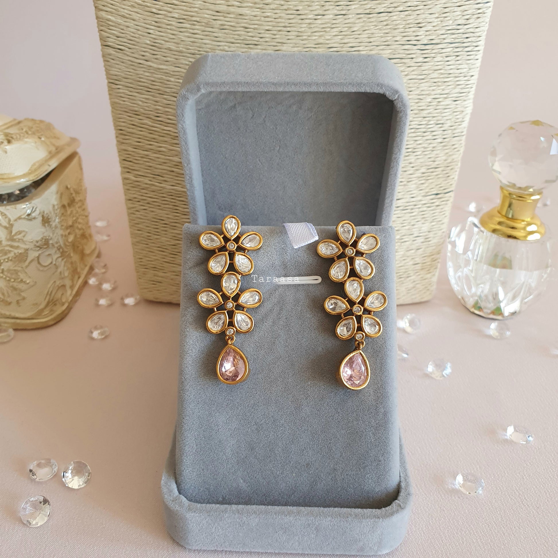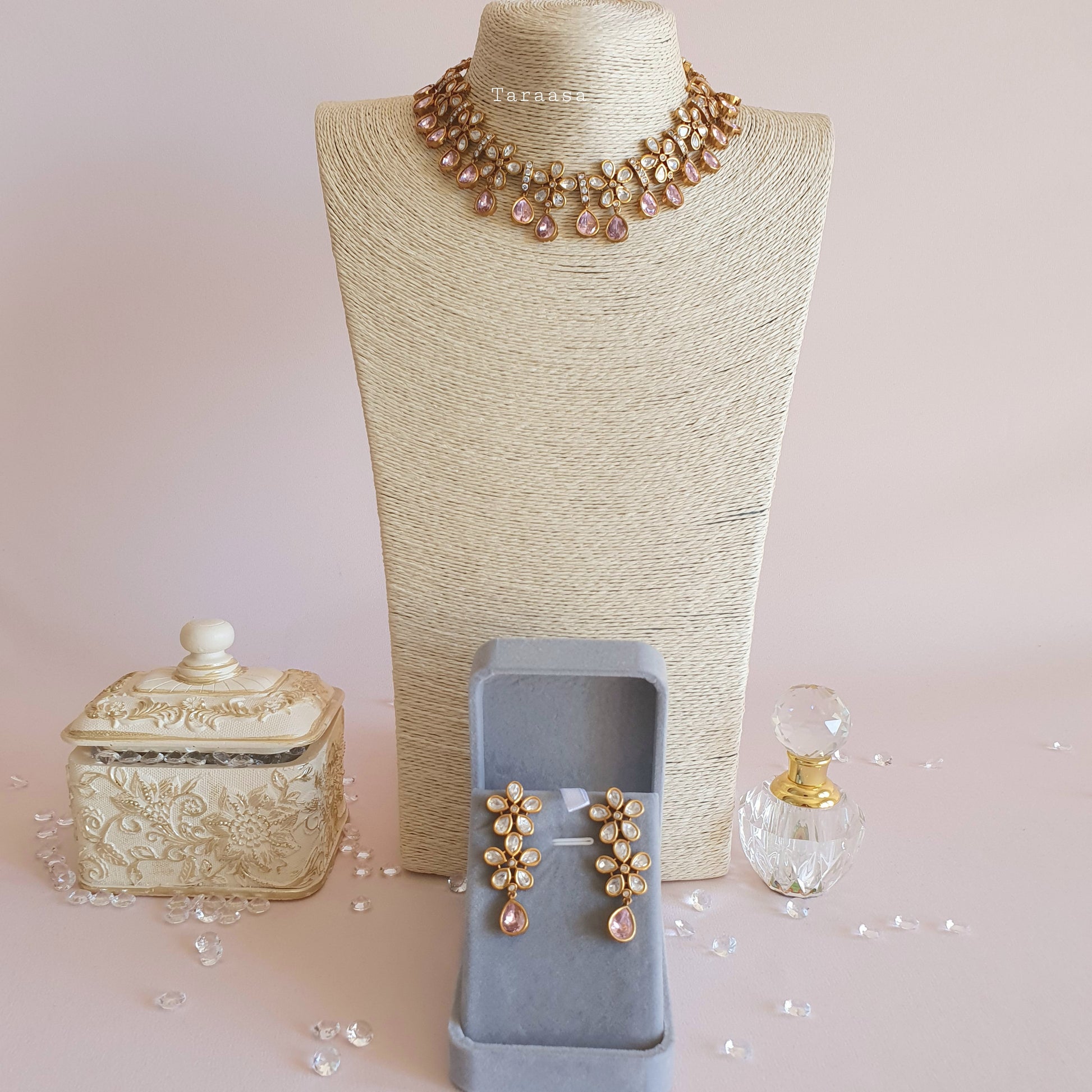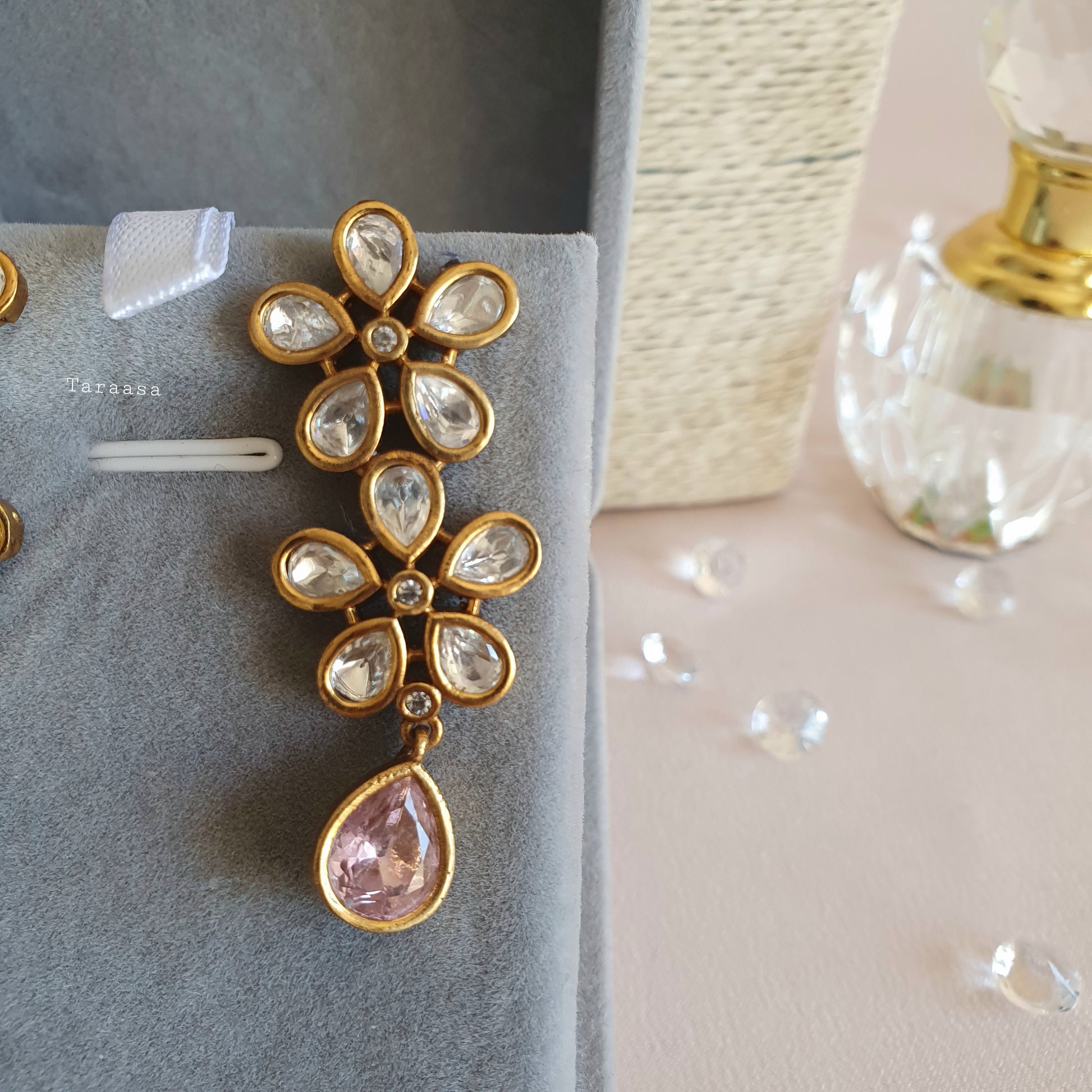 These dainty necklace sets are made of the highest quality moissanite stones, known to be more brilliant than diamonds. The prettiest florets are set in gold with sparkling pink drops. This elegant piece will surely turn heads and comes with a matching pair of earrings, perfect to also be worn on their own.