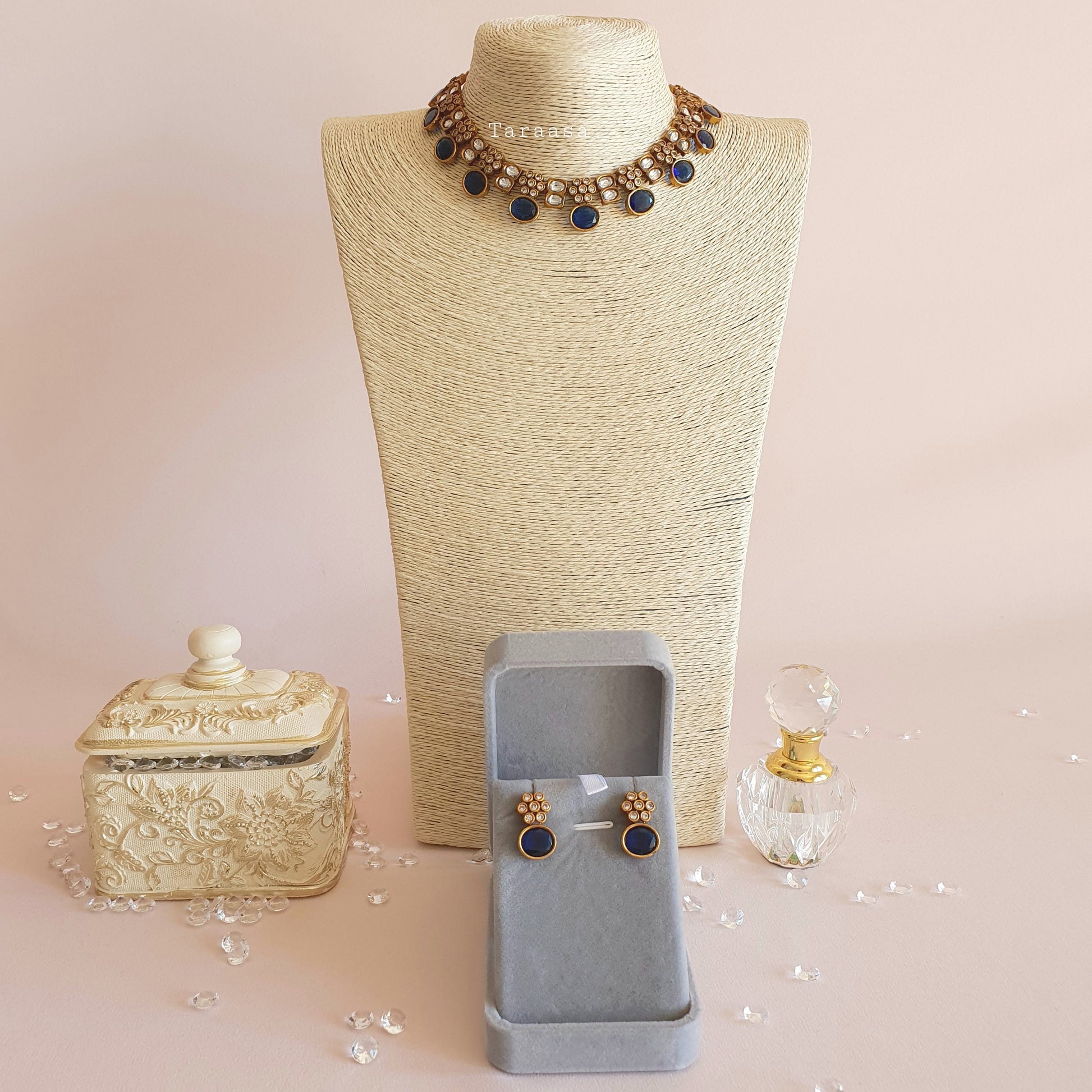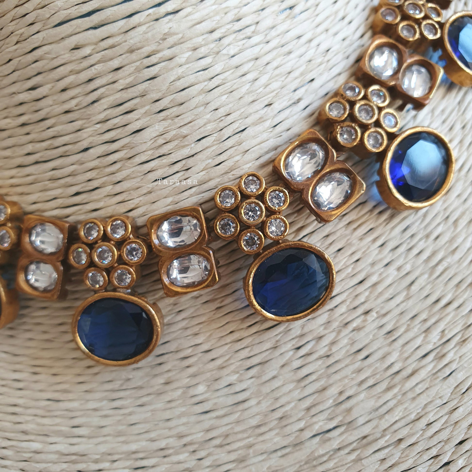 These dainty necklace sets are made of the highest quality moissanite stones, known to be more brilliant than diamonds. The prettiest florets are set in a dark gold with sparkling sapphire crystal drops. This elegant piece will surely turn heads and comes with a matching pair of earrings, perfect to also be worn on their own.