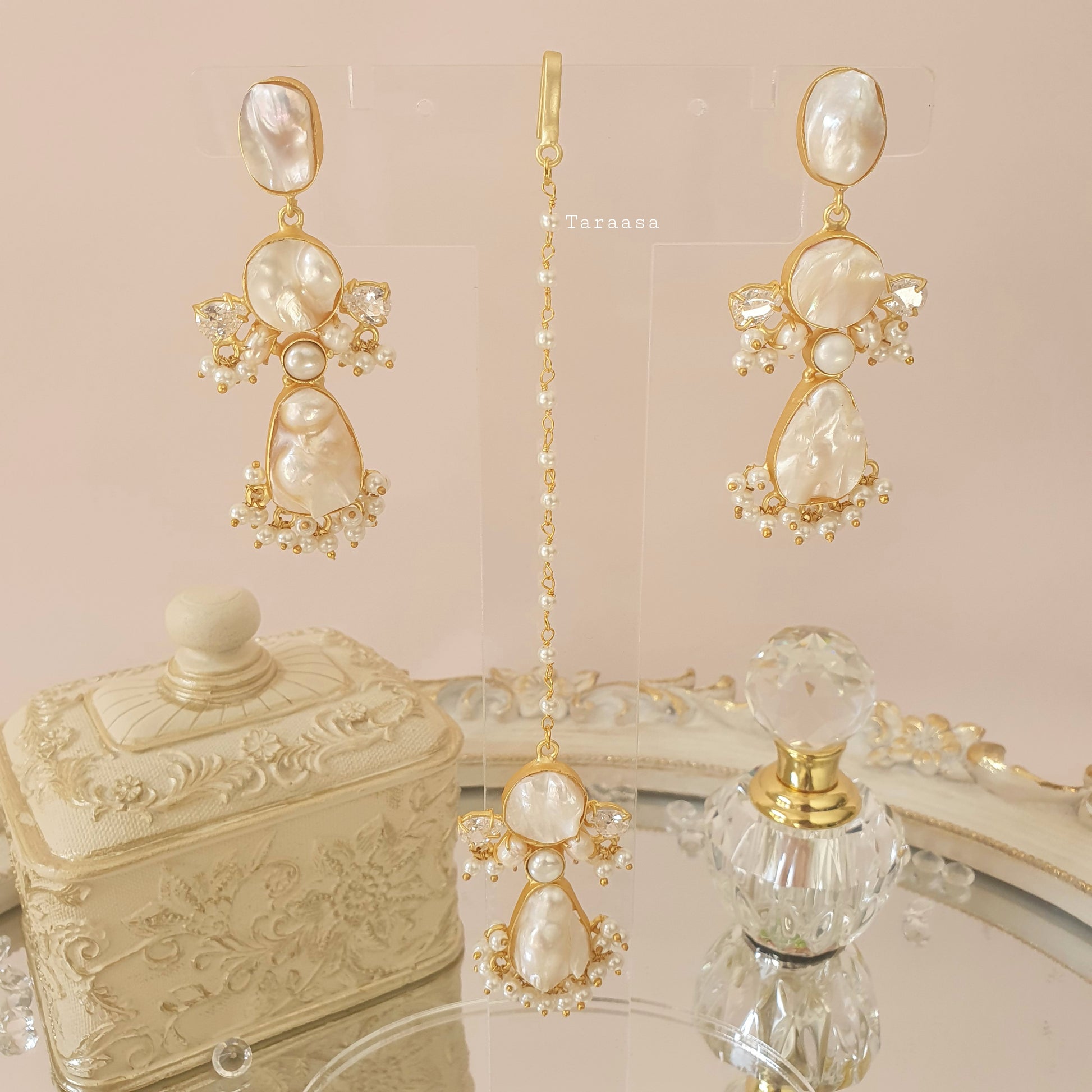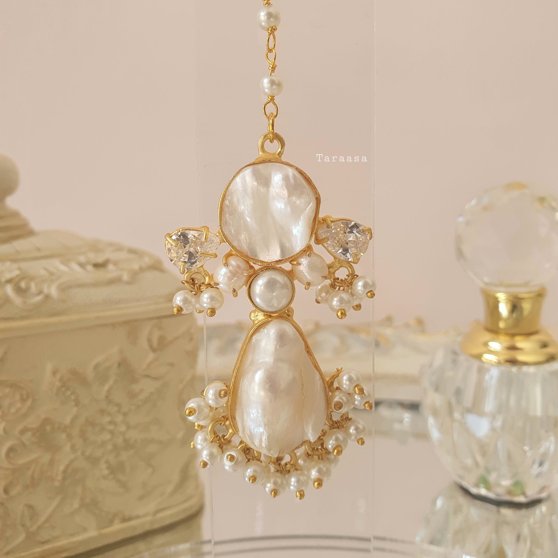 Elevate your ethnic ensemble with the timeless elegance of our Mother of Pearl Earring & Maang Tikka Set. Crafted with intricate detail of kundan stones and refined artistry, this set blends classic Eastern charm with a contemporary twist.
