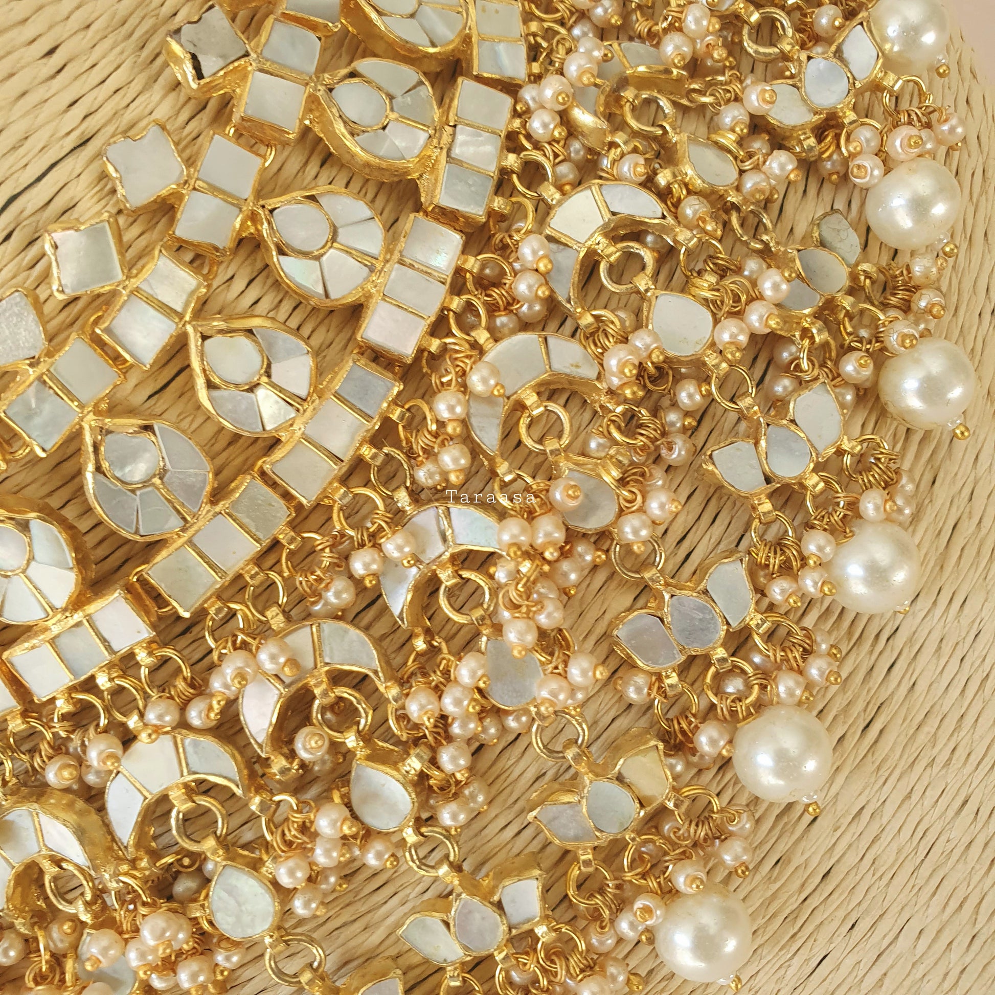 This extravagant bridal set is crafted in Mother of Pearl, set in gold and finished with hundreds of pearls for that extra touch of elegance.
