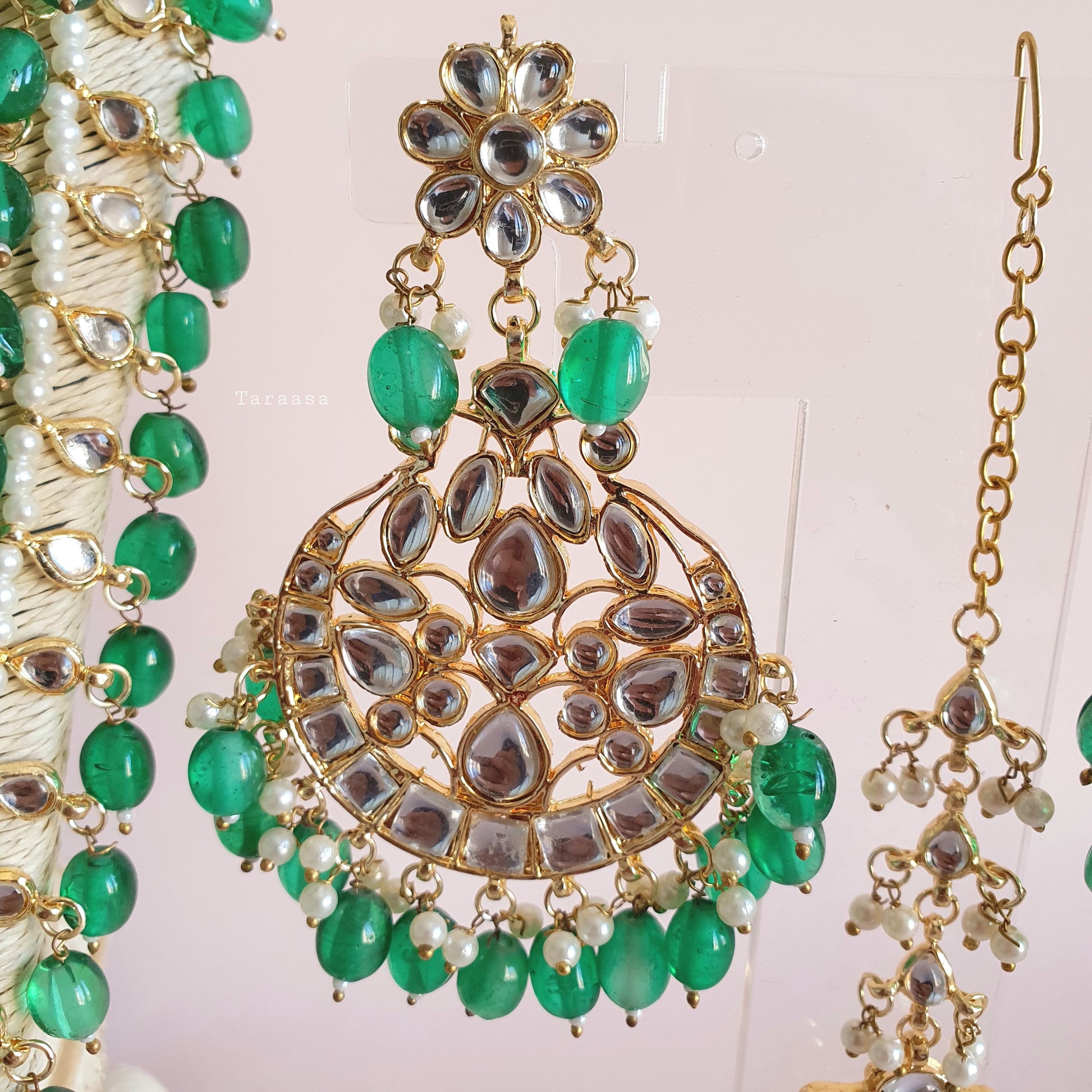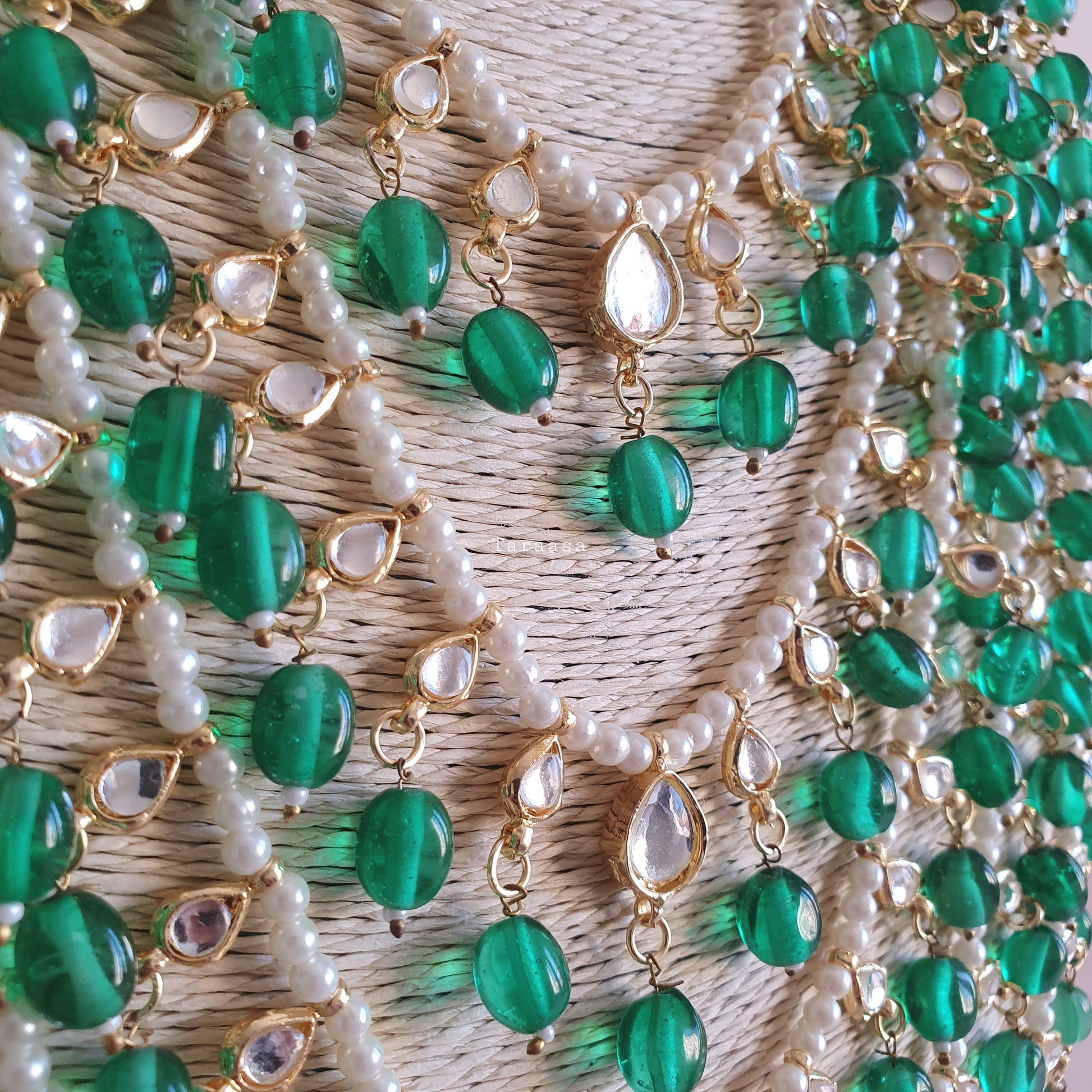 Our glamorous multi-layered green beaded Kundan haar set will elevate any look!