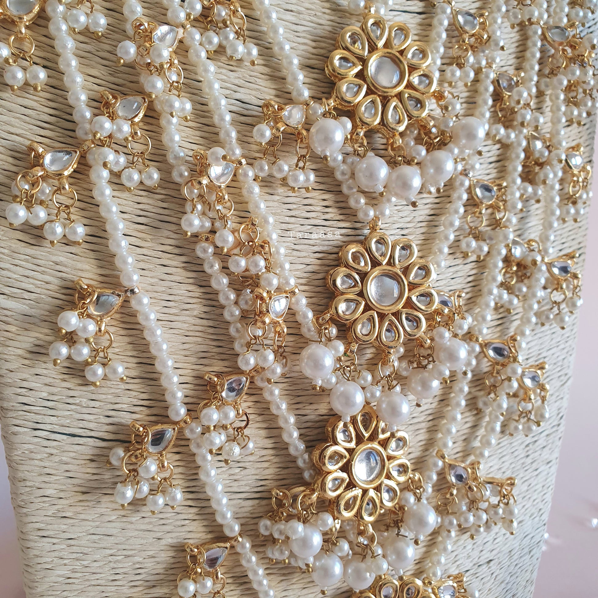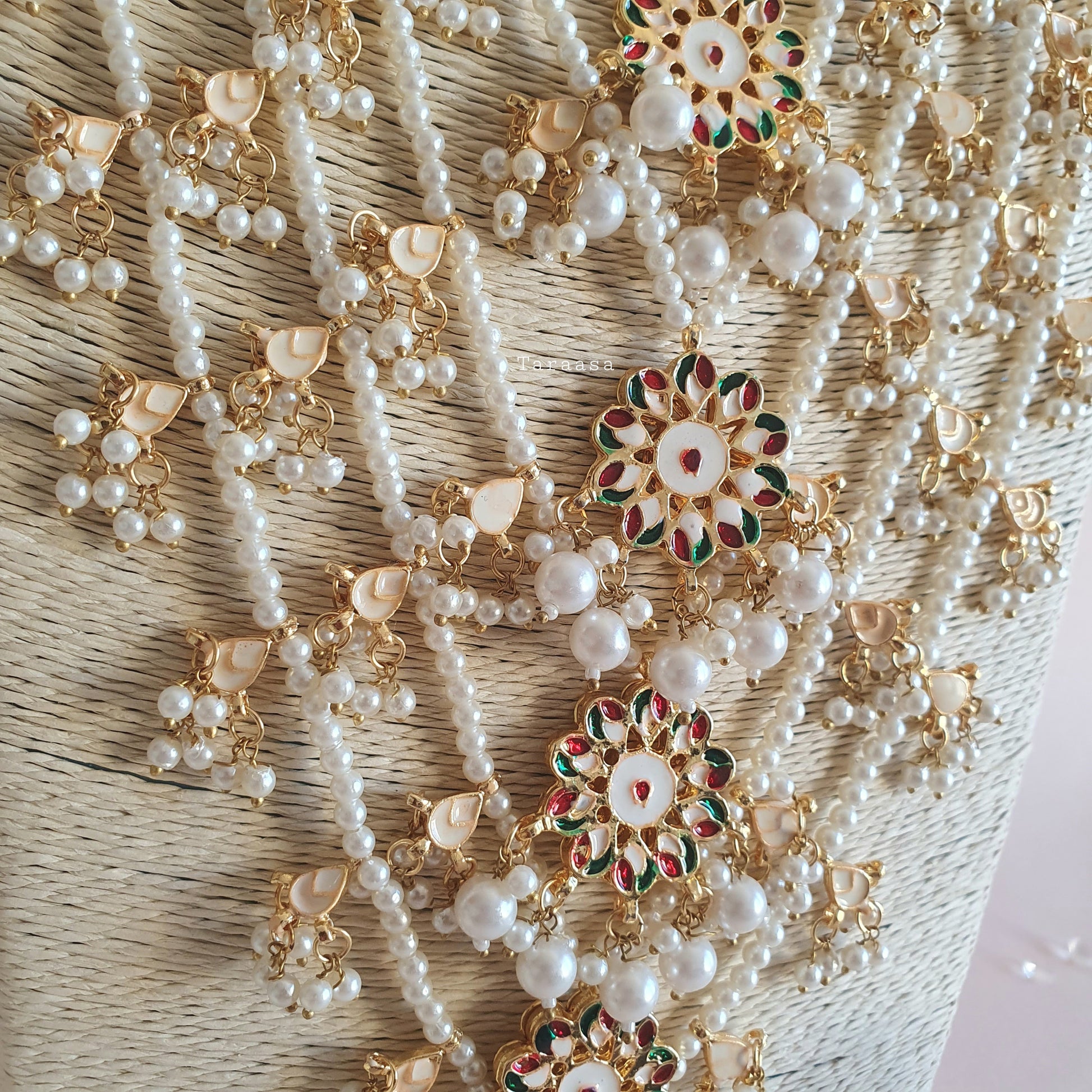 Our multi-layered pearl Haar is restrained elegance with a hint of old-world charm. Layers of pearls with drops of crystals wrapped in gold and a sprinkle of tiny pearls on the ends crafted to create a subtle yet glamorous look. Crystal florets in gold run down the centre tying the strings of pearls together. The reverse has drops of exquisite white meenakari with a touch of red and green on the florets, if you desire a more traditional look. Perfect for the Bride, the Groom or the Guest!