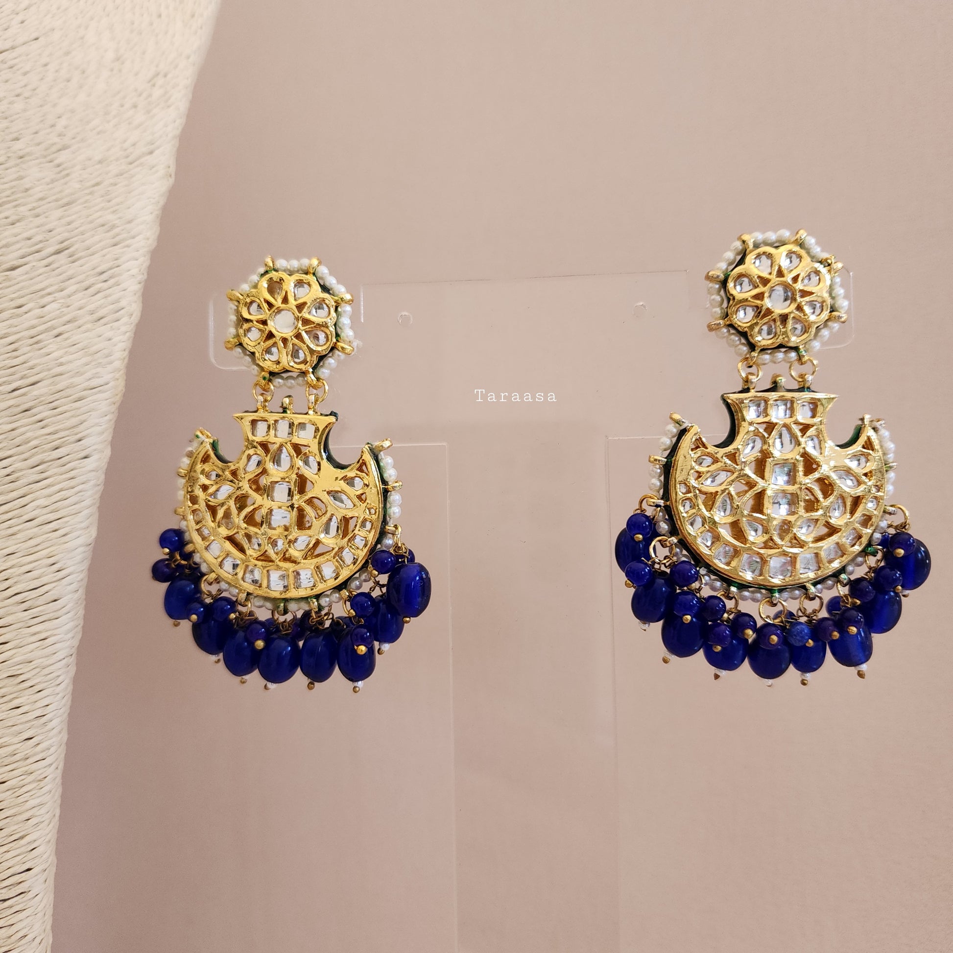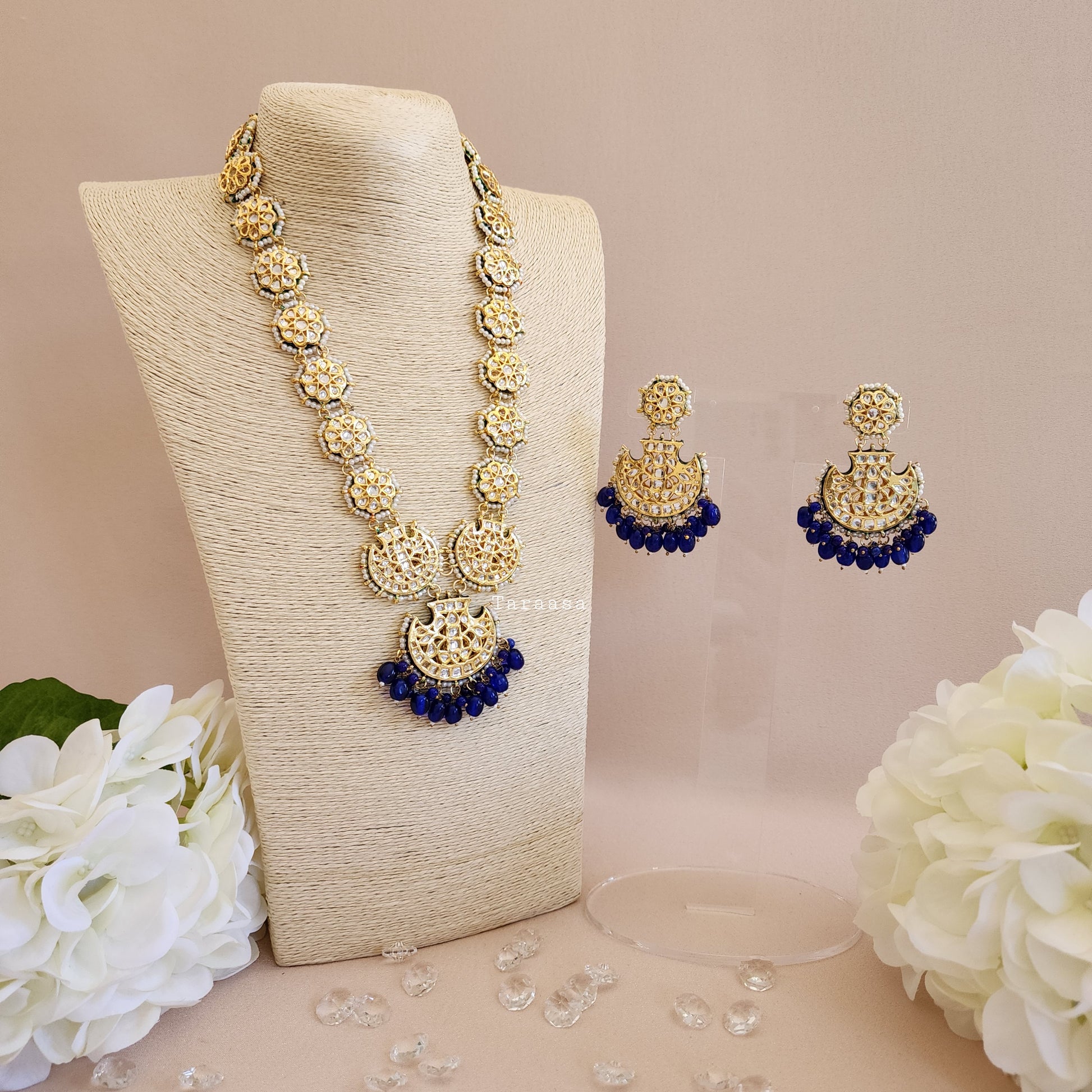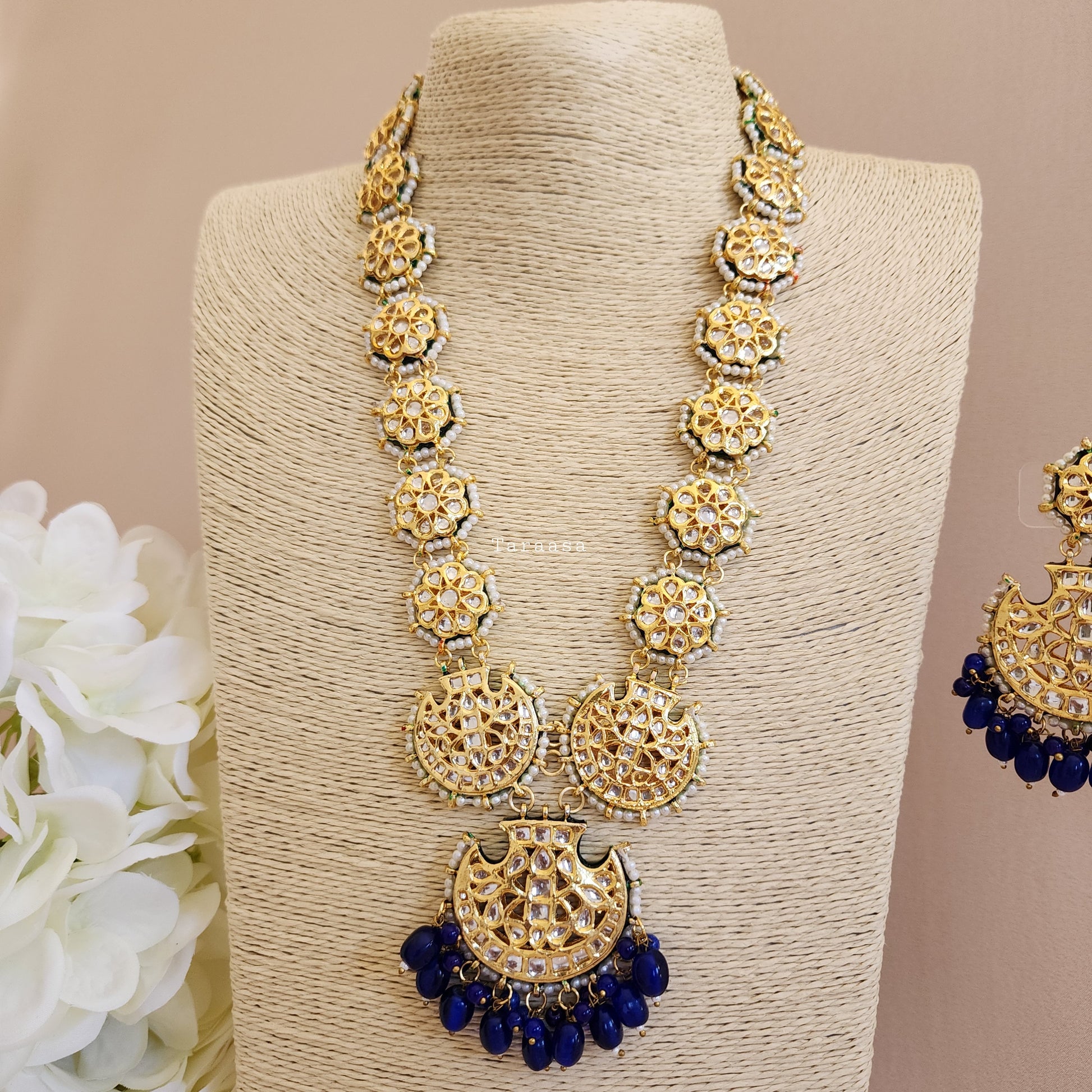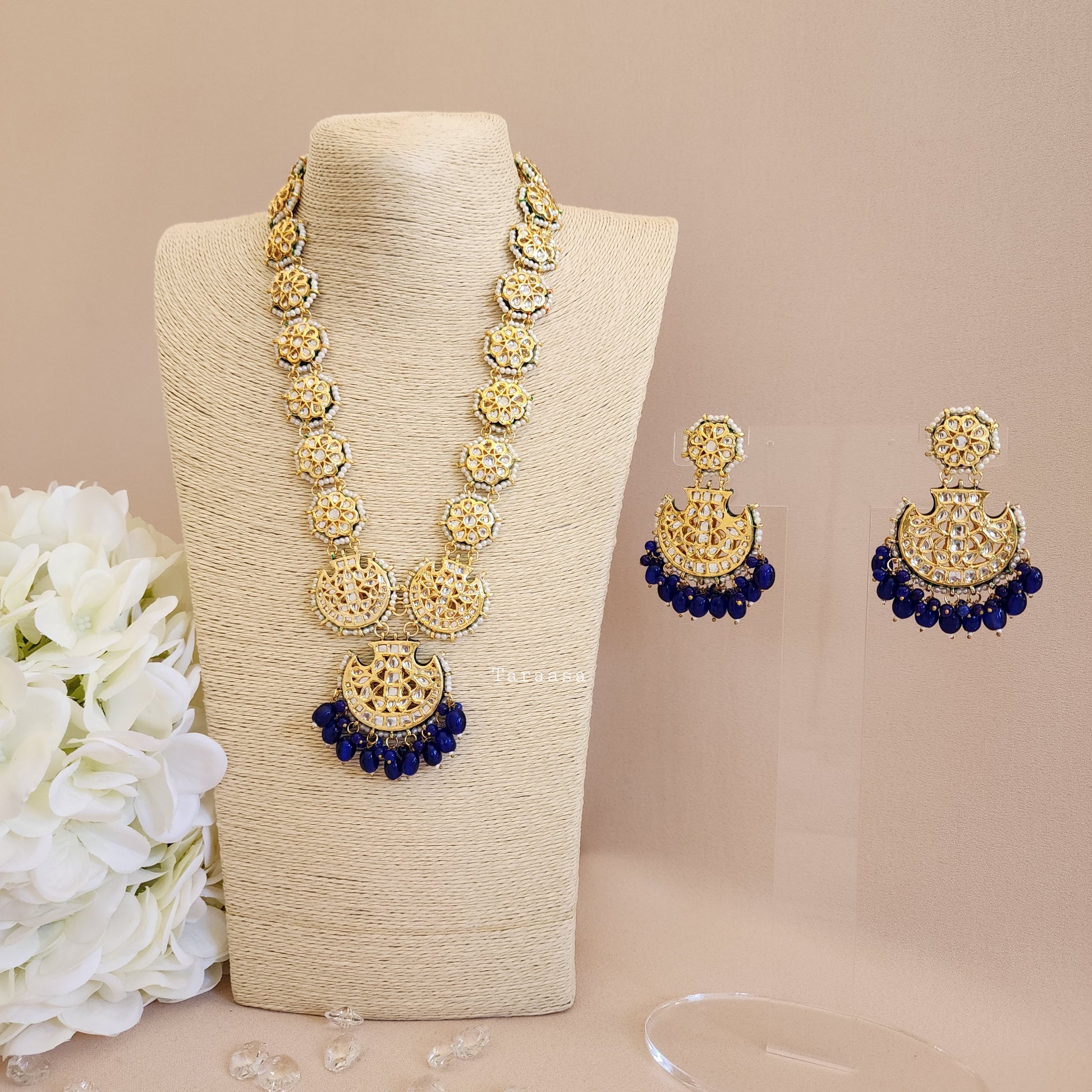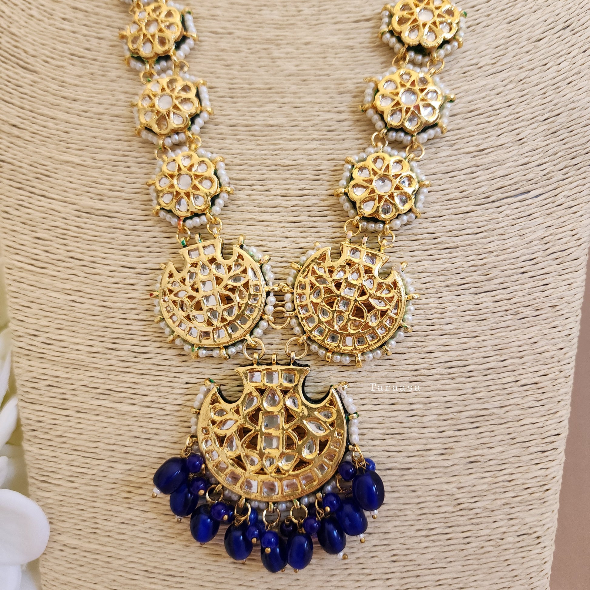 Simple but stunning, our kundan haar has kundan stones set in rich gold and intricately edged in dark green enamel. Each kundan piece is surrounded by pearls and drops of vibrant navy beads complete this set.